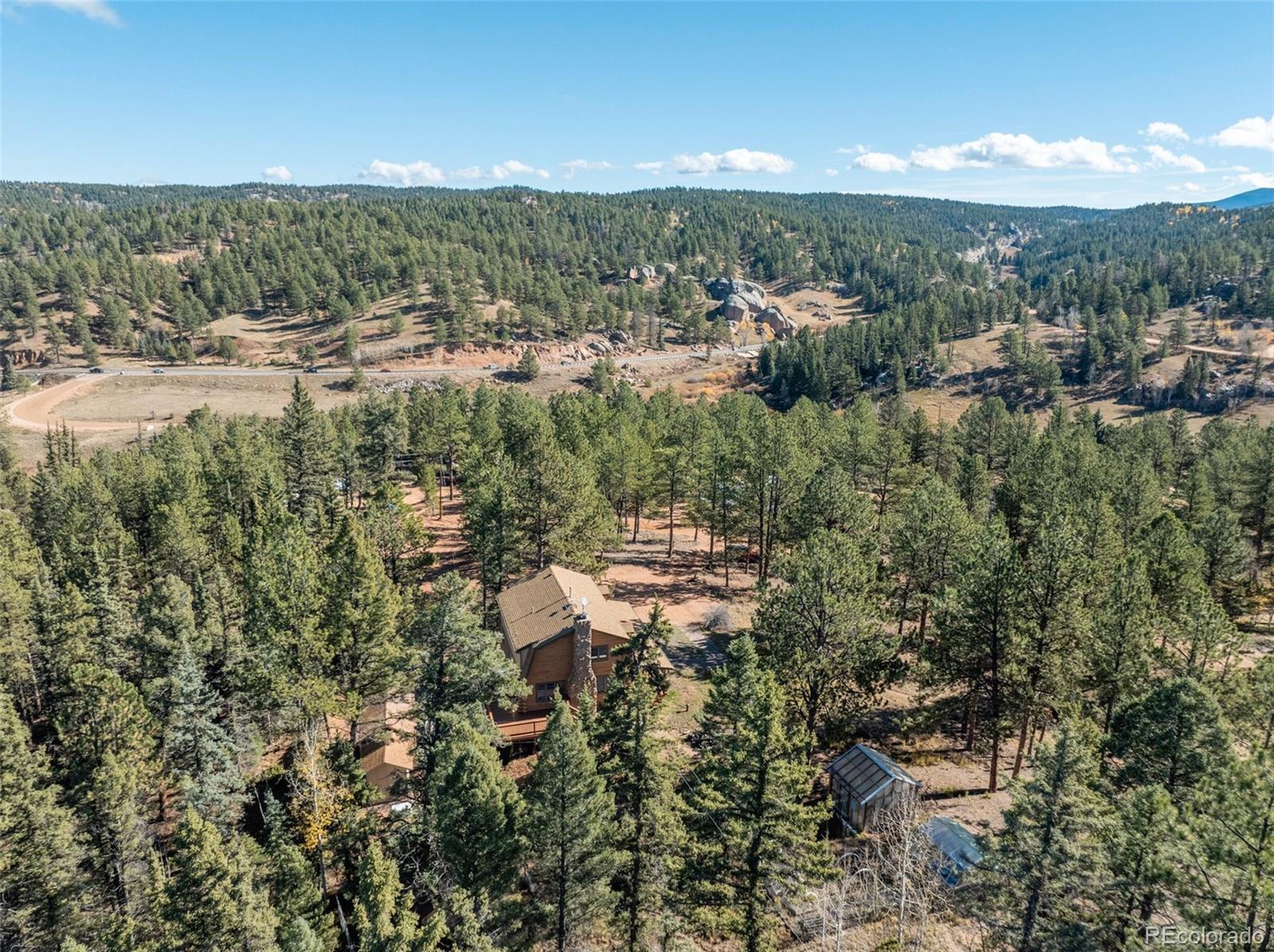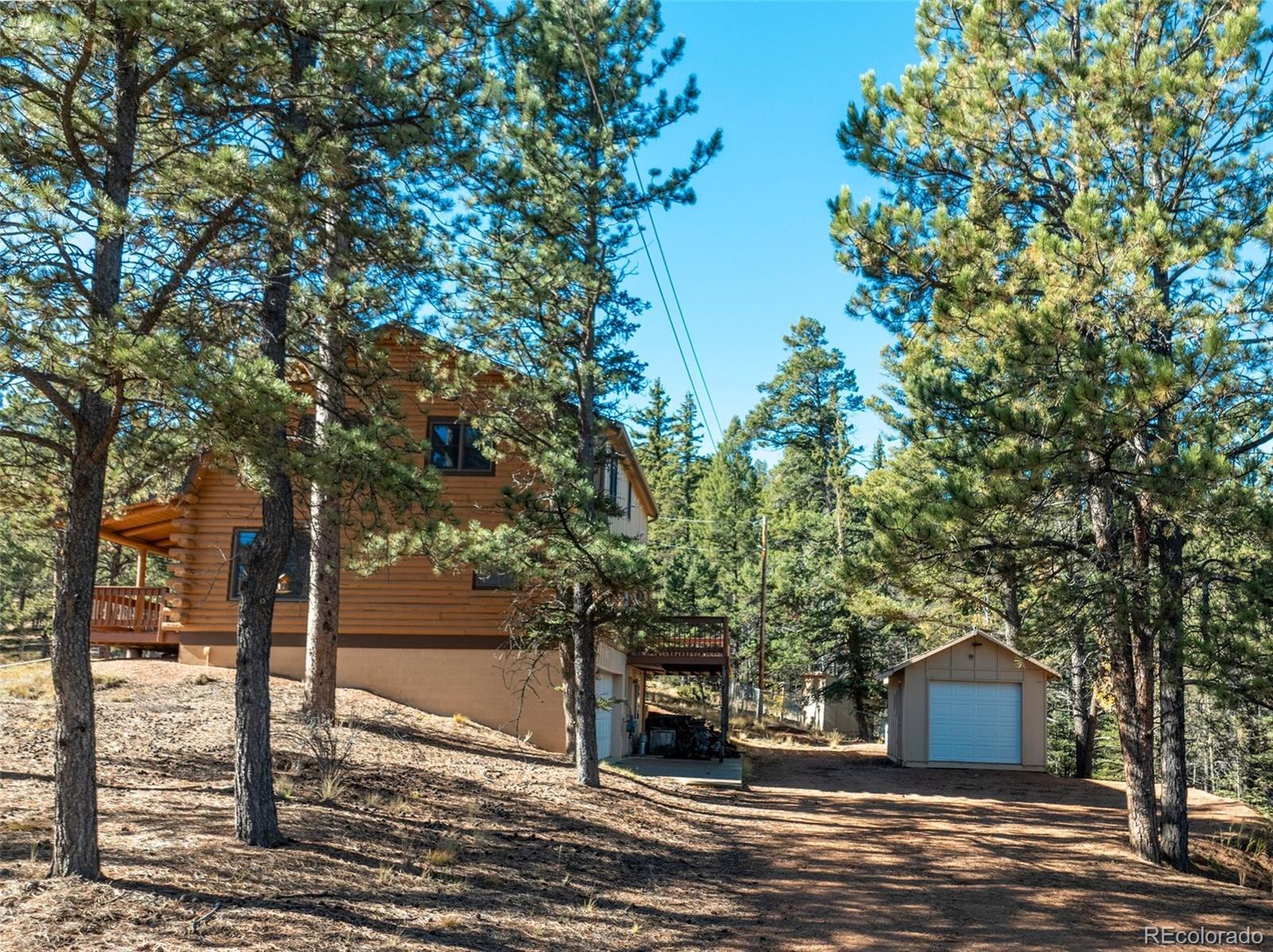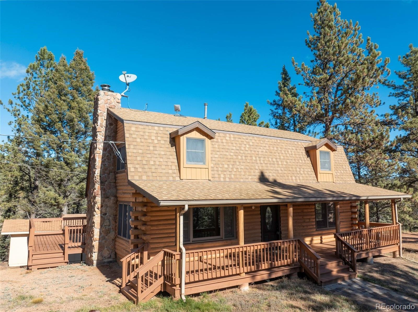 This true mountain getaway nestled in pines and aspens offers something for everyone! A welcoming covered deck and dormered windows invite you into this full log home on 3.24 acres in Druid Hills. Sparkling clean. NEW: carpet, LVT, interior paint, exterior trim paint. Enter the main level into a huge living room that invites you to relax by the stone wood-burning fireplace flanked by windows. Stroll out the sliding doors to the back deck to catch a glimpse of resting deer. A rarely found large dining room is lit by a beautiful antler chandelier. The roomy kitchen will delight any cook with ample counter space, breakfast bar, new gas range, newer dishwasher, refinished oak cabinets, refrigerator, microwave & trash compactor. The entire main level features knotty pine tongue & groove ceilings with wood beam accents. Upstairs bedrooms include: 16x16 master bedroom with two walk-in closets, an attached three-quarter bath & laundry; two more roomy bedrooms with spacious closets, a full bath & linen closet. A second attic furnace is dedicated to the 2nd floor for better heat control. The private lower level, walk-out family room with a cozy wood stove can function as a home office, work out studio, game room, or media room. The oversized one-car garage includes workbenches, refrigerator, freezer, storage & room for toys. Find more storage in the 288 sq ft shed with lights, electricity, shelves and overhead door. The 30x30 dog kennel enclosed with chain link fence has insulated, heated doghouse, electricity & lighting. 17KW natural gas auto transfer WHOLE HOUSE GENERATOR was professionally installed in 2015. New roof in 2015. Septic pumped June 2025. Stove & fireplace cleaned September 2025. Starlink satellite included. 2 greenhouses with power & heat. Lots of parking. Horses are welcome! ADJACENT LOTS FOR SALE: MLS 8747532 (209 Stonehenge, 2.86 Acres) with 1536 SF Workshop, and MLS 2325045 Vacant Lot (205 Stonehenge, 2.5 Acres) for total of 8.60 acres. Virtually Staged.