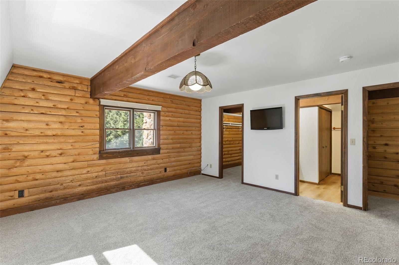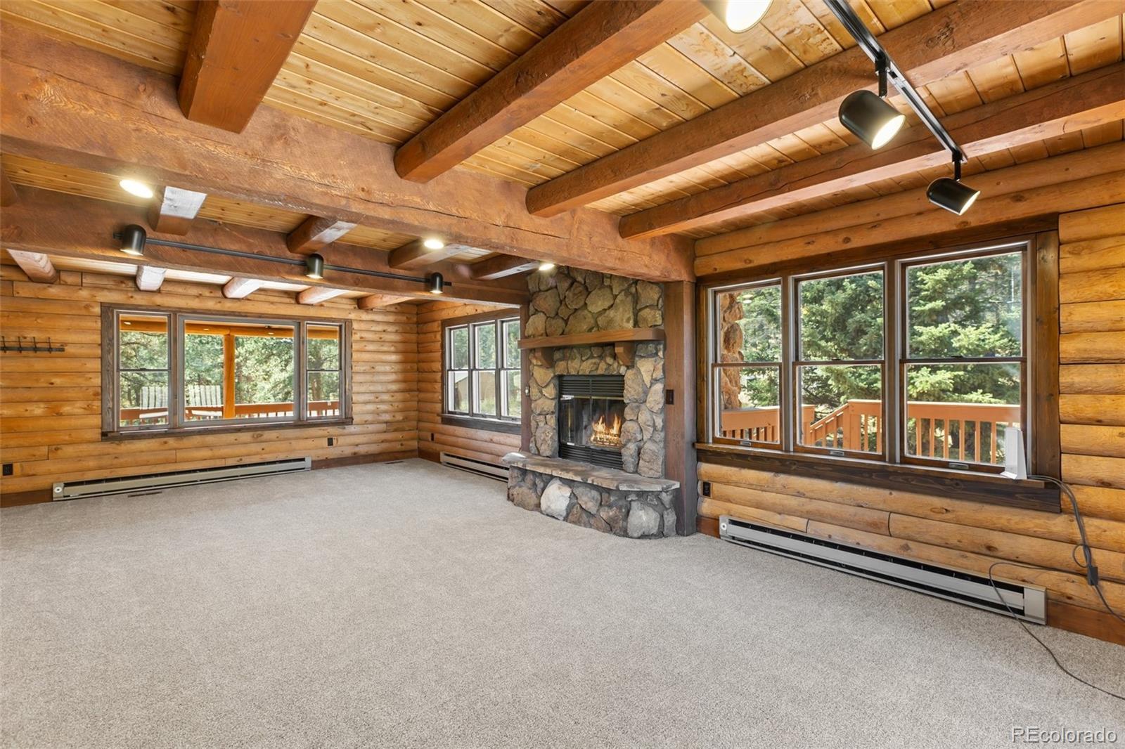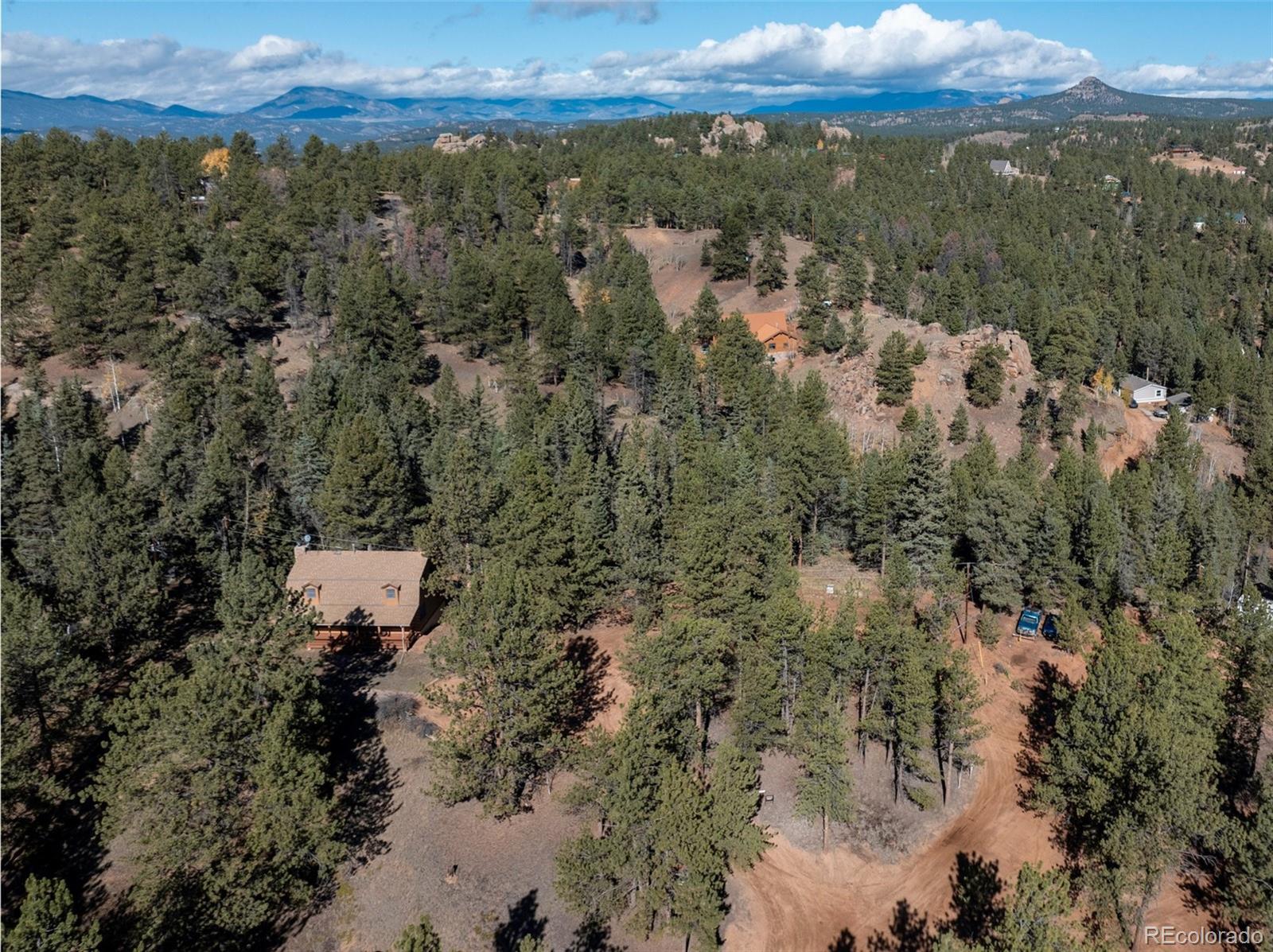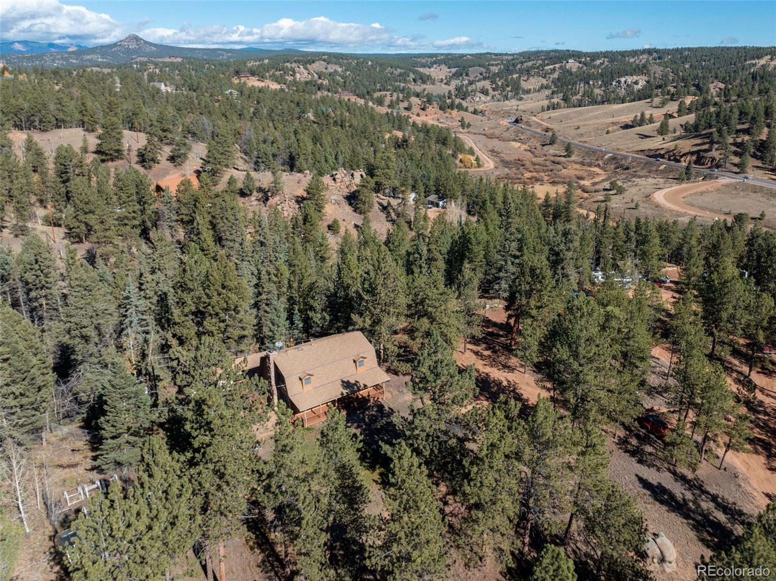 This true mountain getaway nestled in pines and aspens offers something for everyone! A welcoming covered deck and dormered windows invite you into this full log home on 3.24 acres in Druid Hills. Sparkling clean. NEW: carpet, LVT, interior paint, exterior trim paint. Enter the main level into a huge living room that invites you to relax by the stone wood-burning fireplace flanked by windows. Stroll out the sliding doors to the back deck to catch a glimpse of resting deer. A rarely found large dining room is lit by a beautiful antler chandelier. The roomy kitchen will delight any cook with ample counter space, breakfast bar, new gas range, newer dishwasher, refinished oak cabinets, refrigerator, microwave & trash compactor. The entire main level features knotty pine tongue & groove ceilings with wood beam accents. Upstairs bedrooms include: 16x16 master bedroom with two walk-in closets, an attached three-quarter bath & laundry; two more roomy bedrooms with spacious closets, a full bath & linen closet. A second attic furnace is dedicated to the 2nd floor for better heat control. The private lower level, walk-out family room with a cozy wood stove can function as a home office, work out studio, game room, or media room. The oversized one-car garage includes workbenches, refrigerator, freezer, storage & room for toys. Find more storage in the 288 sq ft shed with lights, electricity, shelves and overhead door. The 30x30 dog kennel enclosed with chain link fence has insulated, heated doghouse, electricity & lighting. 17KW natural gas auto transfer WHOLE HOUSE GENERATOR was professionally installed in 2015. New roof in 2015. Septic pumped June 2025. Stove & fireplace cleaned September 2025. Starlink satellite included. 2 greenhouses with power & heat. Lots of parking. Horses are welcome! ADJACENT LOTS FOR SALE: MLS 8747532 (209 Stonehenge, 2.86 Acres) with 1536 SF Workshop, and MLS 2325045 Vacant Lot (205 Stonehenge, 2.5 Acres) for total of 8.60 acres. Virtually Staged.