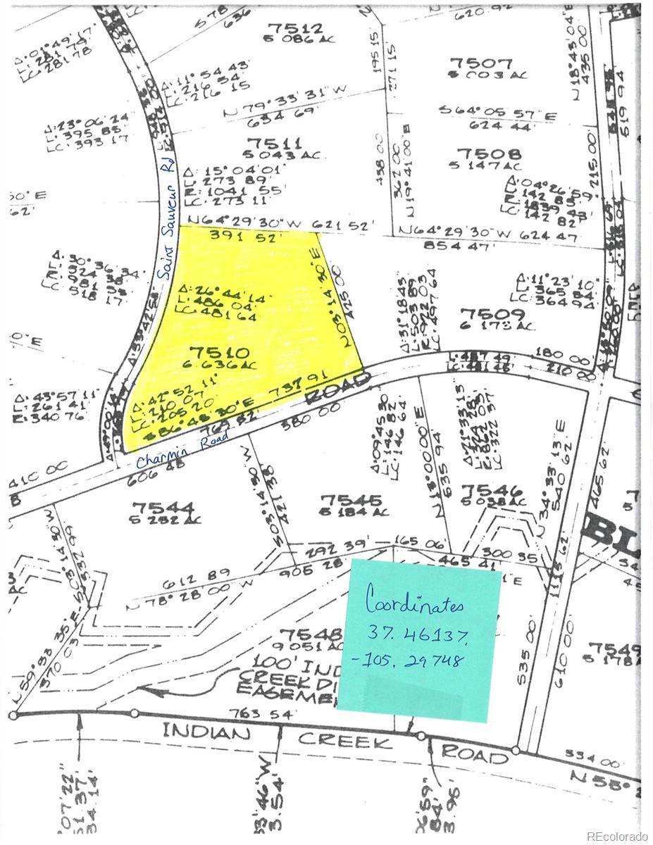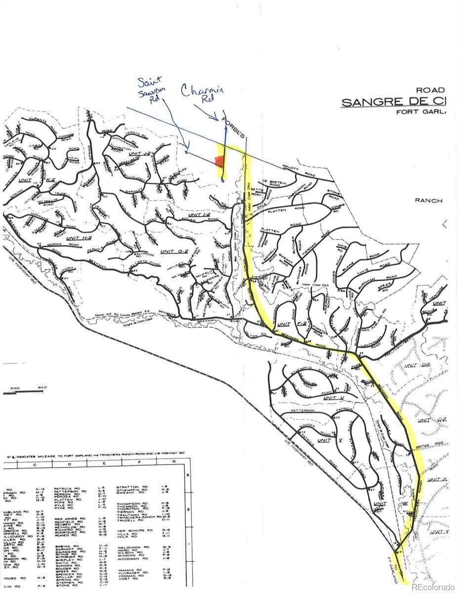 Enjoy your own piece of the Rocky's! This 6.636 acres of land offers a mix f sage and pinon Pin. There is an older driveway onsite, but hasn't been used in a while. The property rest on the corner of Charmin and Saint Sauveur Rd with a walkable hill meandering towards towards the north side of the property. Property is within close distance of Oso Creek and Indian Creek which offer a lot of wildlife viewing! Located in the residentially zoned subdivision of the Sangre de Cristo Ranches resting along the Sangre de Cristo mountain range! Enjoy camping and peaceful retreats or develop your mountain retreat!