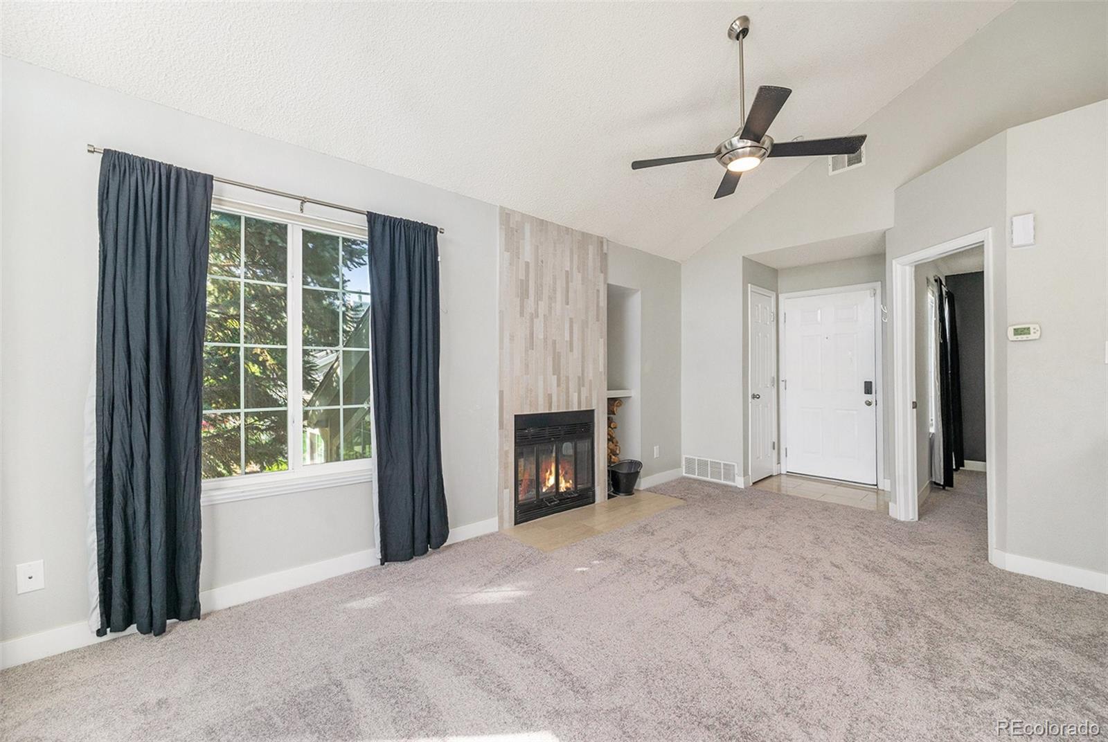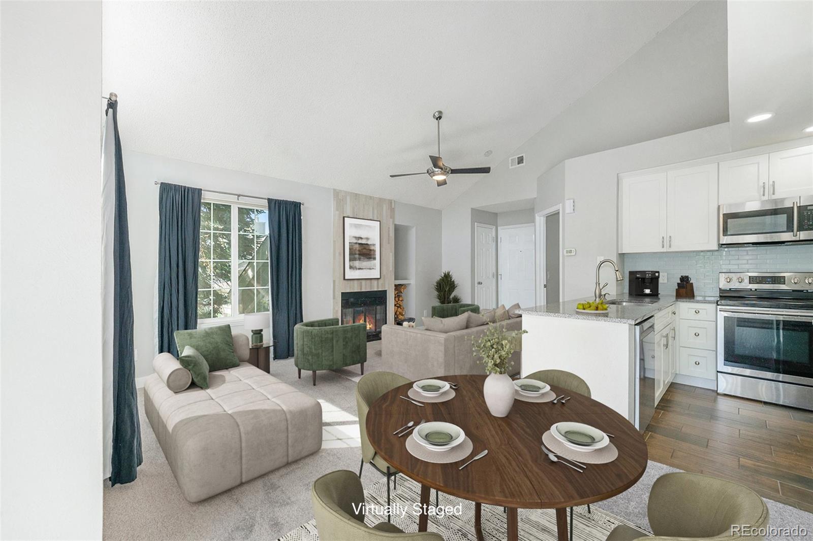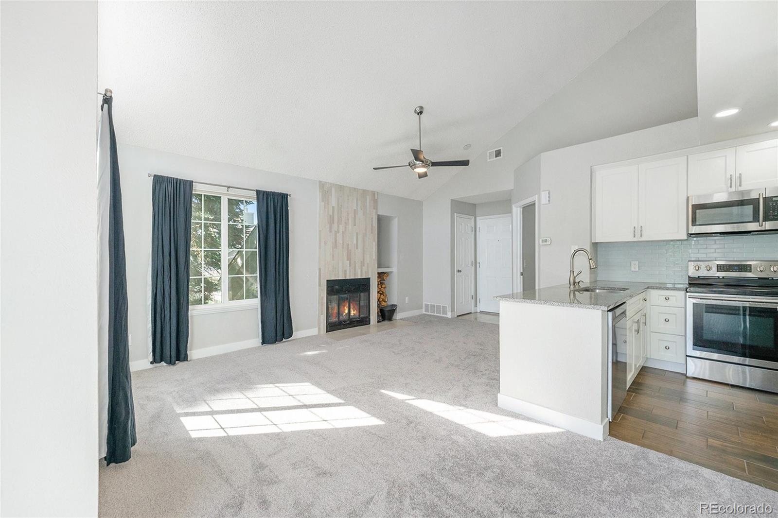 This light-filled 2-bedroom, 1-bath home offers an efficient 686 sq ft layout with soaring ceilings and expansive windows that flood the space with natural light. Enjoy brand-new carpet underfoot, a beautifully updated kitchen with granite countertops, stainless steel appliances, and fresh white cabinetry. The open-concept living area includes a cozy fireplace, vaulted ceilings, and a private balcony perfect for morning coffee. The spacious bathroom features modern tilework and sleek finishes. Additional perks include a newly installed dishwasher, upgraded lighting in the office, and an outdoor storage closet for added convenience. Located in a well-maintained community with a pool and lush green spaces, and just minutes from Cherry Creek State Park, I-225, and Light Rail. Ideal for first-time buyers, investors, or those seeking a low-maintenance lifestyle in a central location!