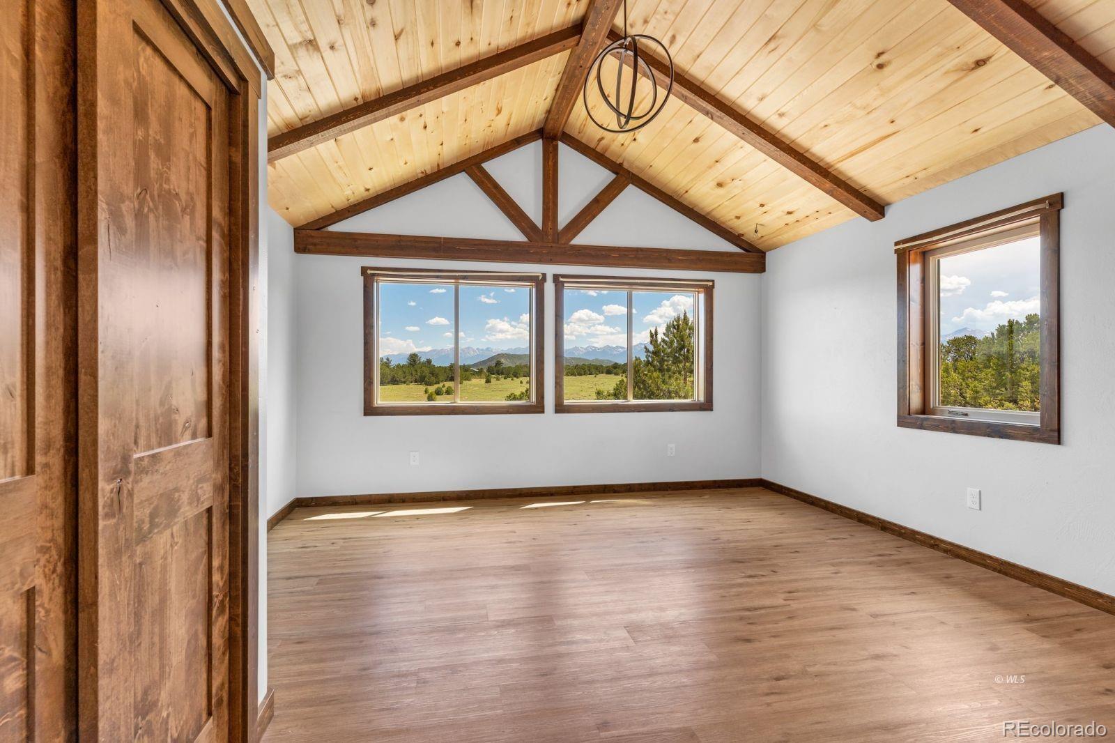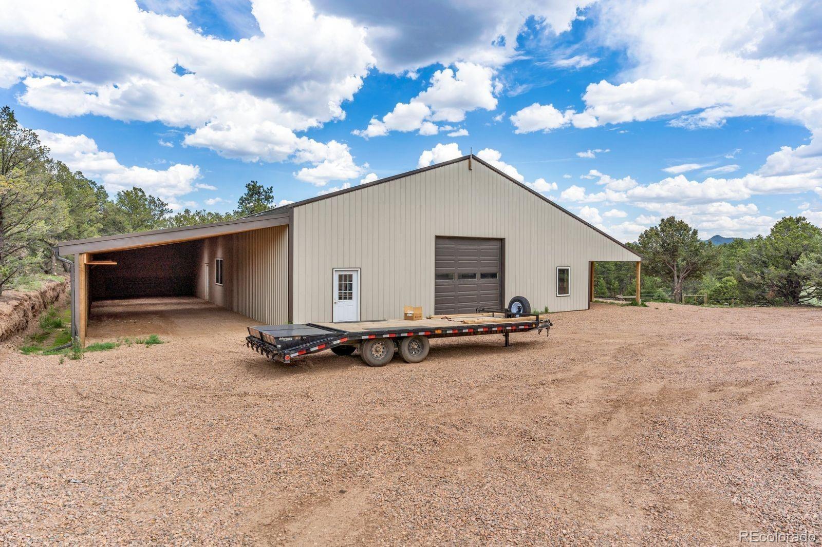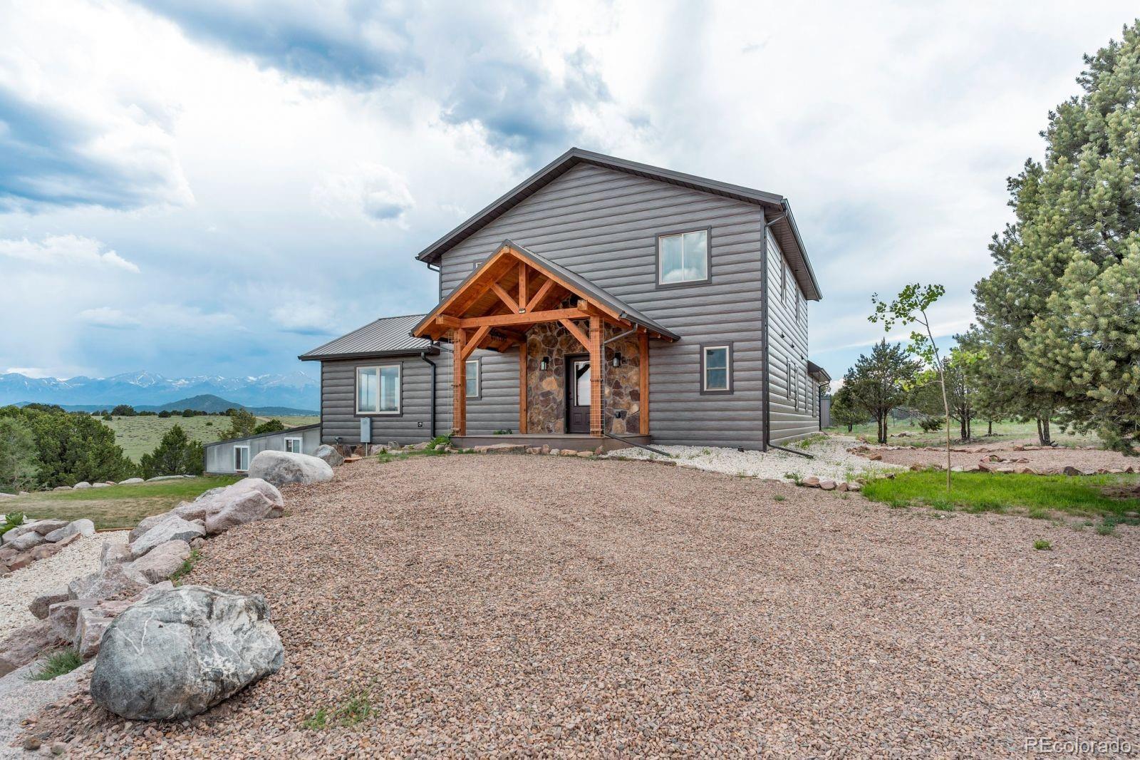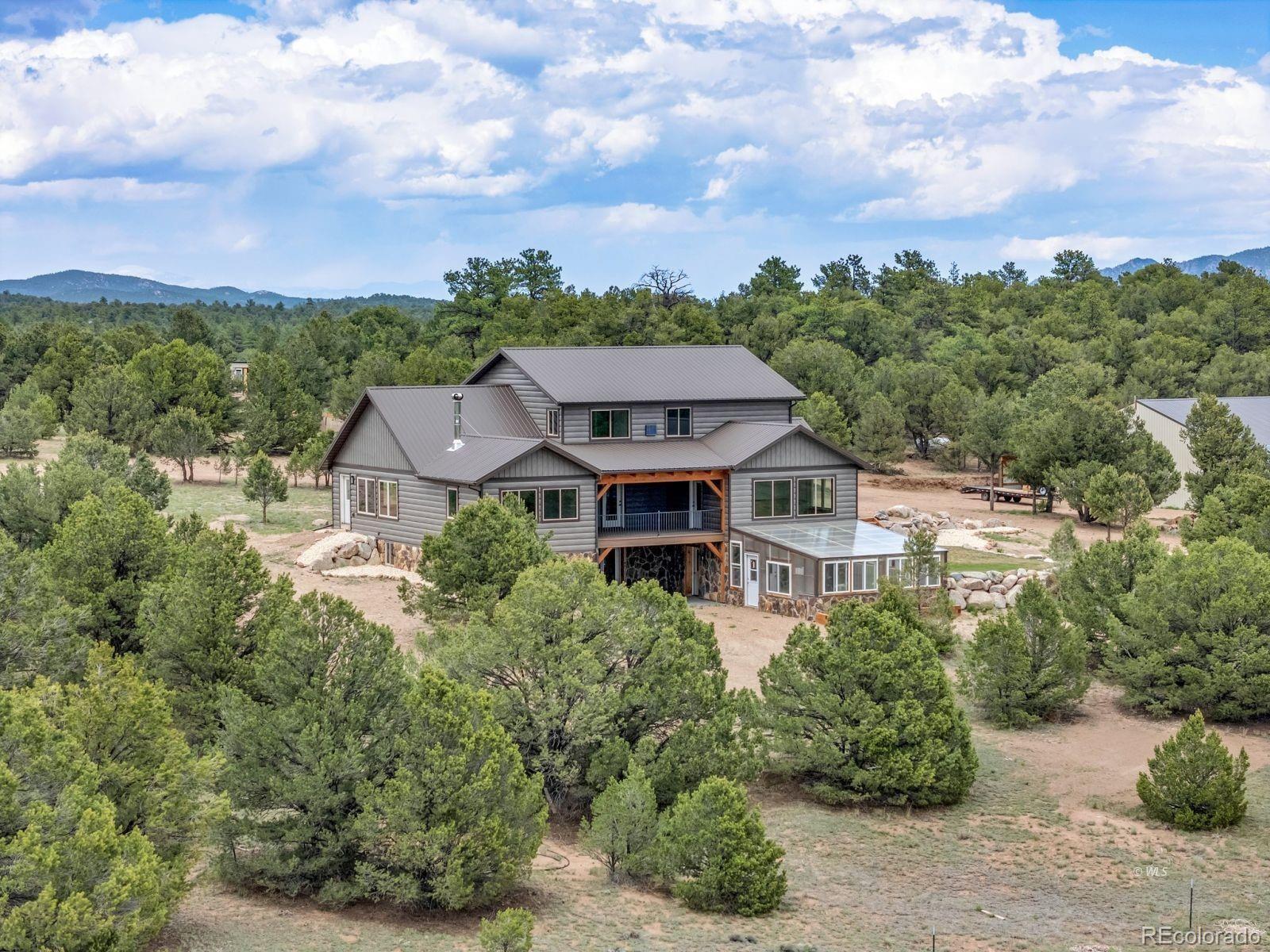 VERSATILE 35-ACRE RETREAT -- VIEWS, OUTBUILDINGS AND GREENHOUSE: Nestled between the Wet Mountains and the Sangre de Cristos, this beautifully crafted Amish home offers comfort, space, and unbeatable views! With four bedrooms and 3.5 baths, the home features wood floors, a study, and a main-level primary suite with an ensuite bath. Enjoy entertaining on the large, covered upper deck or the lower walk-out deck-perfect for gatherings with stunning mountain backdrops. The spacious kitchen opens to a generous mudroom and laundry area with an oversized pantry. A full, unfinished basement with a separate kitchen adds flexibility for guests or events. Stay cozy year-round with two woodburning stoves and a vented propane wall heater. The property includes a 420 sq. ft. attached greenhouse, a 4,280 sq. ft. heated pole barn with a concrete floor and hay sheds, plus five additional outbuildings. Set on 35.2 fenced and treed acres, this home blends rustic charm with modern amenities-ready for your next chapter! Ideal for multi-generational living, hobby farming, or entertaining, this property offers space, comfort, and self-sufficiency in a breathtaking mountain setting.