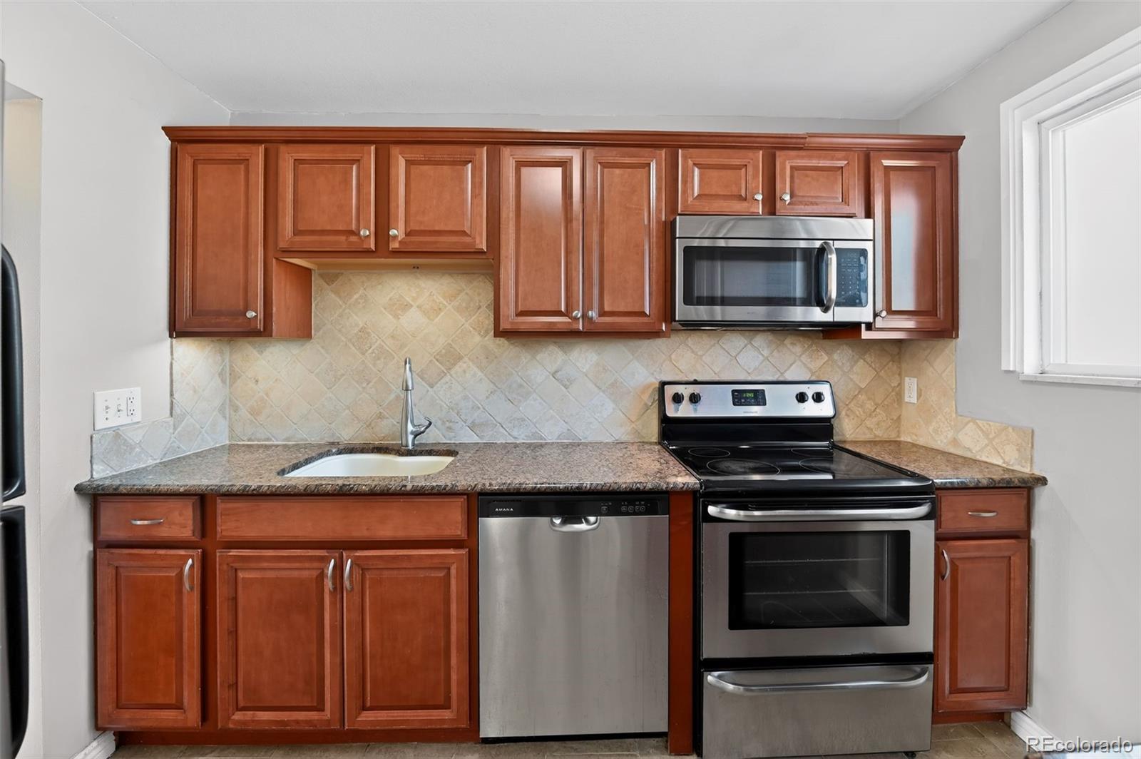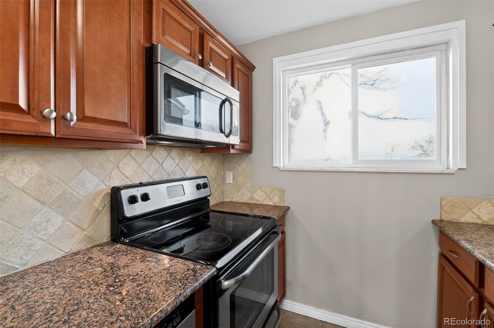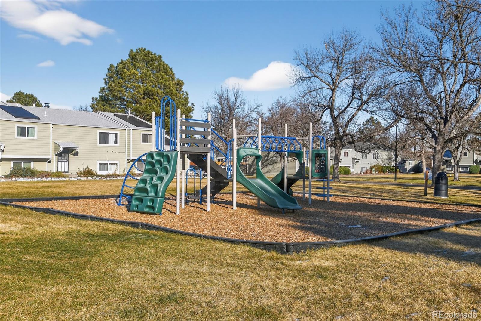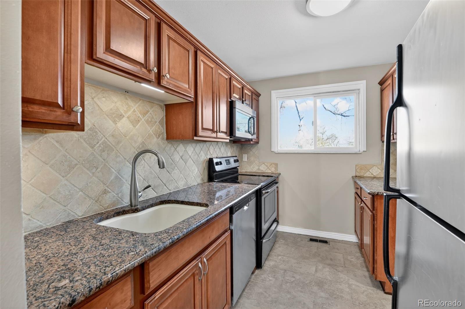 This well-appointed tri-level condo in Madison Hill offers one of the community’s most desirable locations, with the front door opening directly onto a large park and playground. The lush green space is visible through the front glass security door, creating a welcoming first impression. Just steps away, enjoy exceptional walkability to shopping, dining, and entertainment, including the new Westminster City Center across the street, featuring multiple restaurants, a cinema, and a bowling alley. The main level includes the front entry, kitchen, spacious living area, and access to the rear patio through a sliding door. The kitchen is thoughtfully designed with solid maple cabinets featuring crown molding and soft-close hardware, a built-in trash container, granite countertops, a custom travertine backsplash, a composite granite sink, stainless steel appliances, and a custom porcelain tile floor. The living area is finished with engineered maple hardwood flooring, creating a warm and inviting space. Upstairs, you’ll find two bedrooms, a full bathroom, and two additional hall closets providing ample storage. The full bath is finished with custom travertine flooring, a porcelain tile tub/shower surround, granite countertop, and maple cabinetry. The lower level offers a versatile open recreation room ideal for a TV room, playroom, or home office, along with a third bedroom featuring built-in shelving. This level also includes a laundry area with full-size washer and dryer, a ¾ bathroom, and durable large-format tile flooring throughout. Additional highlights include motion-sensor exterior lighting at both the front and rear of the home, enhancing convenience. Private patio for a BBQ and outdoor dining and watching the sun set into the Flatirons.