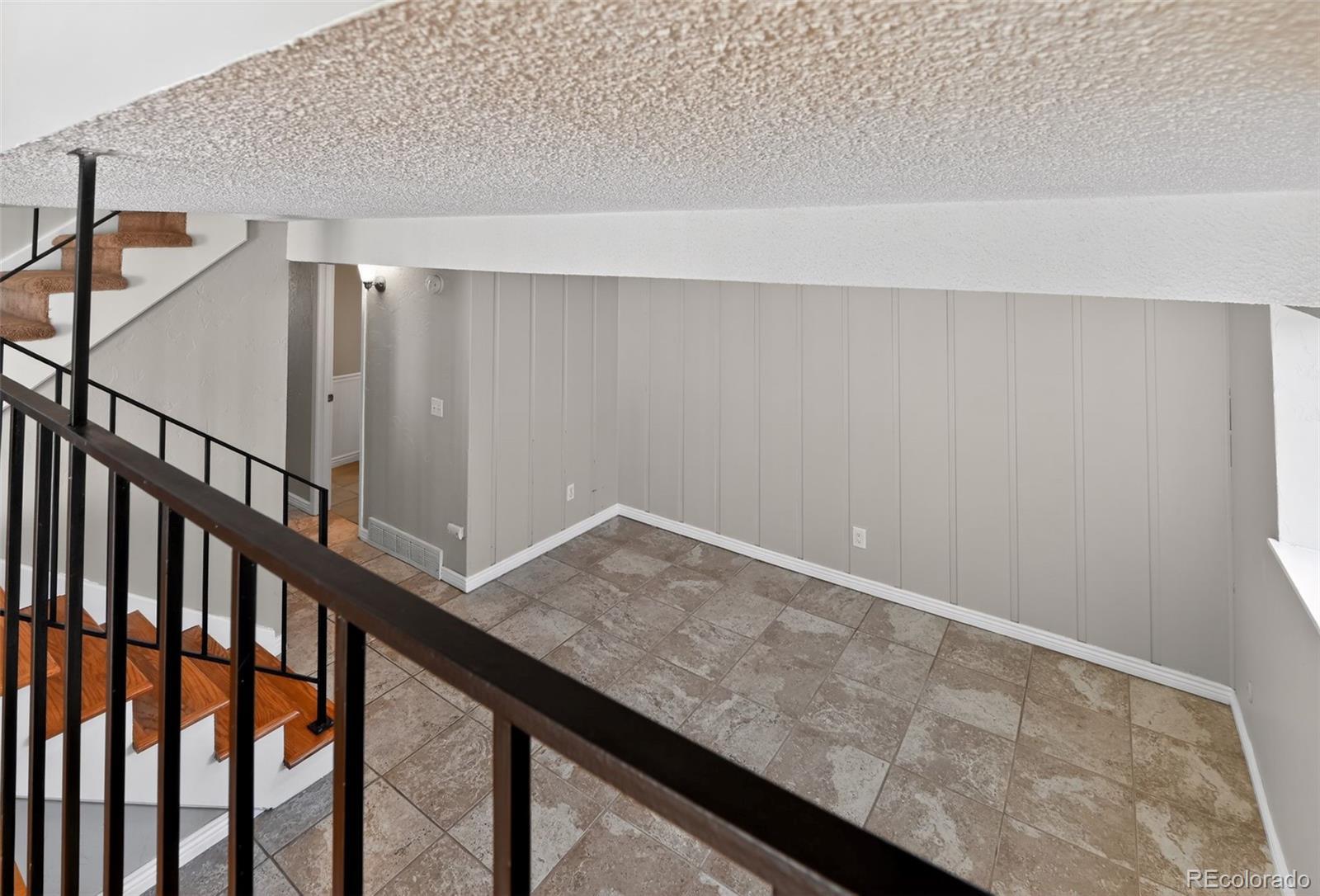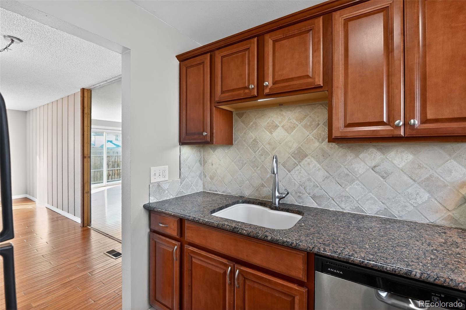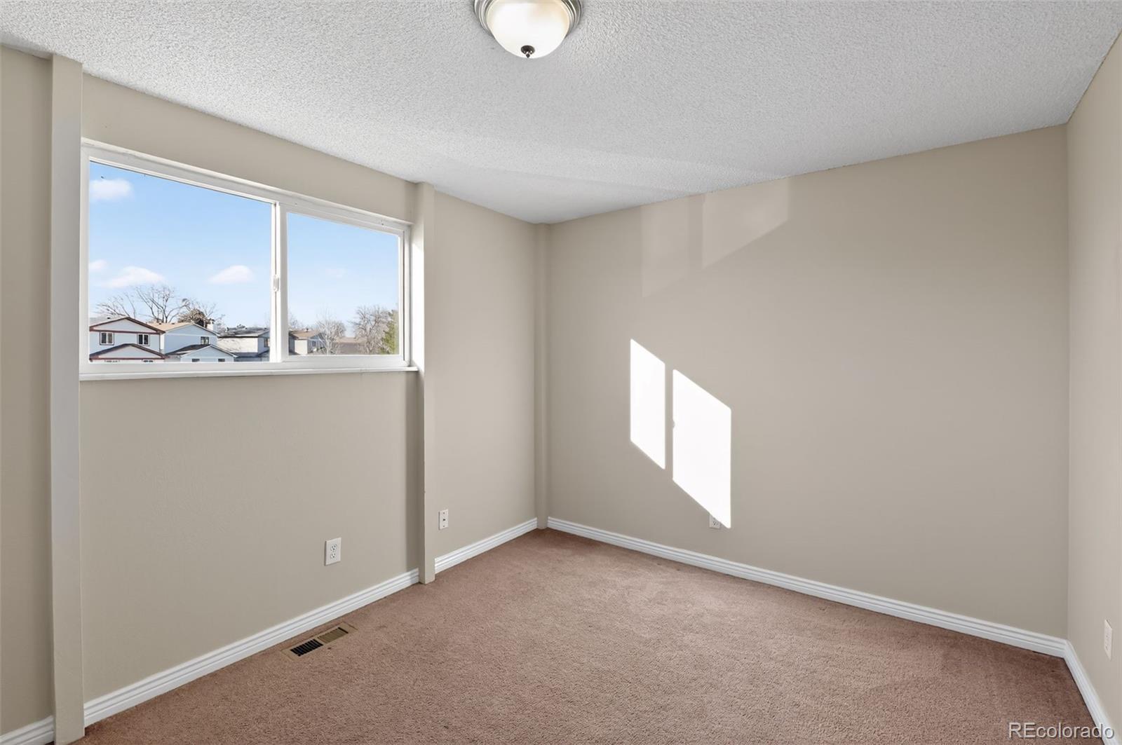 This well-appointed tri-level condo in Madison Hill offers one of the community’s most desirable locations, with the front door opening directly onto a large park and playground. The lush green space is visible through the front glass security door, creating a welcoming first impression. Just steps away, enjoy exceptional walkability to shopping, dining, and entertainment, including the new Westminster City Center across the street, featuring multiple restaurants, a cinema, and a bowling alley. The main level includes the front entry, kitchen, spacious living area, and access to the rear patio through a sliding door. The kitchen is thoughtfully designed with solid maple cabinets featuring crown molding and soft-close hardware, a built-in trash container, granite countertops, a custom travertine backsplash, a composite granite sink, stainless steel appliances, and a custom porcelain tile floor. The living area is finished with engineered maple hardwood flooring, creating a warm and inviting space. Upstairs, you’ll find two bedrooms, a full bathroom, and two additional hall closets providing ample storage. The full bath is finished with custom travertine flooring, a porcelain tile tub/shower surround, granite countertop, and maple cabinetry. The lower level offers a versatile open recreation room ideal for a TV room, playroom, or home office, along with a third bedroom featuring built-in shelving. This level also includes a laundry area with full-size washer and dryer, a ¾ bathroom, and durable large-format tile flooring throughout. Additional highlights include motion-sensor exterior lighting at both the front and rear of the home, enhancing convenience. Private patio for a BBQ and outdoor dining and watching the sun set into the Flatirons.