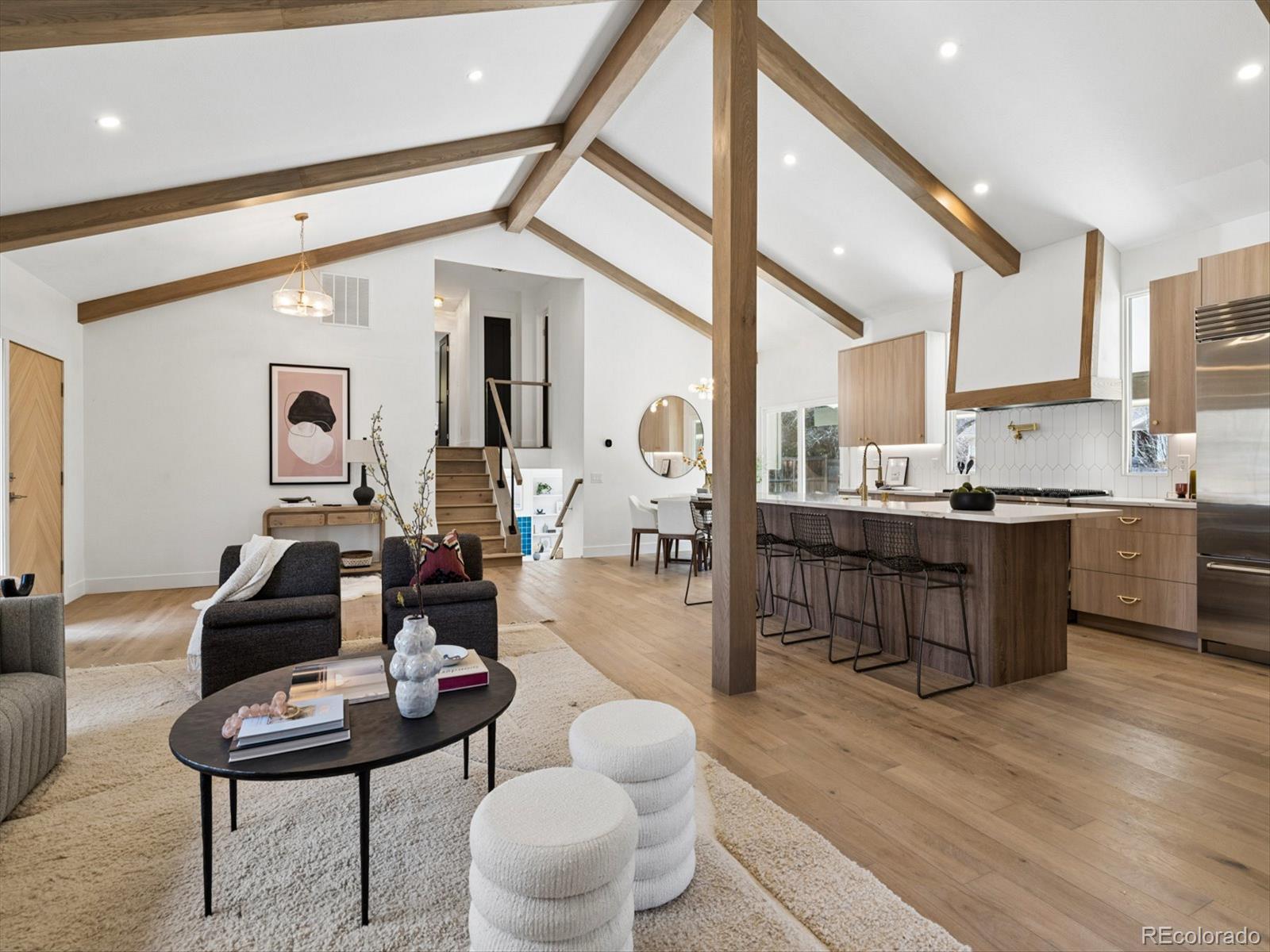 Set within the highly sought after Boulder Country club community, this fully renovated 4 bed, 4 Bath residence blends warm, refined elegance with a sophisticated contemporary aesthetic. From the moment you step inside, the open great room and Chef's kitchen make a striking impression with vaulted ceilings, custom wood beams, fireplace, and wide planked hardwoods throughout. Thoughtful design details elevates the space, including a charming window seat, and an expansive walk-in pantry, outfitted with an abundance of custom cabinetry, Quartz countertops, and a Miele Coffee Station! The heart of the home is the Chefs kitchen and adjacent eat-in dining area, designed for both everyday living and effortless entertaining. Anchored by the 48 inch double-oven gas range and a Sub Zero refrigerator, it features a custom built oversized hood, quartz countertops, and crafted cabinetry. An expansive islands seats 4-6, creating the perfect space for gathering family and guests. The primary suite is a true retreat anchored by a tranquil fireplace and charming window seat. A custom walk-in closet-thoughtfully designed with a stackable washer and dryer which adds an exceptional layer of convenience. The spa inspired bath is designed for the most discerning homeowner. Unwind in the soaking tub or enjoy the oversized shower adorned with custom-organic inspired tile and dual shower heads. The bidet/toilet provides virtually every modern feature imaginable. The lower Garden level is ideal for entertaining with a wood burning fireplace, built ins, and a stylish wet bar complete with a wine refrigerator. The Basement level further expands offering an additional living area, with private bedroom, new 1/2 bath. The systems have all been updated, including a high efficiency electric furnace w/heat pump and central air conditioning, a tankless water heater, and a new roof, providing both peace of mind and energy efficiency. The private backyard and patio are great for entertaining.