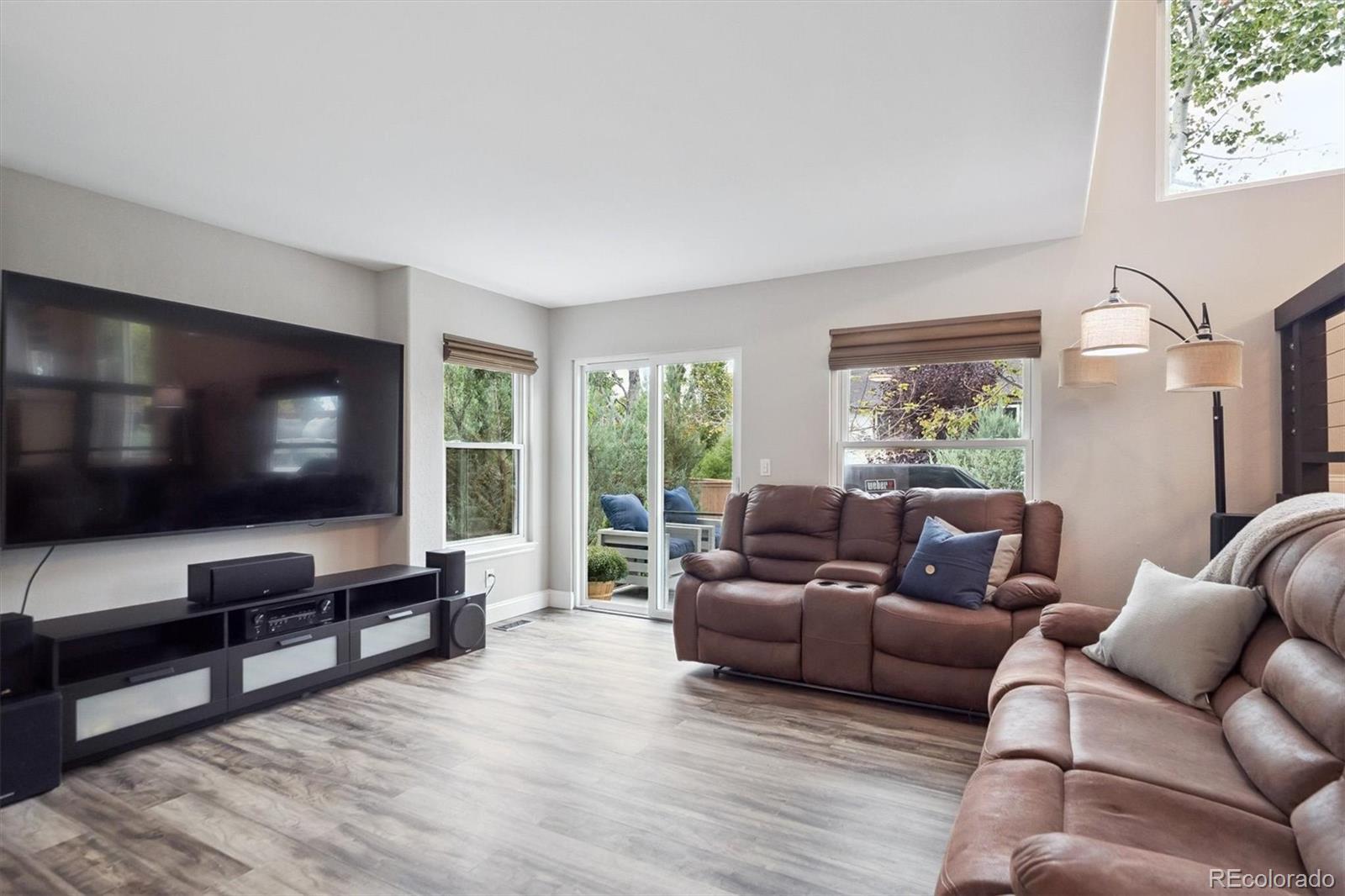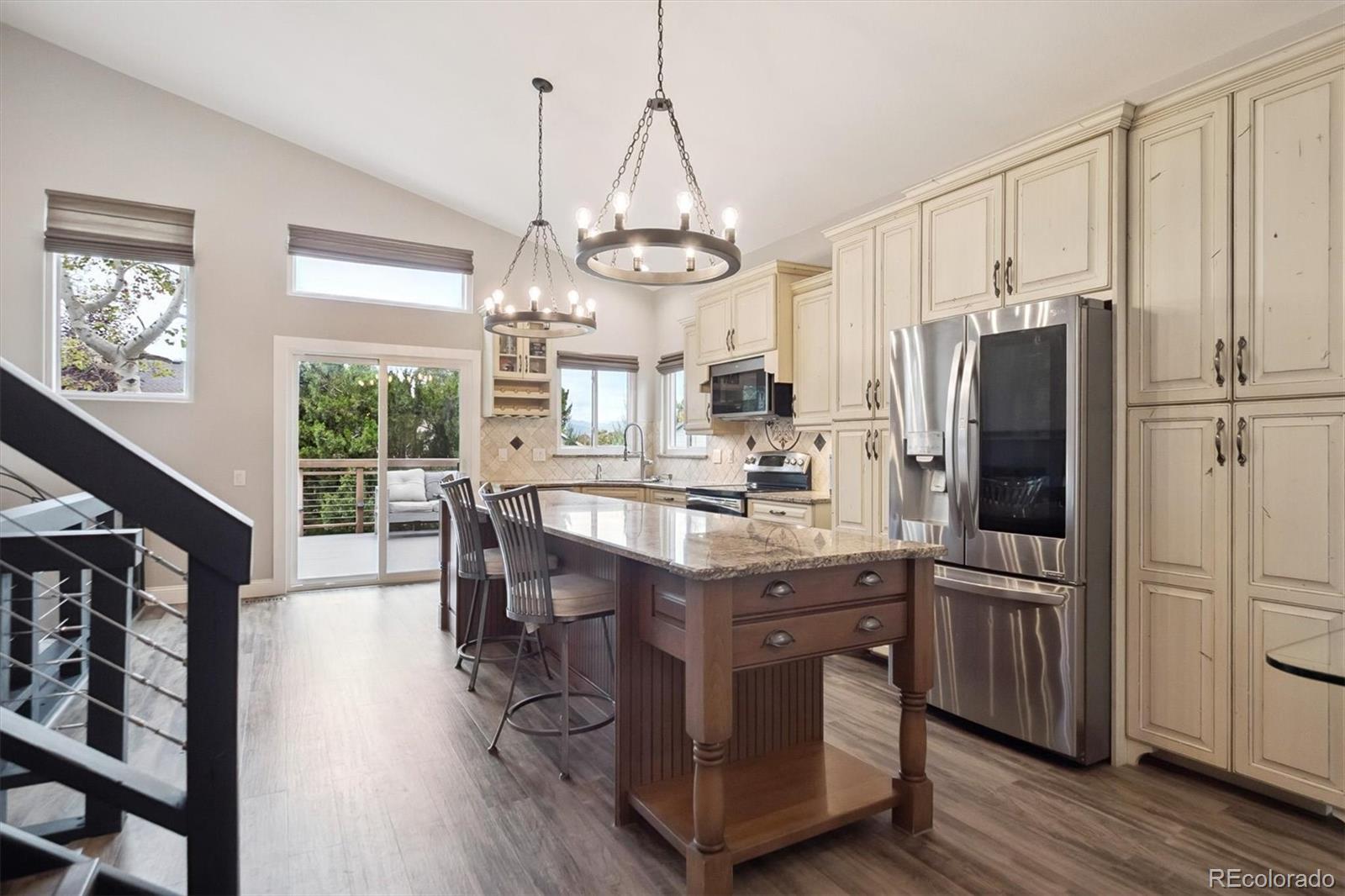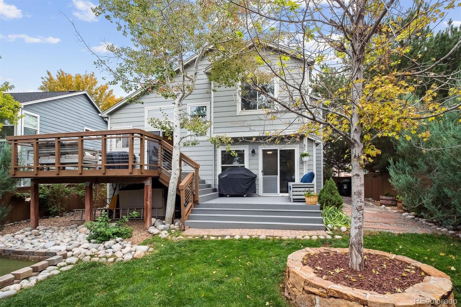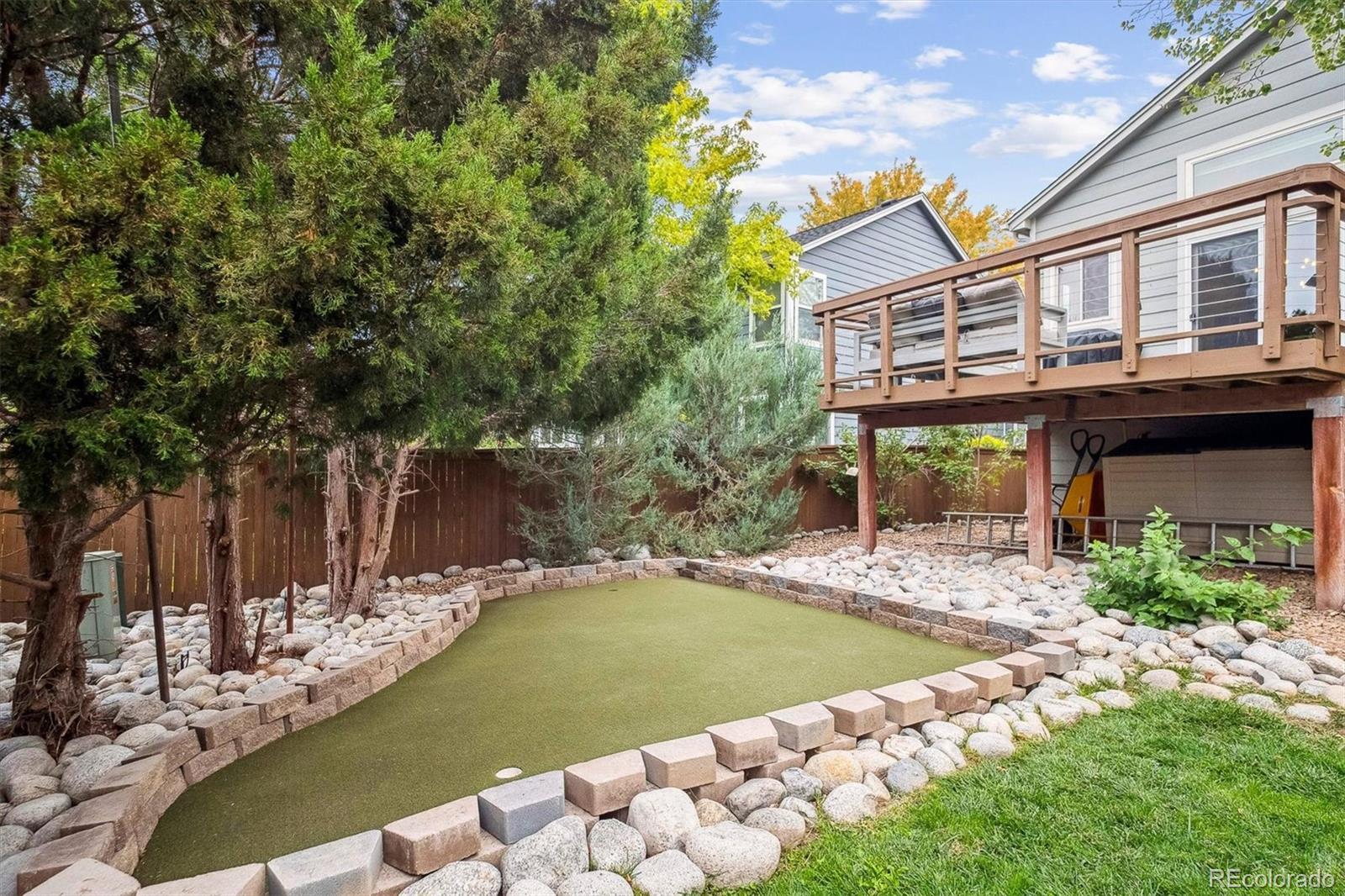 This beautiful split-level home offers an open floor plan with numerous custom qualities. Begin your tour by enjoying the mature landscaping trees, shrubs and bushes throughout the front and back yard. Make memories swinging on the front porch while sipping on your favorite drink. As you enter the front door, your eyes will be drawn upward towards the vaulted ceiling, openness and warmth of this wonderful home. The main, lower and basement levels all feature lovely laminate flooring! The lighting fixtures add character throughout, along with custom hand rails w/vertical wire cables. This kitchen is so unique w/antique cabinets and pull-out shelves throughout. A special peek-a-boo mountain view can be seen at the kitchen sink! Enjoy the stainless appliances including the instaview French door refrigerator w/dual ice maker! Double oven; instant hot water faucet; glass rinser at the kitchen sink, granite eat-in island while enjoying conversations and entertaining. There's plenty of meal prep space! Step outside the sliding door overlooking an upper and lower deck for morning or evening gatherings or quiet reading time. Enjoy your personal golf putting green to sharpen your skills! Back inside on the lower level, the family room is large enough to accommodate large furniture & BIG screen TV needs. The upper level bedrooms feature a primary with a custom wood closet door and accent wall. The walk-in shower is fabulous with timeless and tasteful tile work and double sink vanity. Two additional upper level bedrooms with a Jack and Jill bathroom too! Need additional living space? Don't miss the bonus basement room with garden level views to the backyard! More custom woodworking on the barn door to the laundry room with a big, bright window & sunlight! The two car garage has epoxy flooring + drywall & is even painted! Four rec centers nearby! Minutes to C-470, and the Town Center for shopping. Hurry to see this one! You will want to call it home as soon as possible!