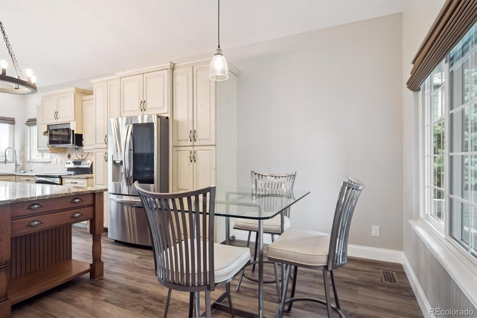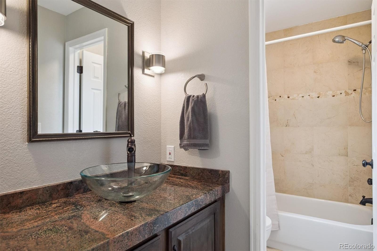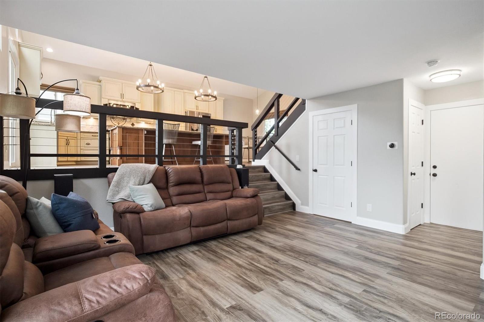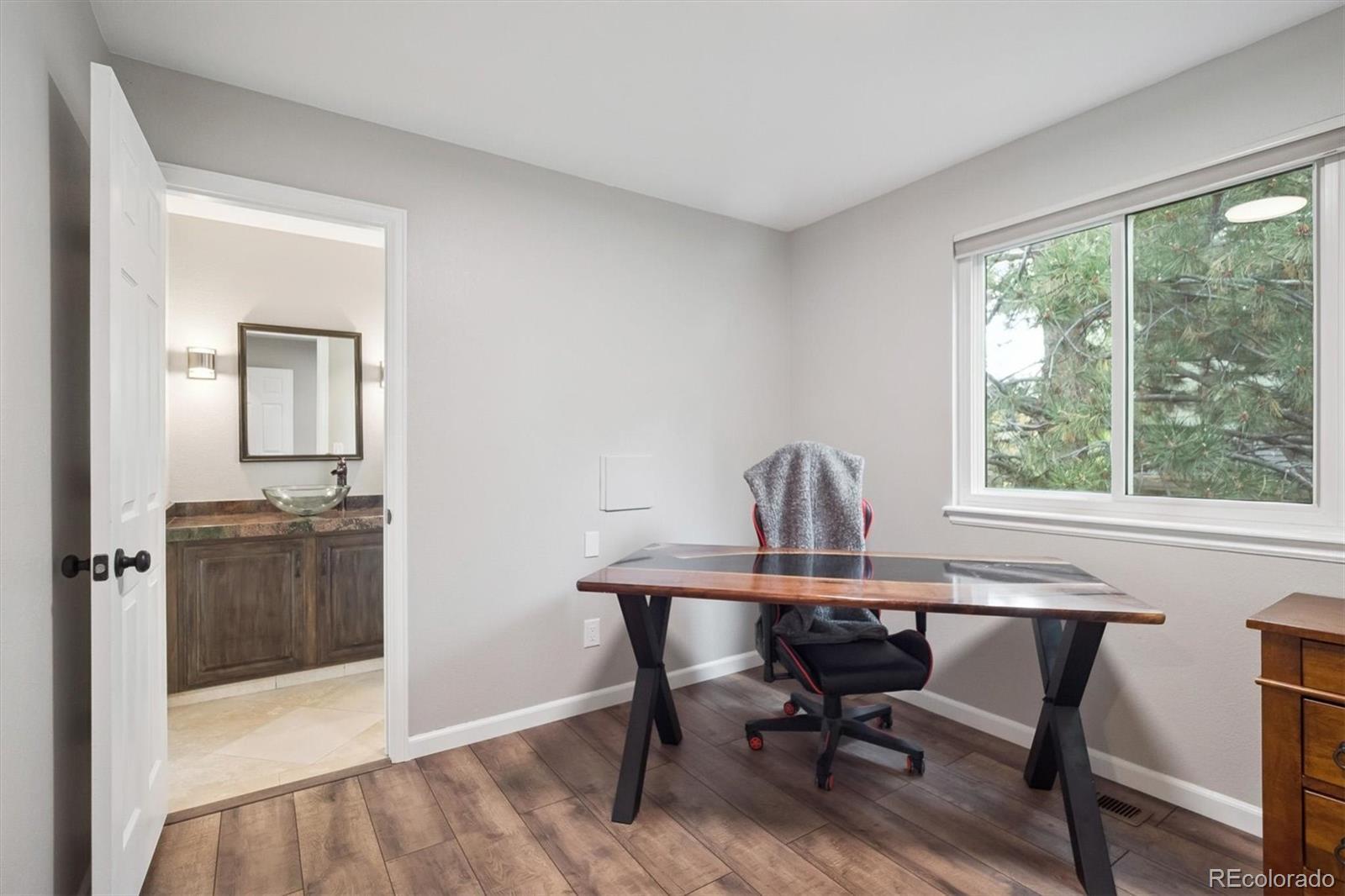 This beautiful split-level home offers an open floor plan with numerous custom qualities. Begin your tour by enjoying the mature landscaping trees, shrubs and bushes throughout the front and back yard. Make memories swinging on the front porch while sipping on your favorite drink. As you enter the front door, your eyes will be drawn upward towards the vaulted ceiling, openness and warmth of this wonderful home. The main, lower and basement levels all feature lovely laminate flooring! The lighting fixtures add character throughout, along with custom hand rails w/vertical wire cables. This kitchen is so unique w/antique cabinets and pull-out shelves throughout. A special peek-a-boo mountain view can be seen at the kitchen sink! Enjoy the stainless appliances including the instaview French door refrigerator w/dual ice maker! Double oven; instant hot water faucet; glass rinser at the kitchen sink, granite eat-in island while enjoying conversations and entertaining. There's plenty of meal prep space! Step outside the sliding door overlooking an upper and lower deck for morning or evening gatherings or quiet reading time. Enjoy your personal golf putting green to sharpen your skills! Back inside on the lower level, the family room is large enough to accommodate large furniture & BIG screen TV needs. The upper level bedrooms feature a primary with a custom wood closet door and accent wall. The walk-in shower is fabulous with timeless and tasteful tile work and double sink vanity. Two additional upper level bedrooms with a Jack and Jill bathroom too! Need additional living space? Don't miss the bonus basement room with garden level views to the backyard! More custom woodworking on the barn door to the laundry room with a big, bright window & sunlight! The two car garage has epoxy flooring + drywall & is even painted! Four rec centers nearby! Minutes to C-470, and the Town Center for shopping. Hurry to see this one! You will want to call it home as soon as possible!