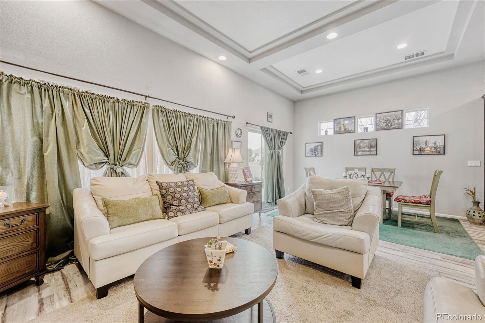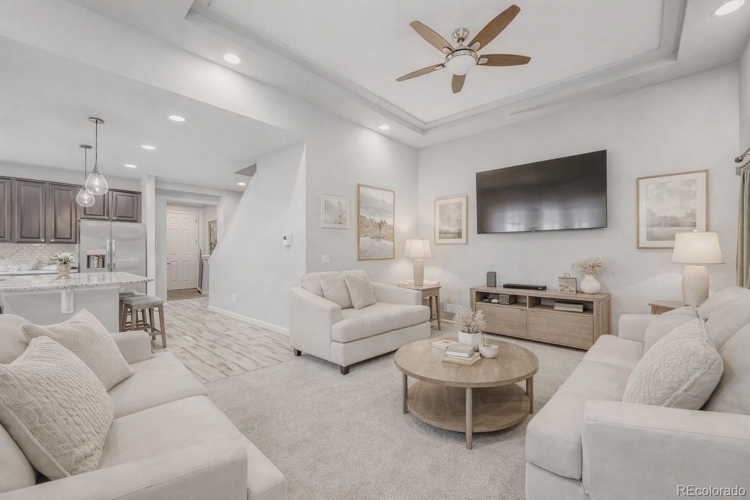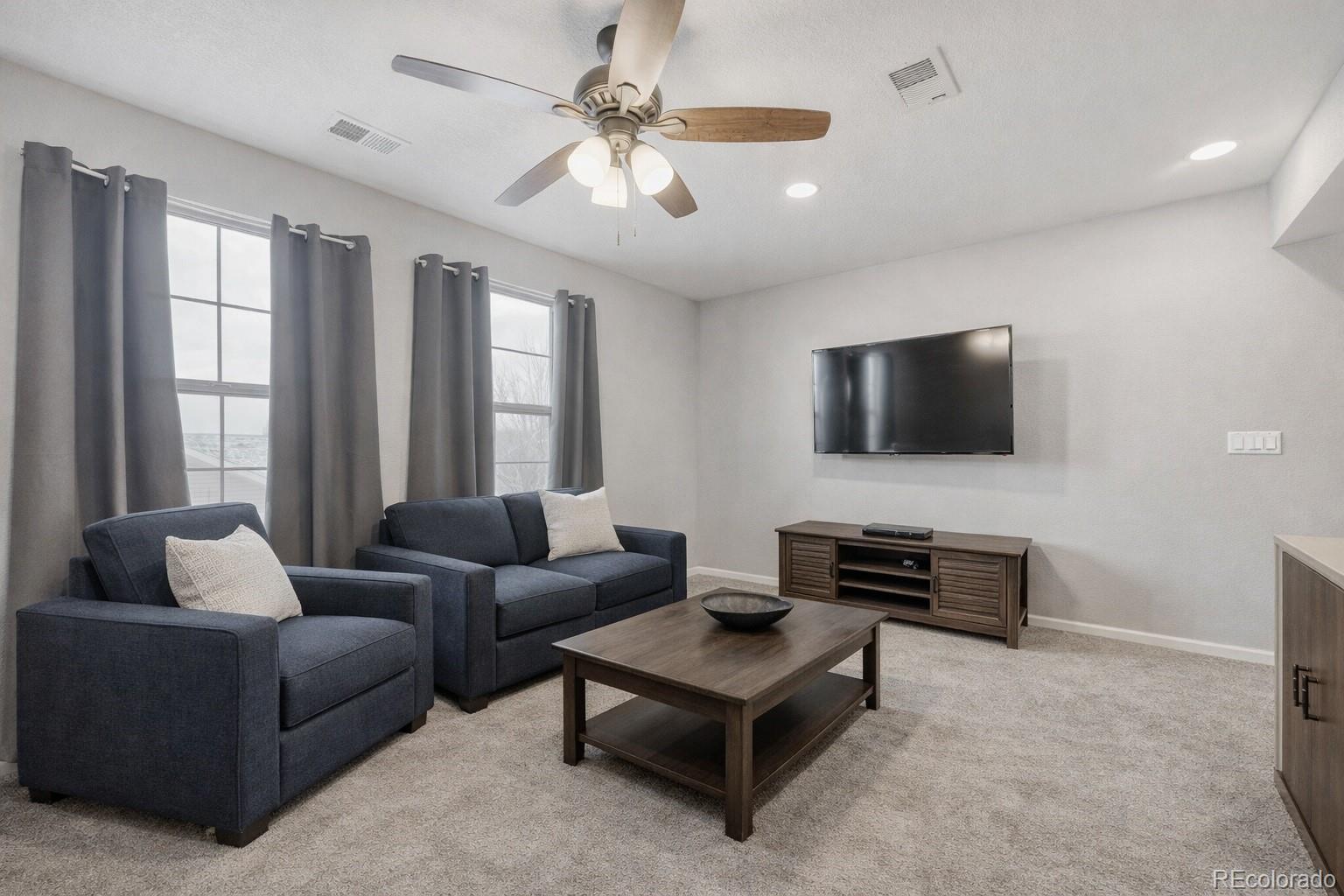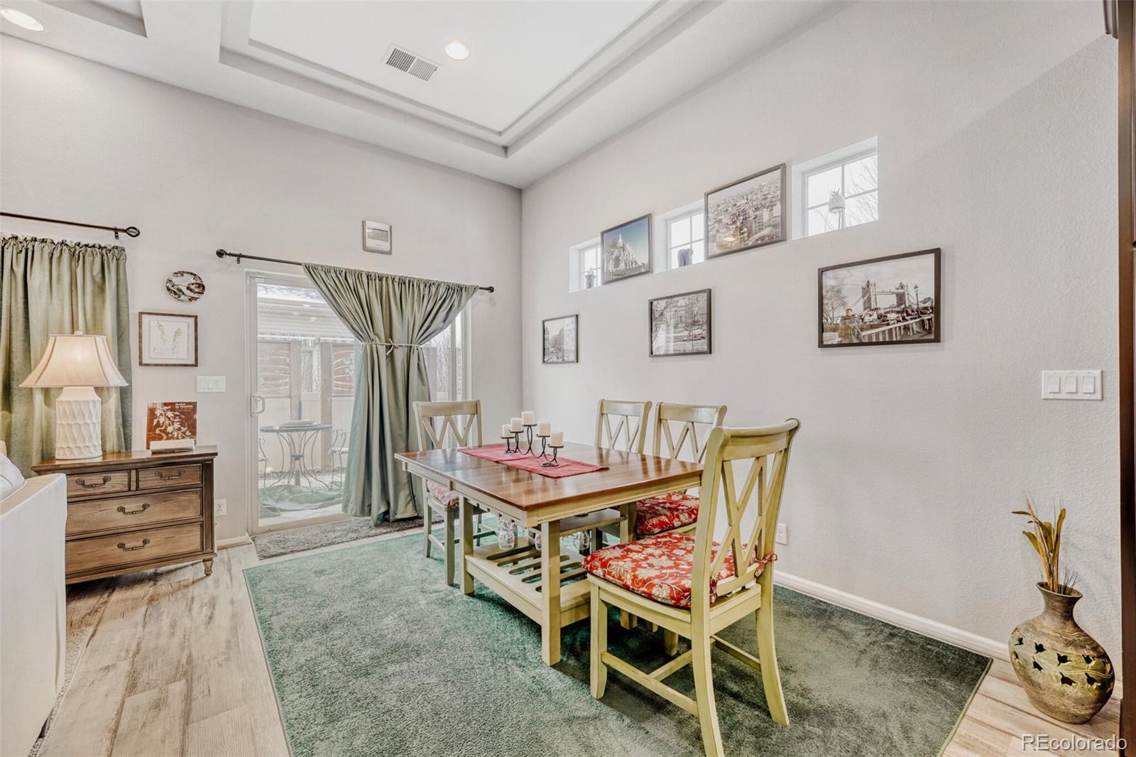 From the moment you arrive, this beautifully cared-for 3-bedroom, 3-bath home in Fairway Villas at Green Valley Ranch just feels right. The landscaped yard, inviting covered front porch, security door, and brand-new roof and siding (2025) set the tone for a home that’s been thoughtfully updated inside and out. Natural light fills the open layout, featuring durable vinyl flooring, tray ceilings, recessed lighting, and ceiling fans in the bedrooms and loft. The kitchen is the heart of the home, showcasing an oversized granite island, gas range, upgraded cabinetry, and a stylish backsplash—perfect for everyday living and entertaining. The main-level primary suite offers a spa-style shower, dual sinks, and a walk-in closet. Upstairs, you’ll find a second primary bedroom, a spacious loft/rec room, and flexible space ideal for guests, hobbies, or a home office. Separate thermostats on each level enhance comfort, and the home is pre-wired for central vacuum. Leased solar panels add energy efficiency and long-term savings. Step outside to your private backyard retreat featuring wrap-around patios, a gazebo, swing, decorative fountain, mature plants, and low-maintenance turf with drip irrigation - designed for relaxing, not yard work. This resort-style community offers two clubhouses, fitness centers, indoor and outdoor pools overlooking the golf course, plus pickleball, tennis, bocce, and miles of scenic trails. An on-site Activities Director keeps the calendar full and the lifestyle social. Conveniently located near parks, shopping, dining, DIA, major highways, Green Valley Ranch Golf Club, and the Rocky Mountain Arsenal Wildlife Refuge. Eligible buyers may qualify for a property tax rebate. This isn’t just a home—it’s a lifestyle.