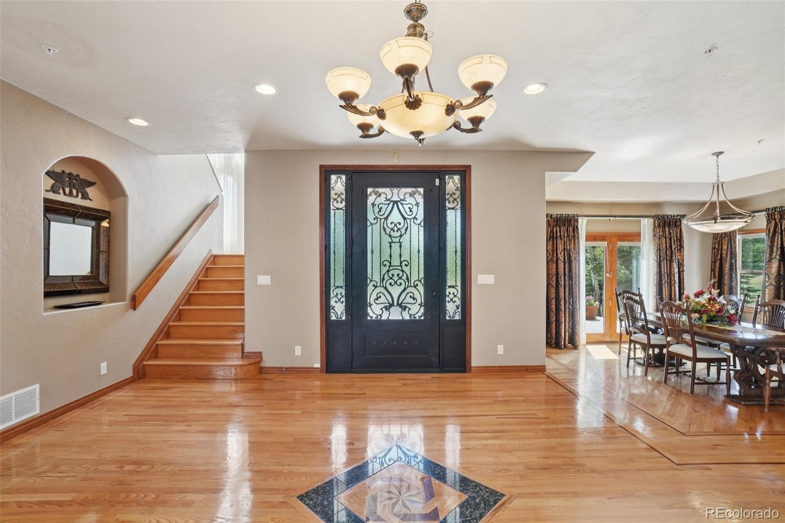 Welcome to this 35 plus acre oasis surrounded by majestic mountain and butte vistas in the private gated community of Douglas Ranches, easily accessible to I 25, DTC, Colorado Springs and Denver. This unique custom home with its magnificent waterfall encompasses the true Colorado experience with spectacular 360-degree views and breathtaking landscape as far as the eye can see. The acreage has its own tree farm, and an abundance of wildlife that enjoy grazing on pasture in this tranquil setting coveted by many and exemplifying what Douglas County is best known for. Please view the outbuilding with Pole Barn construction, as you view the exterior and acreage. Minutes to Bear Dance Public Golf Course, Colorado’s PGA headquarters, the famed 300-acre Phillip Miller Park ideal for the outdoor enthusiast and Dawson Butte Open Space Trail enjoyed by hikers and equestrian trail riders alike. This well-loved home has elegance, charm and custom design forged by the original owners since 1999. It has an in-house sprinkler system and a new Generac Home generator for additional peace of mind.