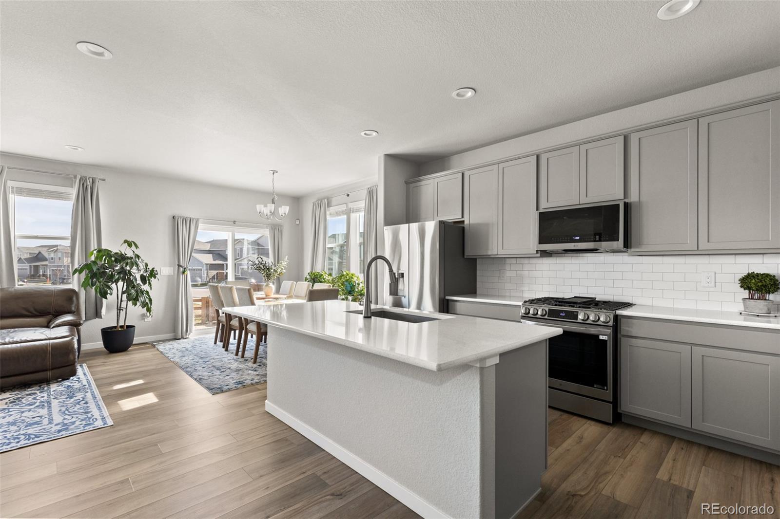 Beautifully upgraded two-story home located in the community of Lochbuie Station, a perfect blend of modern comfort, thoughtful design & quality craftsmanship. From the moment you step inside, you’ll be greeted by a spacious entryway & the warmth of wide-plank oak luxury vinyl flooring that flows seamlessly throughout most of the main level. Just off the entry sits a main floor office, ideal for working from home, or can function as a 6th bedroom. Continue inside to discover the heart of the home, an expansive open-concept living area where the kitchen, dining & family room connect effortlessly, creating the perfect setting for entertaining or relaxing. The main level features soaring 9 ft ceilings. The kitchen is a showpiece, featuring gray shaker cabinetry with soft-close doors & drawers, a crisp white subway tile backsplash, quartz countertops, stainless steel appliances including a gas range & kitchen faucet with a sensor & a large walk-in pantry. Thoughtful details like extra outlets & a built-in mudroom off the garage add everyday convenience. Tucked privately at the back of the home, a main floor bedroom sits near a full bathroom, perfect for guests or multigenerational living. Upstairs, you’ll find a spacious loft, three bedrooms including the luxurious primary suite with dual sinks, a glass-enclosed shower & a large walk-in closet. A convenient laundry room & full hall bath complete the upper level. The finished basement offers incredible versatility with a large secondary living area, full bedroom & bathroom, ideal for guests, a media room, or fitness space. A generous unfinished storage area ensures plenty of room for organization. Upgrades include an electric car charger plug, window coverings throughout, whole-home humidifier, alarm system, 8-inch carpet padding & wiring for a future hot tub. Enjoy peaceful privacy with no neighbors behind you. Experience modern living, quality finishes & small-town charm at Lochbuie Station—this home truly has it all.