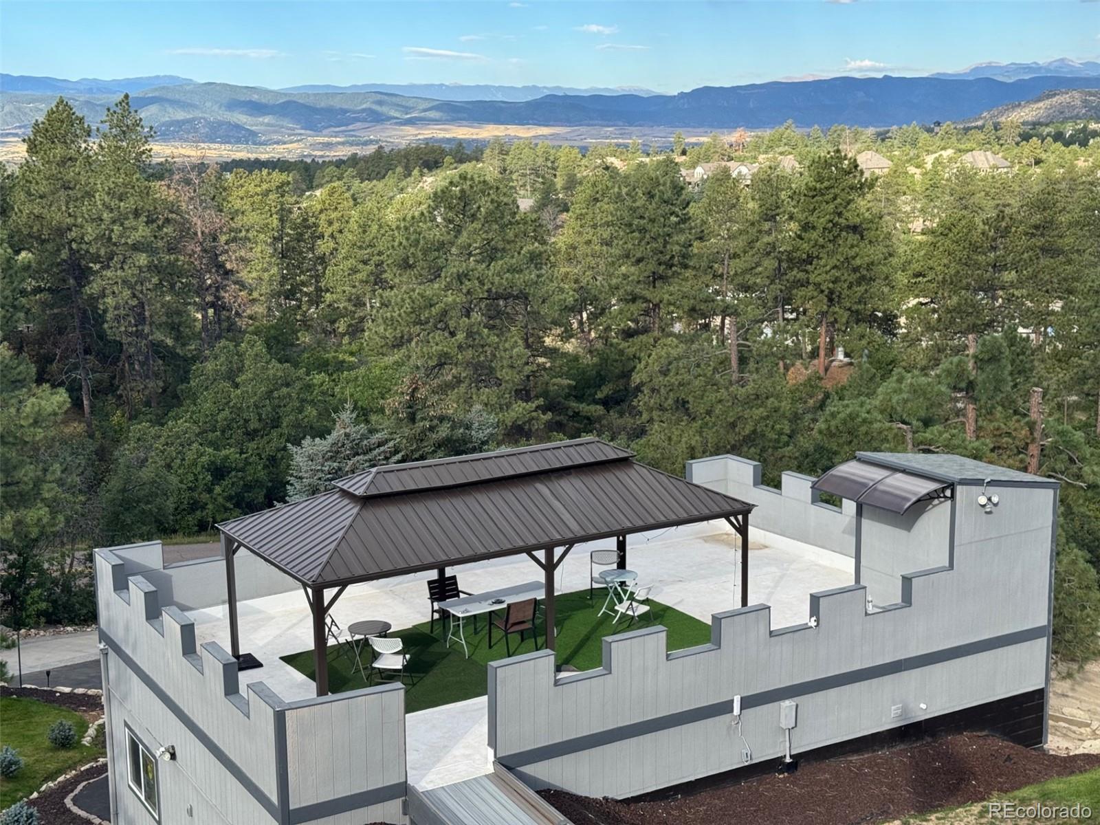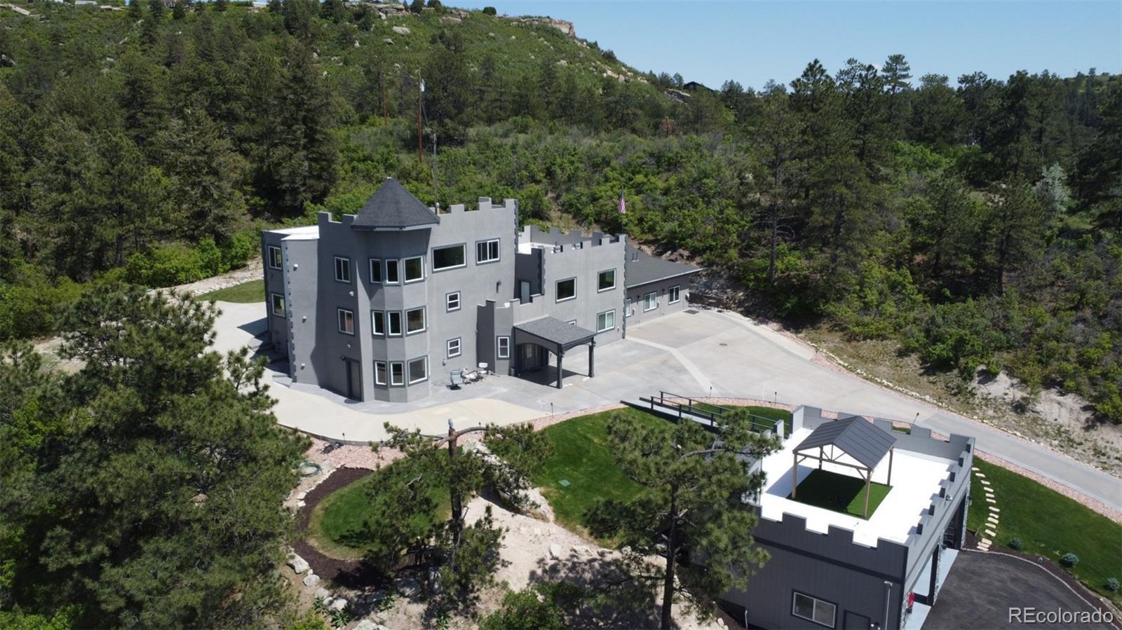 Luxurious CASTLE Estate on almost 2 ACRES in the coveted forest of Castle Pines. Centrally located, quick access to Hwy i25, minutes from 3 Golf Courses, largest Outdoor Shopping Mall and Hospitals. Property Uses: Residence, Rental Income or Assisted Living. Long term rental and licensed Short Term Vacation Rental. Super-Host Status. 4 TPO Roof Decks with gorgeous views of mountains and forest. Large Observation Deck with wet-bar and large Gazebo for photo opps/meetings. 7 Bedrooms and 4 Offices (that easily convert to more bedrooms). 9 Bathrooms (3/4 and full). 3 Bathrooms are Accessible. 2011 Total re-design and expansion in 2011. 2015 South-Wing added. 2024 Detached 4-car garage added with . Low Energy costs with Radiant Heat Boilers (no spreading of cold/flu viruses). Fire Sprinkler System. Existing Inground Pool can be set up with new liner. Already setup for 5-person Spa. Designed for an optional 3-Floor Elevator. Design allows house to be divided into 4 separate Condos each with its own entrance. 4-Car Garage with Elevator Chute, 3/4 Bathroom and Pet Wash. Off-Street Parking for 40+ cars and/or campers. -----------------------------------------------------------------------------------------------------------------------------------------