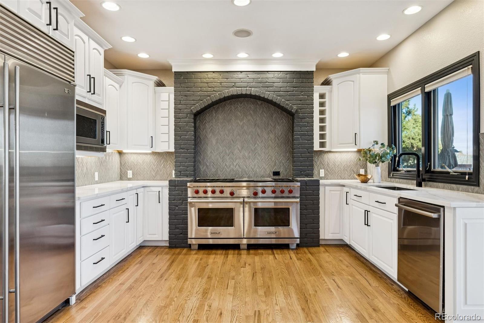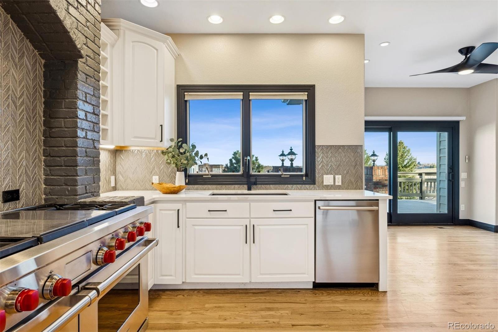 Stunning ranch-style home offering a serene setting, scenic views, and extensive recent upgrades. Tucked at the end of a quiet cul-de-sac on a large private lot, this exceptional residence captures distant downtown and farmland views while backing to a community greenbelt and trail. The elevated walk-out design provides seamless main-level living infused with mature landscaping and lovely fruit trees. The open floor plan is highlighted by a spacious great room with soaring ceilings, expansive windows and sliding doors, rich hardwood flooring, and soft neutral paint tones. The chef’s kitchen is a true showpiece, featuring stainless steel appliances including a Wolf six-burner gas range with double ovens, Sub-Zero refrigerator, Bosch dishwasher, and Dacor microwave. Crisp quartz countertops, white cabinetry with glass accents, a pantry, and breakfast nook complete this inviting space. The main-level primary suite offers a private retreat with an updated five-piece bath featuring a clawfoot tub. A gracious dining room, formal study, large laundry/mud room, and two additional bedrooms with a renovated shared ¾ bath complete the main level. The walk-out lower level includes two additional bedrooms, two baths, and a generous recreation and media space with a bar—ideal for entertaining—along with ample storage and closet space. Indoor-outdoor living shines with an expansive deck spanning the length of the home, complete with an automatic awning, raised garden beds, gate, and lighting. The three-car heated garage features a convenient workbench and extensive built-in cabinet storage. Recent upgrades include new carpet throughout, interior and exterior paint, a renovated kitchen and two main-level bathrooms, updated decorative lighting and ceiling fans, a new AC/furnace unit, garage door opener, and back door slider. Located in the prestigious Westwoods Ridge neighborhood, residents enjoy miles of trails, a new playground, and close proximity to abundant amenities.