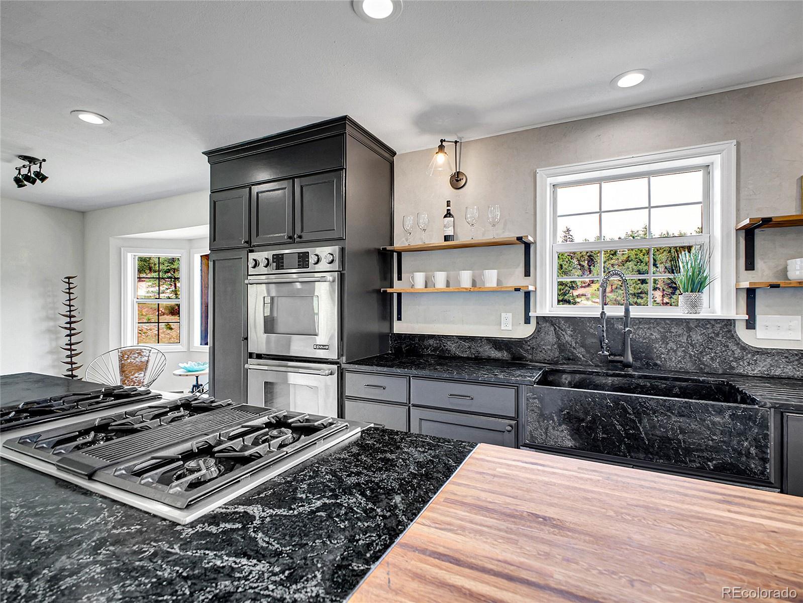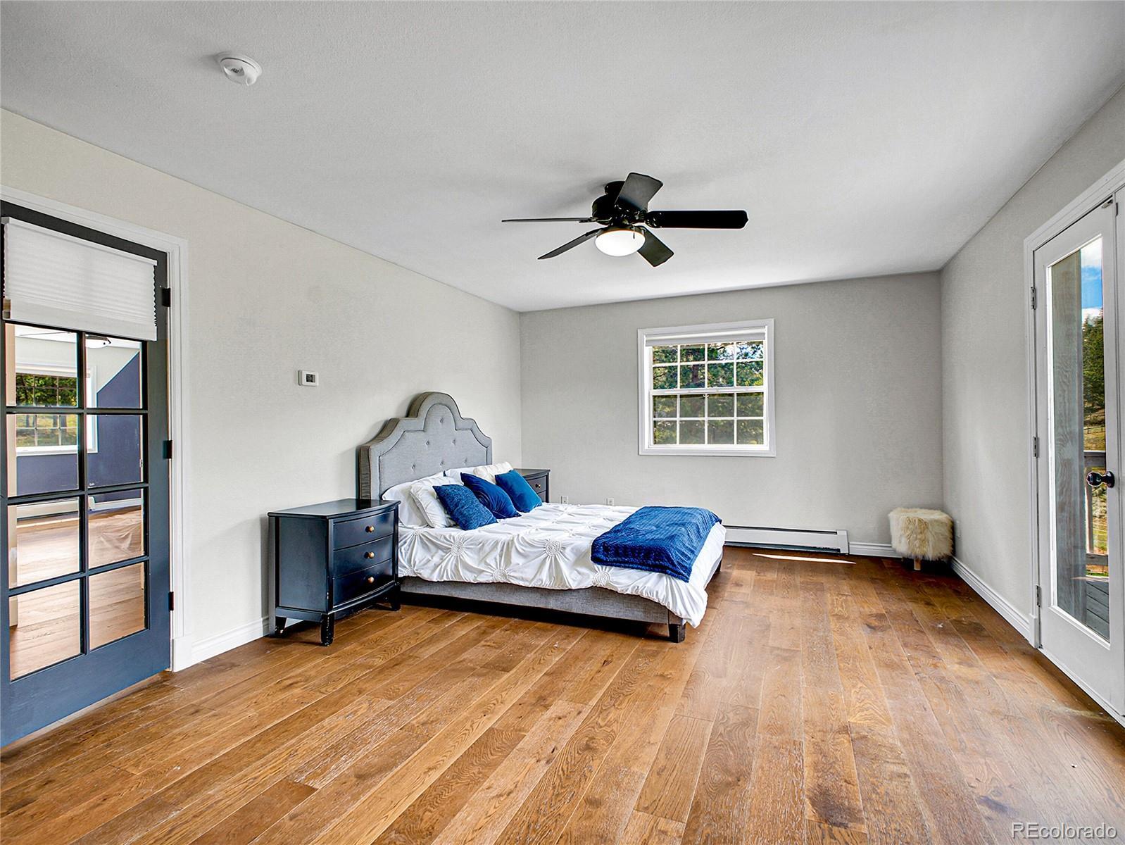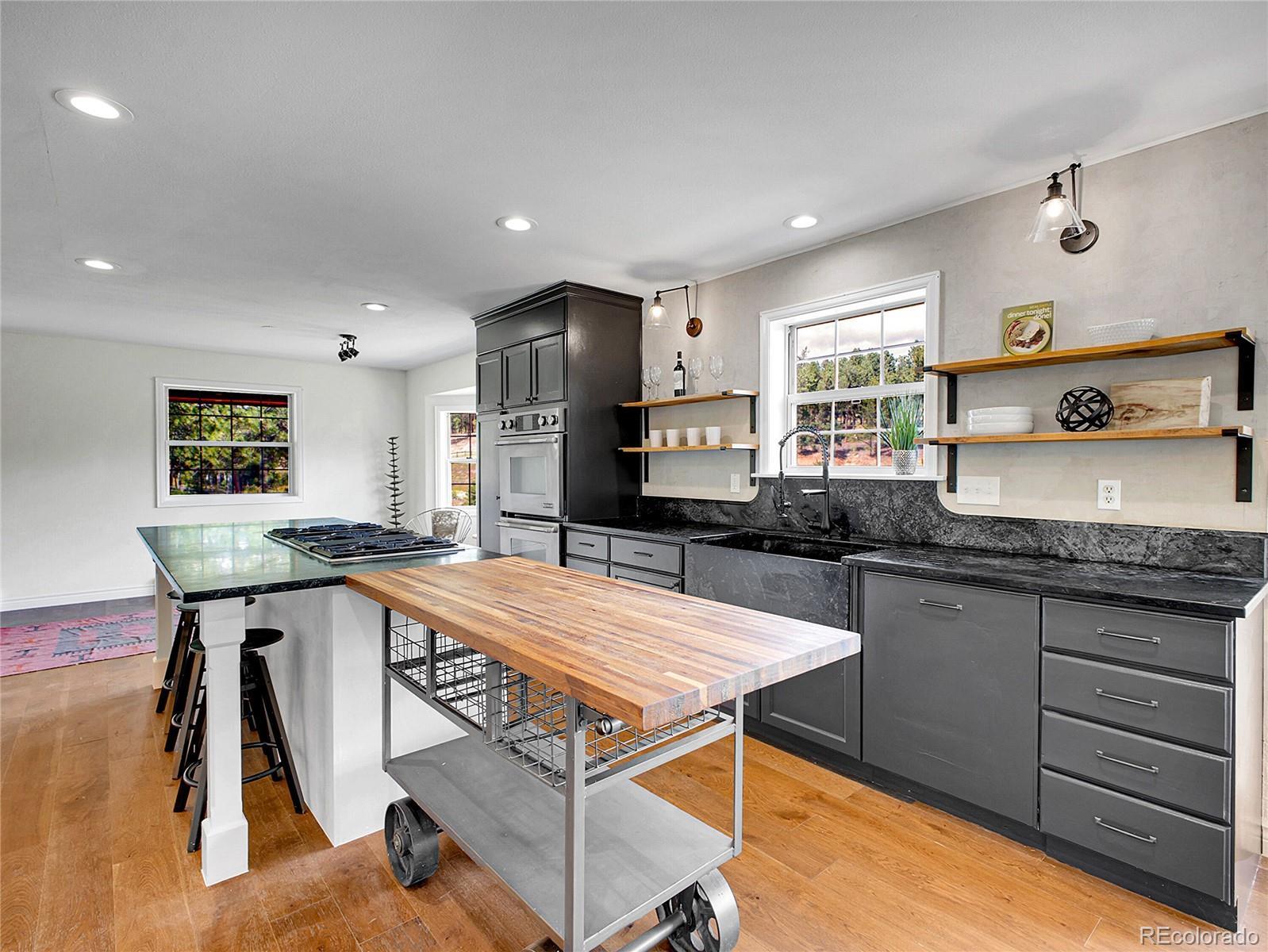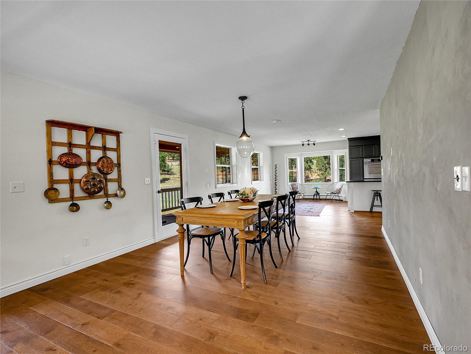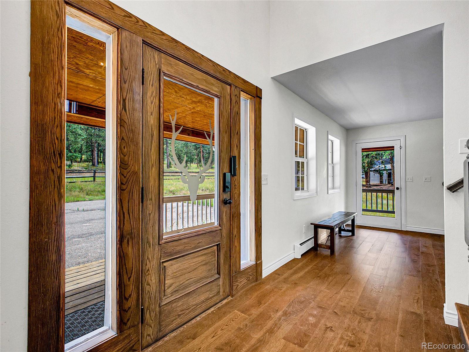 Amazing opportunity — instant equity and endless potential! Set on 2 beautiful acres in Woodside Park, a premier equestrian-friendly community. Featuring 4 bedrooms, 4 baths, and a main-floor office, this home offers generous square footage ready to be customized to your style. Offering over 4,000 square feet, wide-open views and peaceful surroundings. Step inside to a warm and welcoming main level featuring fresh paint, rich wood flooring, and an eat-in kitchen complete with stainless steel appliances, a 6-burner gas cook top, double oven, farmhouse sink, soapstone countertops with counter seating, and a spacious walk-in pantry. The walk through pantry with wine fridge connects directly to the oversized 3-car garage—perfect for quick grocery drop-off and ample storage. A second garage entry leads into a walk-in laundry/mudroom with built-in cabinetry and a utility sink, thoughtfully designed to meet the demands of mountain living. The expansive living room features French doors that open to a balcony—large enough for BBQs, outdoor dinners, and lively gatherings under the stars. The dining room flows onto a wraparound deck. A dedicated main-floor office and stylish half bath complete this level. Upstairs, the light-filled primary suite offers its own private balcony, a generous walk-in closet, and a spa-inspired five-piece bath with soaking tub and oversized slate tile shower. Two additional bedrooms and a full bath provide comfort and privacy for guests or family. The walkout basement offers endless possibilities for a home theater, gym, guest suite, game room or income producing space with direct outdoor access. New bathroom features a steam shower with Bluetooth speakers with an electric fireplace. The home is minutes to Highway 285, local grocery stores, schools, coffee shops and eateries.