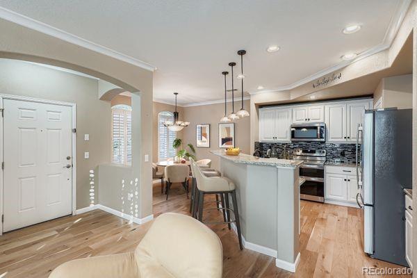 Welcome home! This beautifully updated 2-bedroom, 3-bathroom townhouse offers 1,669 sq. ft. of comfortable living space in the heart of Highlands Ranch, Colorado. With thoughtful upgrades and a warm, welcoming feel, this home is ready for you to move right in.The remodeled kitchen is the heart of the home, featuring gorgeous granite countertops, plenty of cabinet space, and updated appliances—perfect for family meals or entertaining friends. The open floor plan flows into the bright living and dining areas, highlighted by new hardwood floors and crown molding that add a touch of charm throughout. Upstairs, you’ll find two spacious bedrooms, each with its own private bathroom, creating the perfect retreat for everyone in the family. An additional bathroom on the main level makes everyday living even more convenient. There is even additional den space on the main floor that can be used as a craft room, home office or could easily be converted to a third bedroom. You’ll love the location—just a short walk to Civic Green Park, Highlands Ranch Library, local recreation centers, and the Highlands Ranch Town Center. Whether it’s enjoying a picnic at the park, an afternoon at the library, or a day of shopping and dining, everything your family needs is right around the corner. With its cozy updates, family-friendly layout, and ideal location, this townhome is the perfect place to plant roots and create lasting memories. Also, Seller is offering to help with lender incentives for rate buydown.