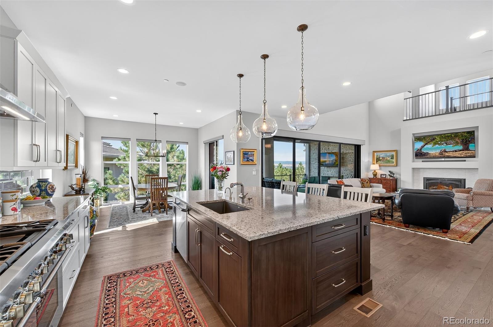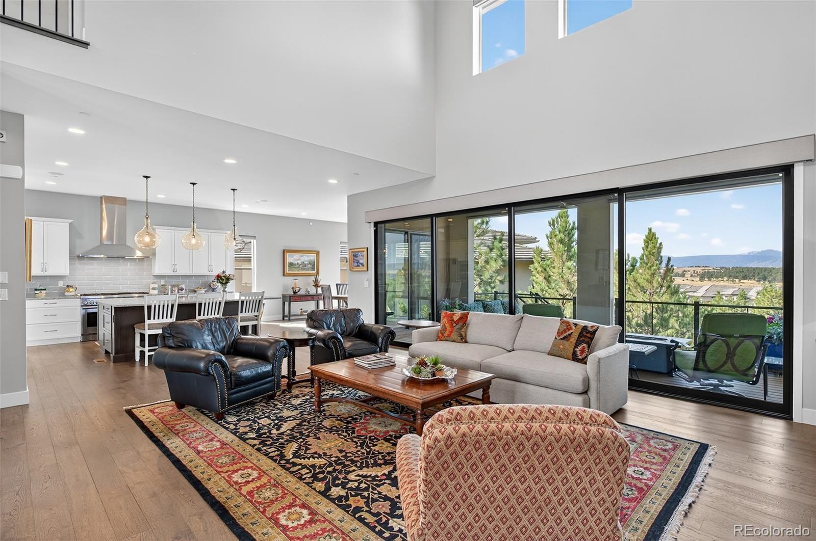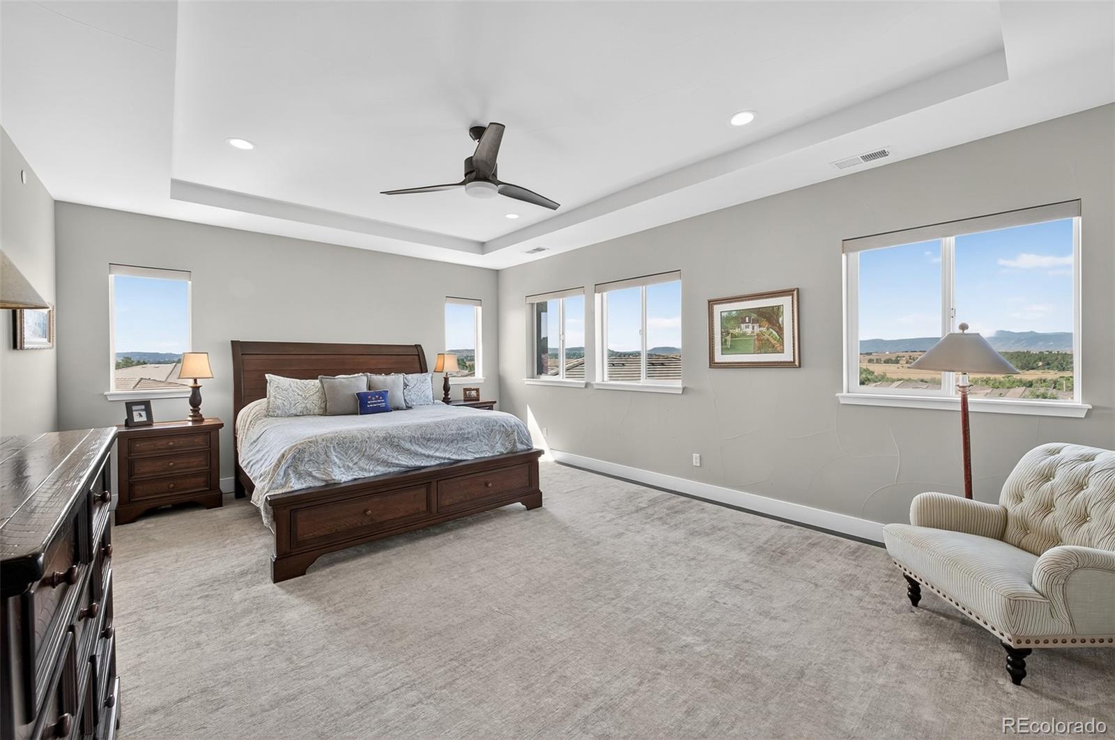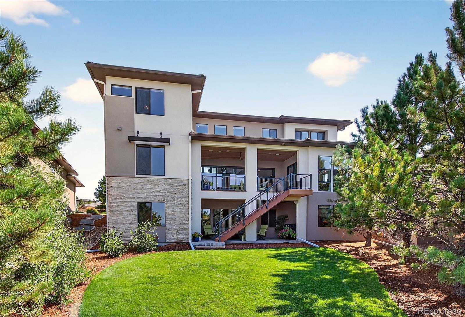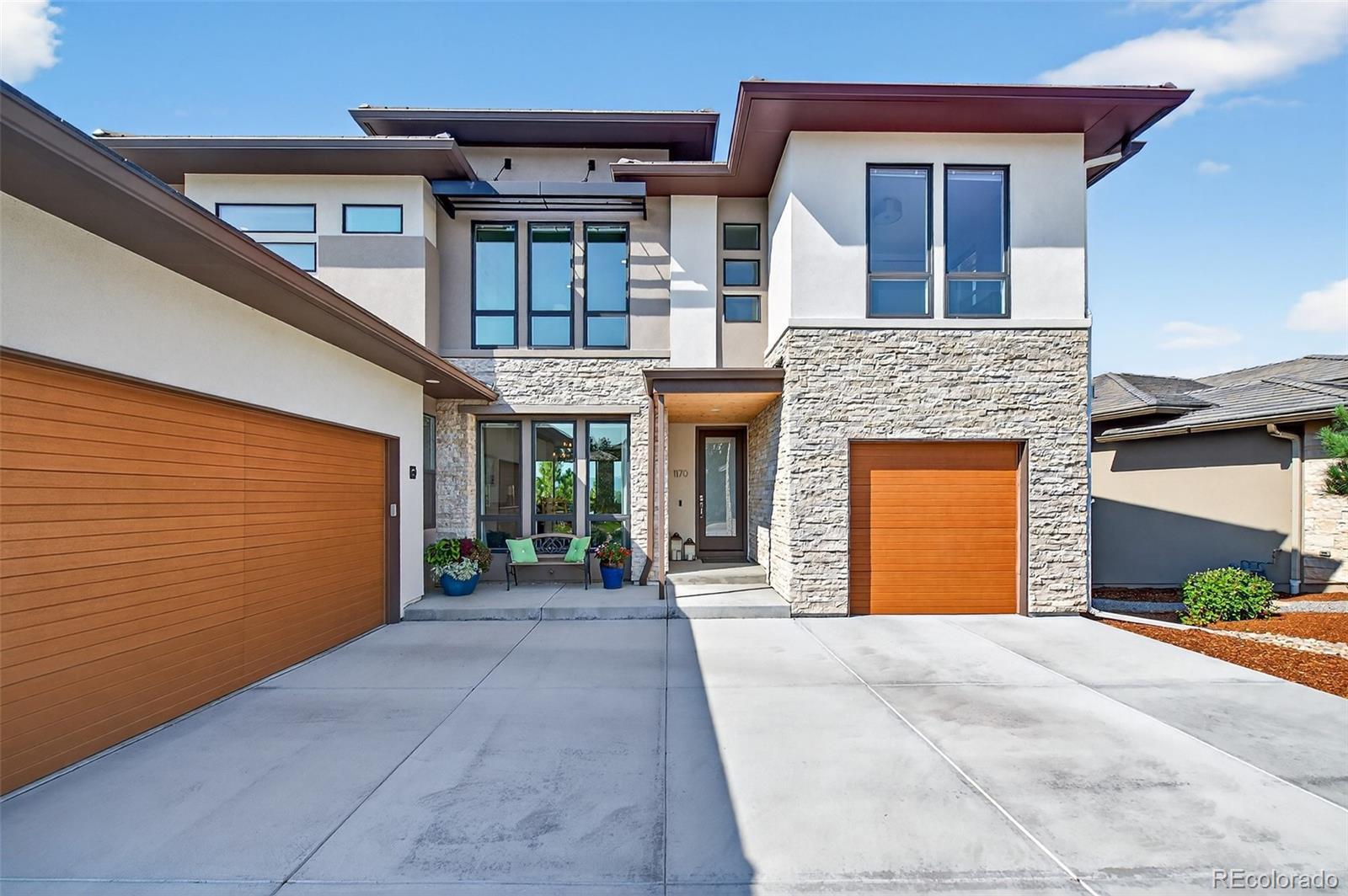 Mountain views from all levels of this beautiful Infinity built two-story home with walk-out basement in the Prato development. Open floorplan with towering ceilings and numerous windows highlighting the western views. The great room offers a full-length sliding glass wall that opens to the west facing deck providing perfect indoor/outdoor living. Kitchen has a stainless steel Thermador and JennAir appliance suite. Butler pantry off the kitchen makes a convenient drop zone in addition to the walk-in pantry and mudroom. Covered deck off the kitchen features a tongue-in-groove ceiling, gas fireplace with stone surround, motorized sunshades and a mounted TV making this a perfect place to unwind and watch the sunset over the mountains. Main floor has an ensuite bedroom and office. Upstairs offers the perfect layout with secondary bedrooms on the opposite wing of the primary suite. Second-level opens to the lower level with a cozy loft between the bedroom wings. The loft has mountain views and features custom built-ins for a second office or library. Secondary bedrooms upstairs have ensuite baths. Primary suite has mountain views and a roomy 5-piece bath with dual vanities, walk-in closets, linen closet, large rectangular soaking tub, and a walk-in shower with glass door. Dedicated laundry on second and basement levels. Lower-level wet bar with abundant cabinet space, quartz countertops and bar seating. Lutron lighting system allows full control of lighting throughout the home. Motorized shades in most rooms. Snow and ice-melt system installed on the extra wide, HEATED DRIVEWAY means no more snow shoveling! 3-car attached and heated garage with epoxy floor coating include extensive storage, work bench and hanging systems. This home is truly one of a kind! If you are looking for a low maintenance, turn-key home with mountain views in the Village Castle Pines – look no further!
