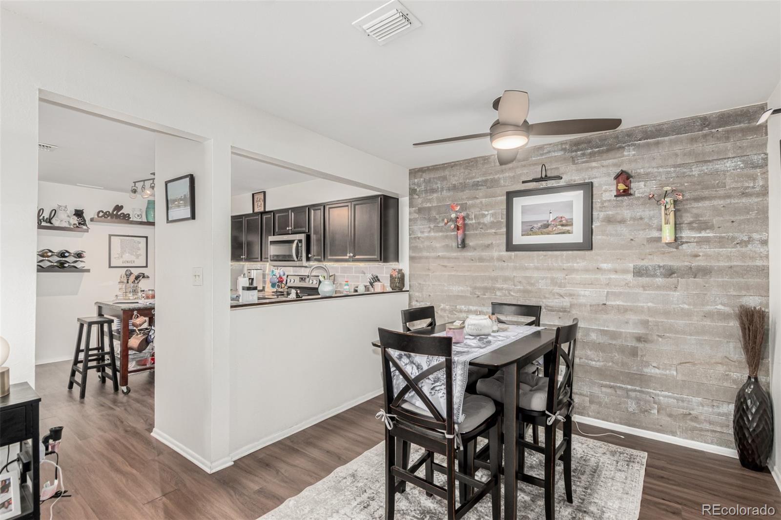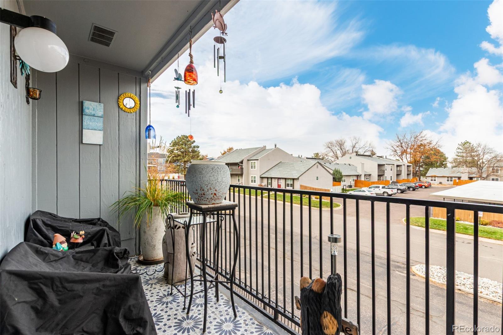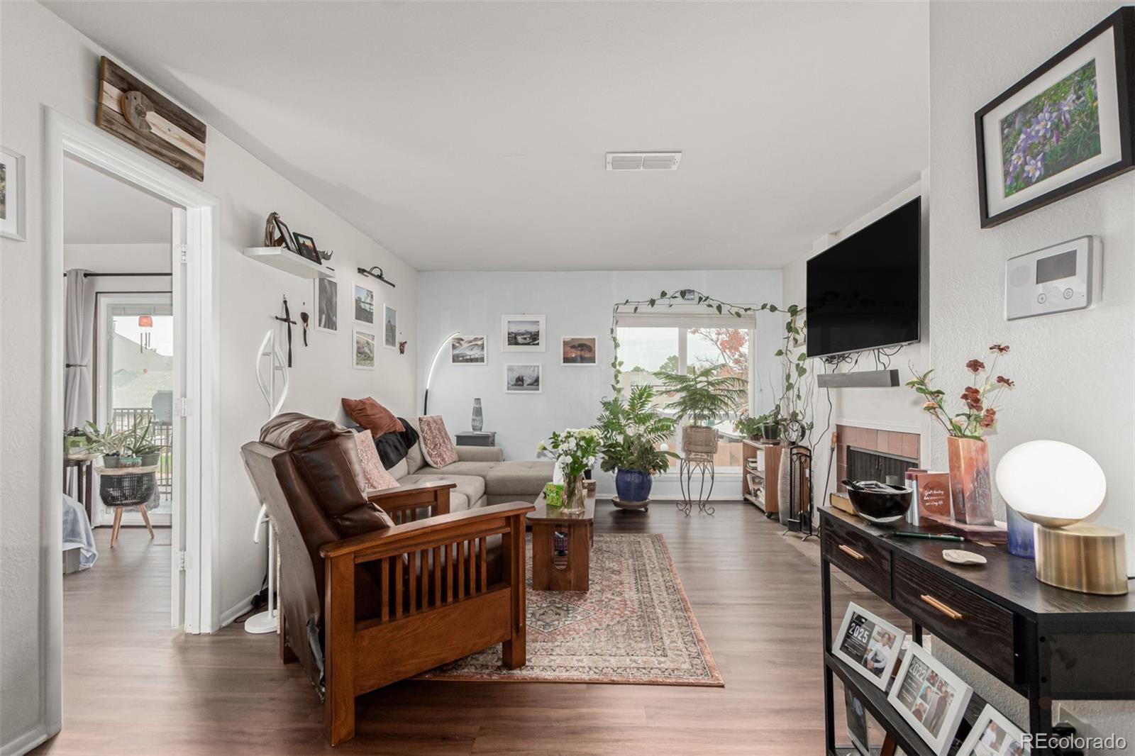 Beautiful, pristine condo in safe and quiet Southglenn Commons! Discover a spacious dining & living area with a stylish reclaimed accent wall, LVP flooring, and a wood-burning fireplace to keep you warm & cozy. The kitchen comes equipped with soft-close kitchen cabinets, new backsplash, plenty of counter space and a serving window, and newer stainless steel appliances. Cozy bedrooms w/large closets promise you a good night's sleep! Don't forget about the charming balcony with new tile and access from both bedrooms. Other upgrades include new Pella windows (large value add!), a new barn door for the bathroom, and brand new fans in both the dining room and bedroom. There is even a little front garden area with spigot/hose! This unit comes with a deeded garage just steps from the front door and plenty of additional parking. New laundry machines included and TV with mount negotiable! Pride of home ownership shines... it's move-in ready... what are you waiting for? Act now!