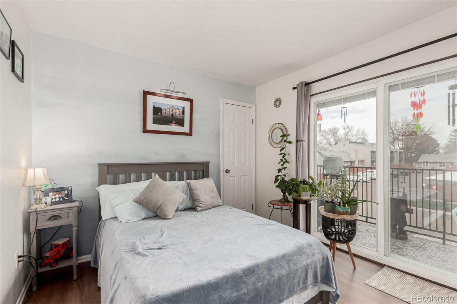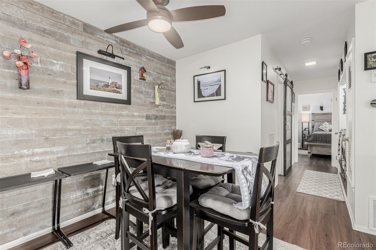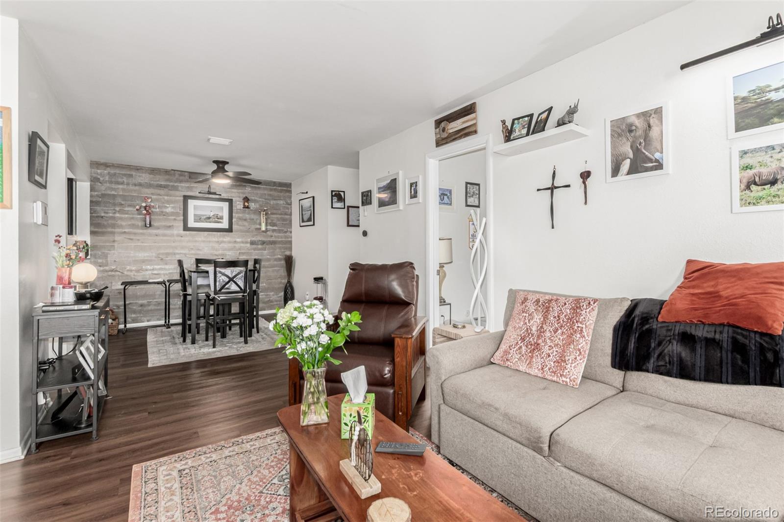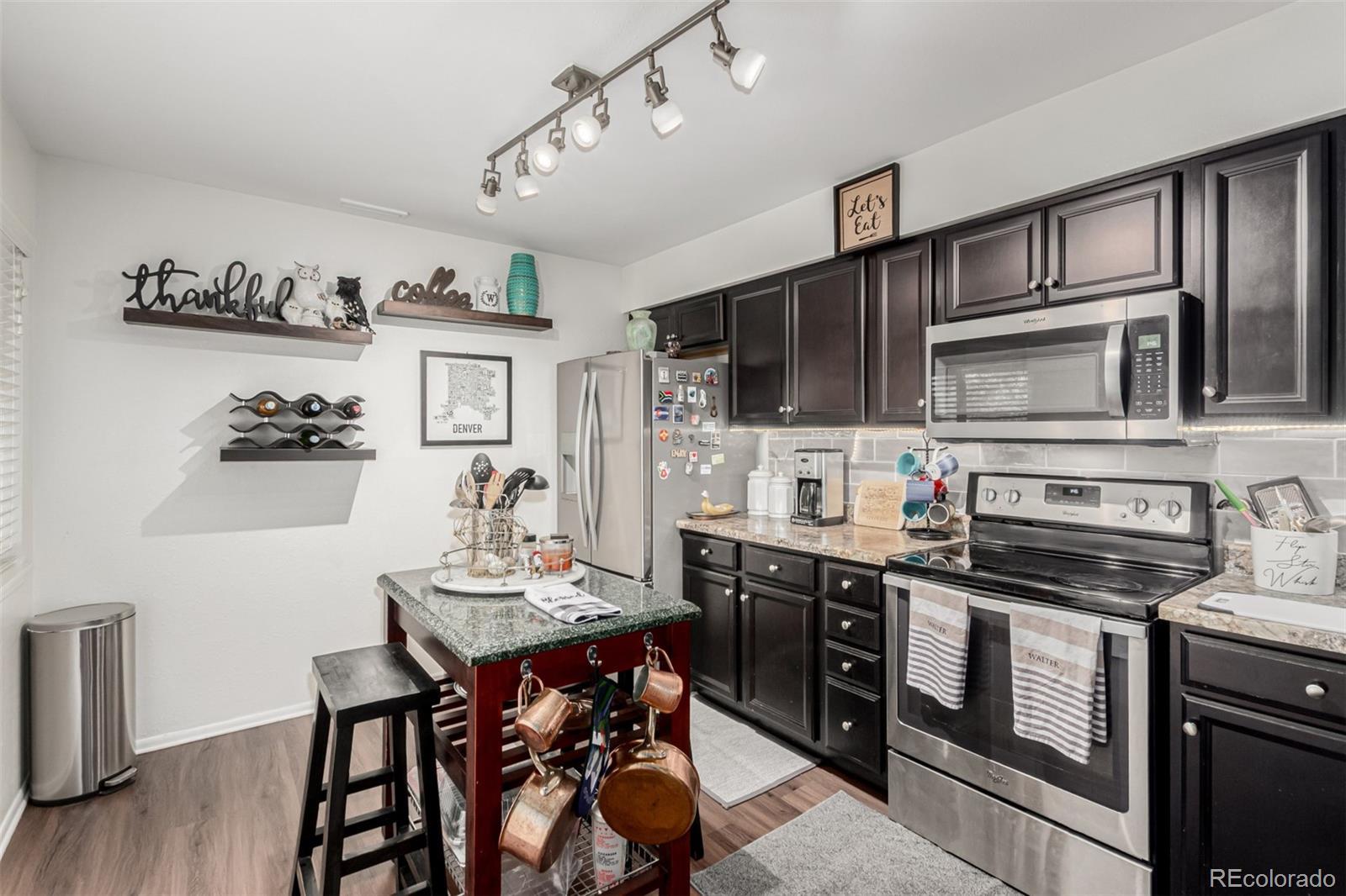 Beautiful, pristine condo in safe and quiet Southglenn Commons! Discover a spacious dining & living area with a stylish reclaimed accent wall, LVP flooring, and a wood-burning fireplace to keep you warm & cozy. The kitchen comes equipped with soft-close kitchen cabinets, new backsplash, plenty of counter space and a serving window, and newer stainless steel appliances. Cozy bedrooms w/large closets promise you a good night's sleep! Don't forget about the charming balcony with new tile and access from both bedrooms. Other upgrades include new Pella windows (large value add!), a new barn door for the bathroom, and brand new fans in both the dining room and bedroom. There is even a little front garden area with spigot/hose! This unit comes with a deeded garage just steps from the front door and plenty of additional parking. New laundry machines included and TV with mount negotiable! Pride of home ownership shines... it's move-in ready... what are you waiting for? Act now!