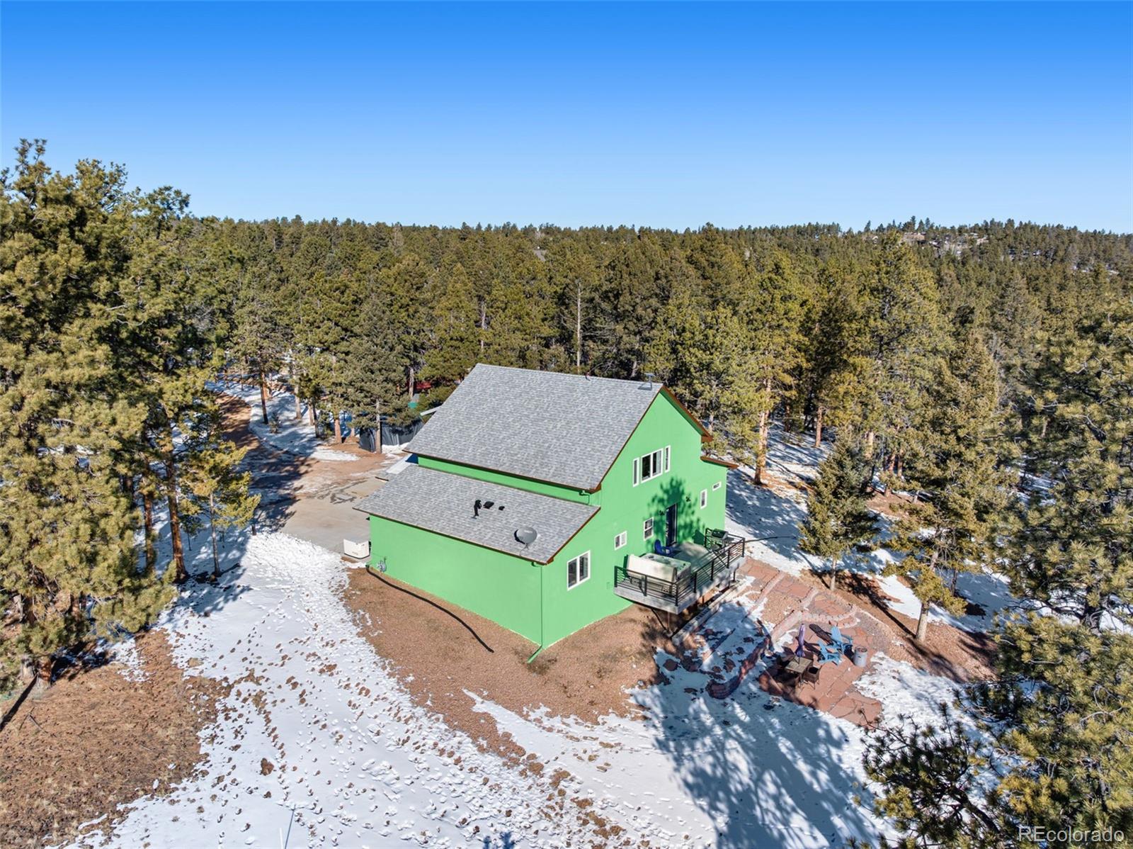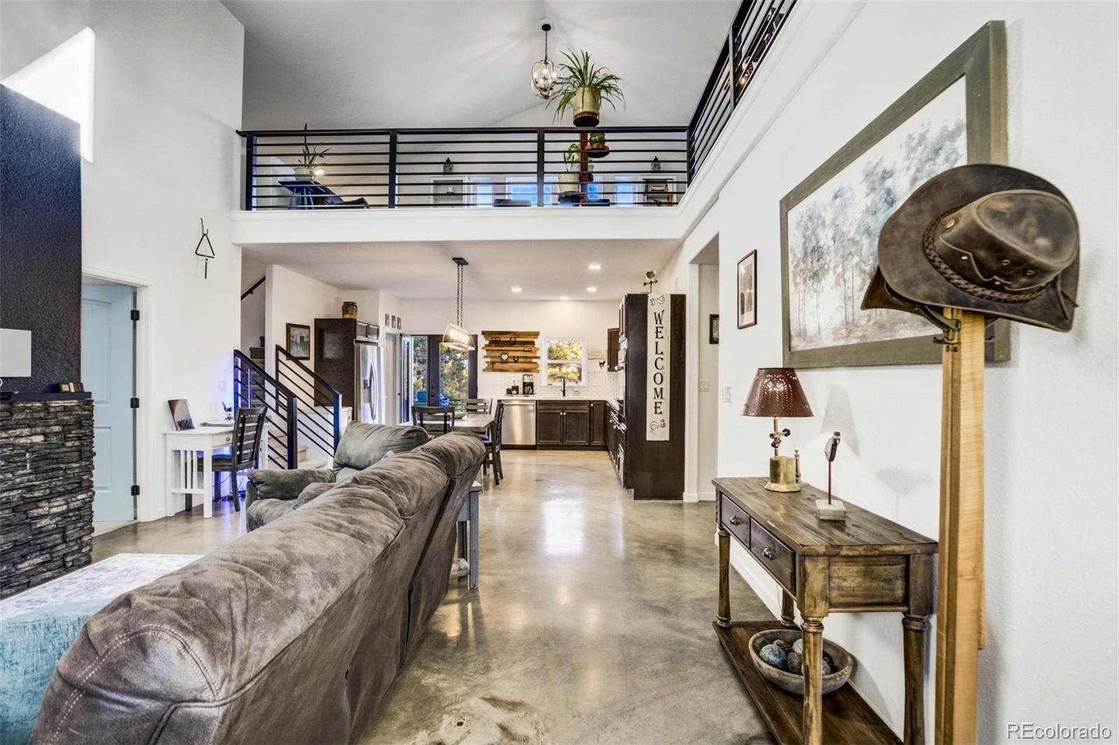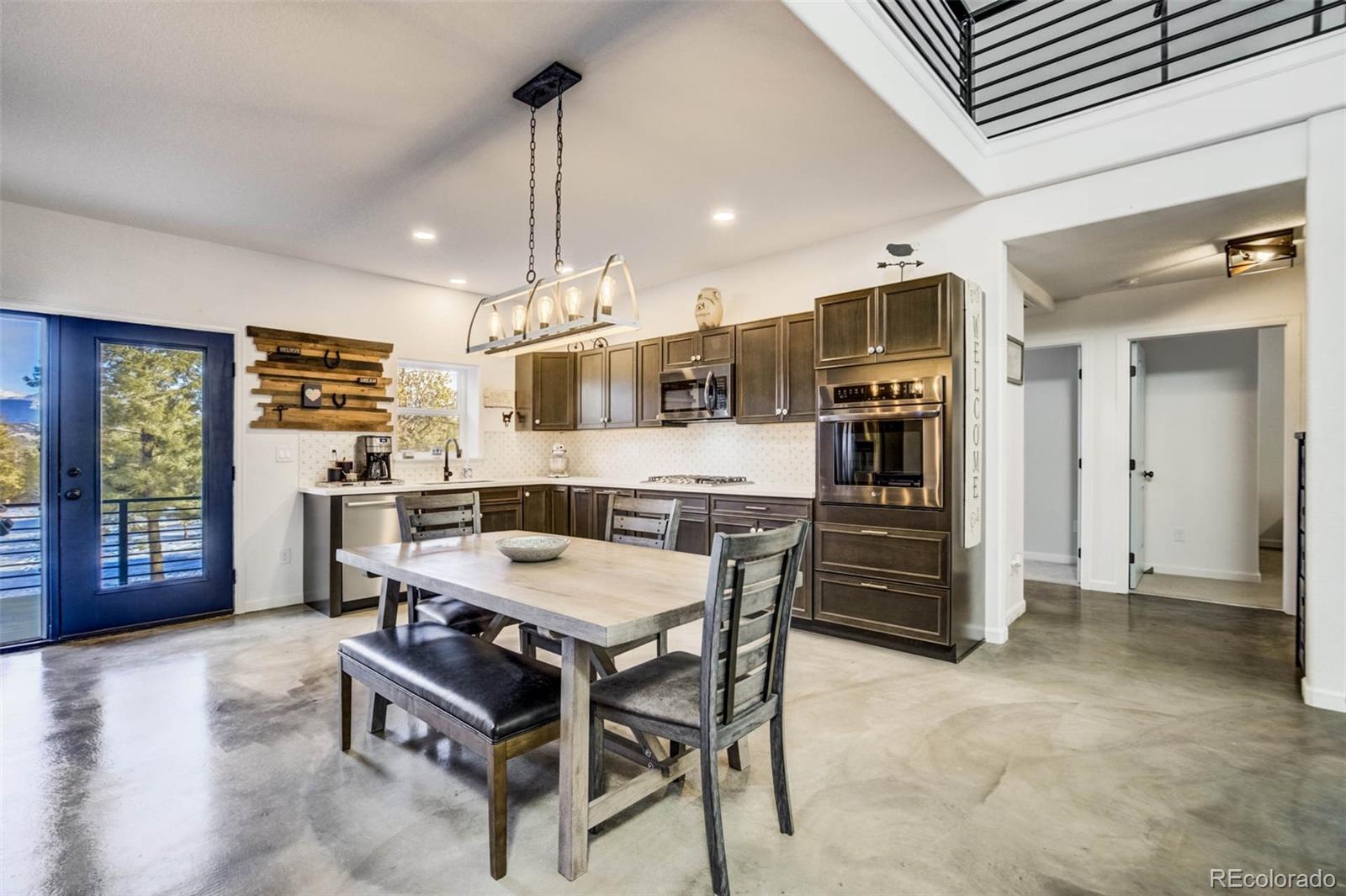 Thoughtfully designed and beautifully built, this custom concrete home offers a welcoming take on mountain living with sweeping views of Pikes Peak—bringing modern, city-style comfort to a peaceful mountain setting. Constructed with Injected Concrete Forms (ICFs), the home delivers exceptional strength, energy efficiency, and quiet comfort, complemented by in-floor radiant heating and a whole-home fresh air delivery system for year-round comfort. The main living area feels both open and inviting, with polished concrete floors, iron railing accents, a gas fireplace, and a striking 72" ceiling fan. The open layout allows the kitchen, dining, and living areas to flow naturally together, blending urban-style functionality with the surrounding landscape. The kitchen features stainless steel appliances and a penny tile backsplash for a clean, modern look. The primary suite serves as a peaceful retreat with a double vanity, walk-in closet, and a spacious walk-in tiled shower. Two additional bedrooms and a well-appointed bathroom provide flexible space for guests or other uses. Upstairs, a spacious loft captures a framed mountain view, creating an inviting space for a media room, home office, or reading nook. Deep walk-in storage adds practicality, while multimedia connections throughout the home support modern living. Outdoor living is just as inviting. Dusk-to-dawn lighting surrounds the home and illuminates the rear staircase leading to a tiered flagstone patio. A private hot tub looks out over sweeping mountain vistas, offering a relaxing place to unwind under the Colorado sky. Additional features include a tankless water heater, an automatic Generac 14kW generator, and a two-car garage with extra storage. Blending contemporary amenities with thoughtful design and natural surroundings, this home delivers modern comfort with a true mountain backdrop.