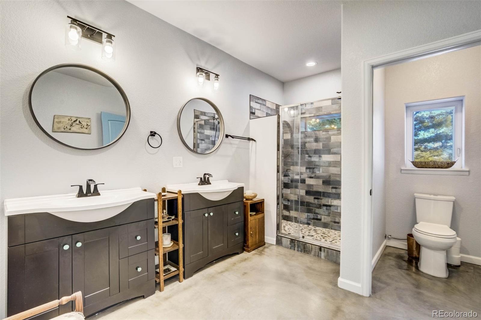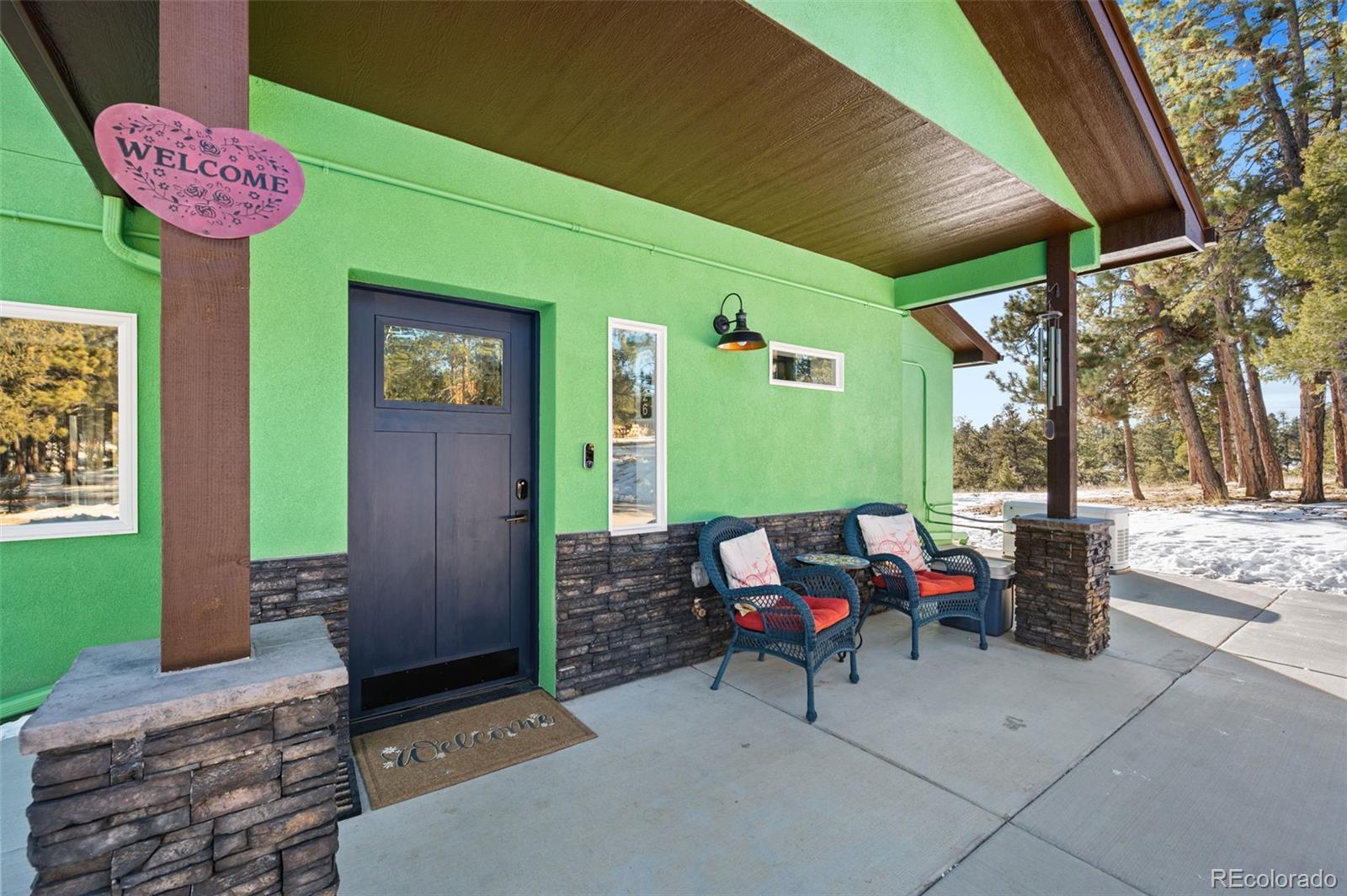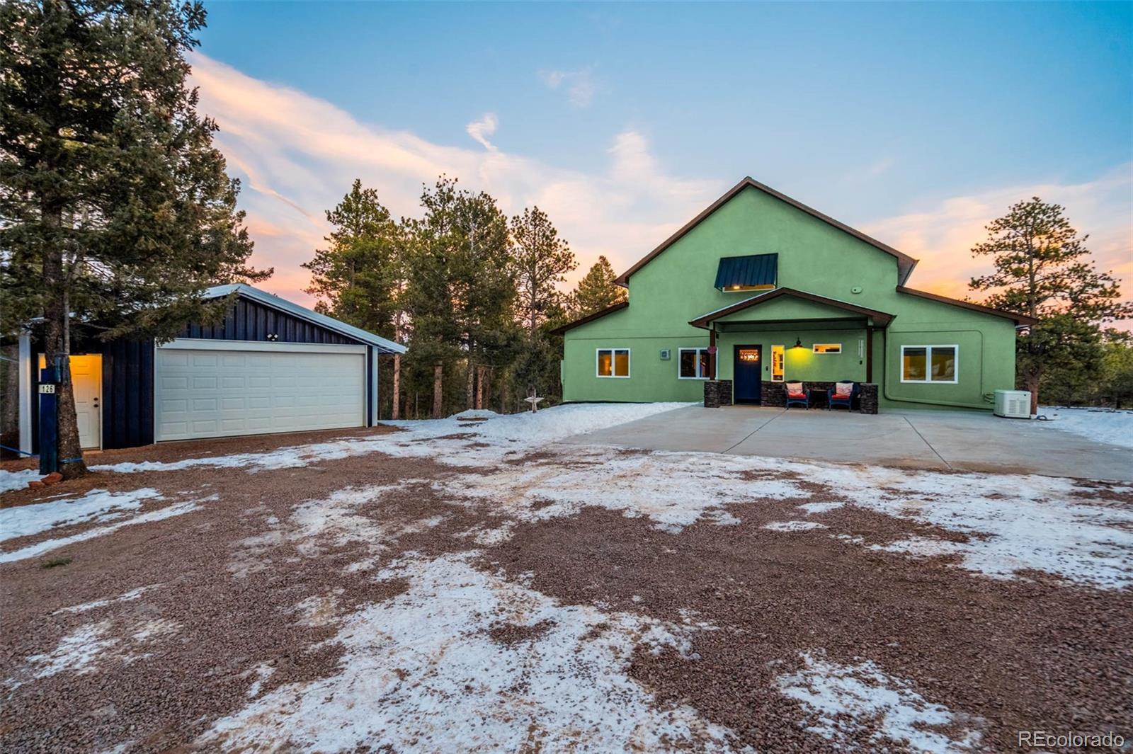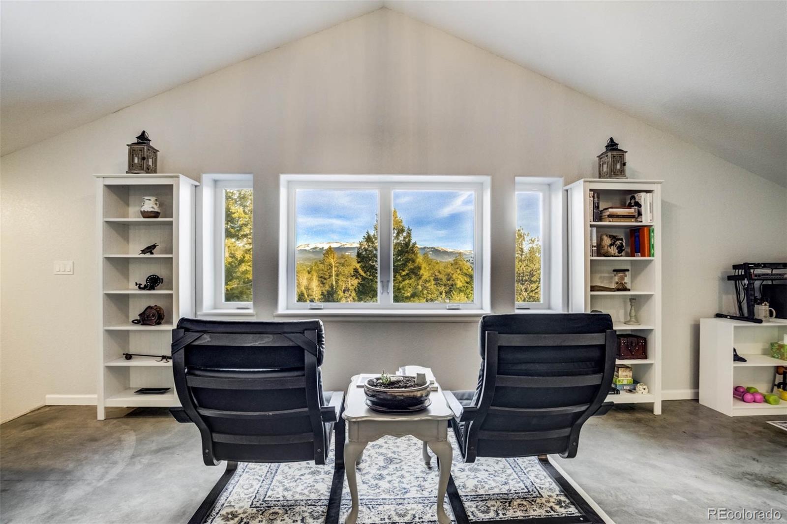 Thoughtfully designed and beautifully built, this custom concrete home offers a welcoming take on mountain living with sweeping views of Pikes Peak—bringing modern, city-style comfort to a peaceful mountain setting. Constructed with Injected Concrete Forms (ICFs), the home delivers exceptional strength, energy efficiency, and quiet comfort, complemented by in-floor radiant heating and a whole-home fresh air delivery system for year-round comfort. The main living area feels both open and inviting, with polished concrete floors, iron railing accents, a gas fireplace, and a striking 72" ceiling fan. The open layout allows the kitchen, dining, and living areas to flow naturally together, blending urban-style functionality with the surrounding landscape. The kitchen features stainless steel appliances and a penny tile backsplash for a clean, modern look. The primary suite serves as a peaceful retreat with a double vanity, walk-in closet, and a spacious walk-in tiled shower. Two additional bedrooms and a well-appointed bathroom provide flexible space for guests or other uses. Upstairs, a spacious loft captures a framed mountain view, creating an inviting space for a media room, home office, or reading nook. Deep walk-in storage adds practicality, while multimedia connections throughout the home support modern living. Outdoor living is just as inviting. Dusk-to-dawn lighting surrounds the home and illuminates the rear staircase leading to a tiered flagstone patio. A private hot tub looks out over sweeping mountain vistas, offering a relaxing place to unwind under the Colorado sky. Additional features include a tankless water heater, an automatic Generac 14kW generator, and a two-car garage with extra storage. Blending contemporary amenities with thoughtful design and natural surroundings, this home delivers modern comfort with a true mountain backdrop.
