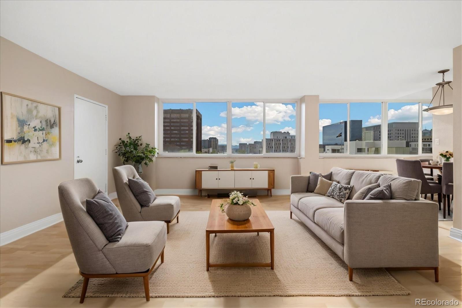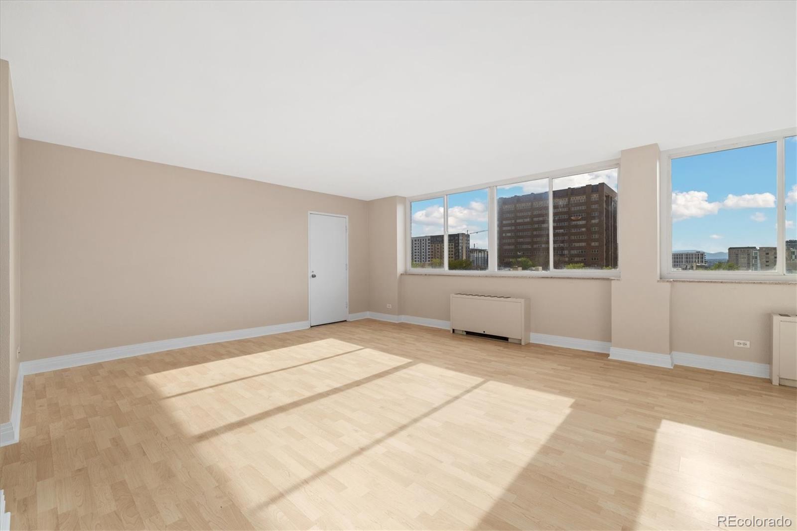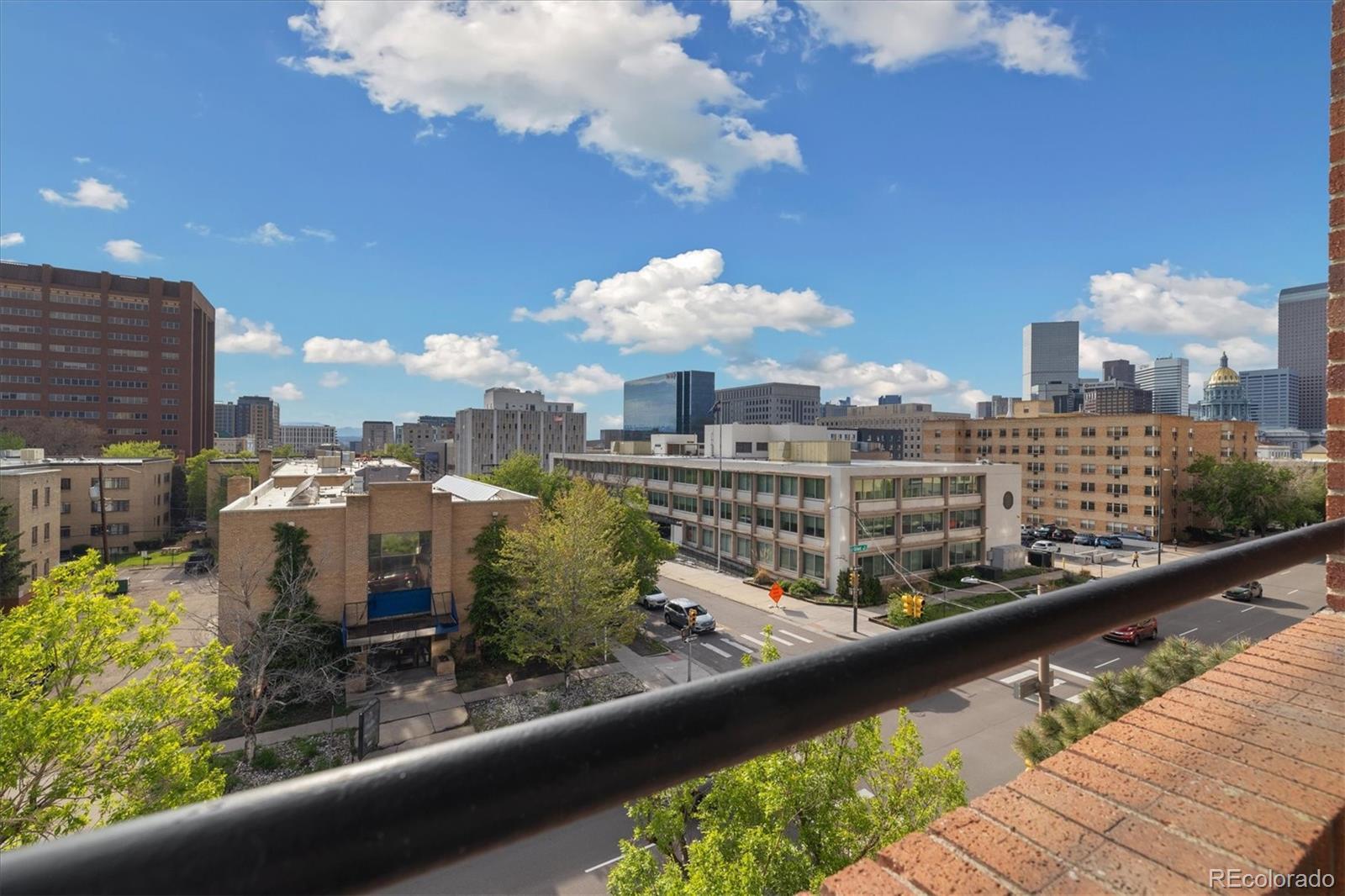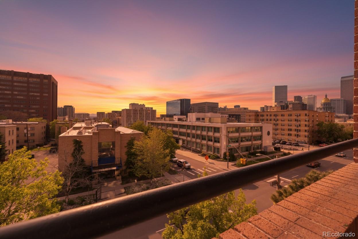 Prepare to be captivated by this stunning one-bedroom sanctuary at Gotham City Condos, where breathtaking mountain and city vistas meet the ultimate in Capitol Hill convenience! As one of the largest floor plans in the building, this residence offers an expansive, light-filled layout defined by large panoramic windows that perfectly frame the Rocky Mountain skyline. The most distinguished feature of this home is the rare, private covered balcony—one of only six in the entire building—providing a perfect front-row seat for spectacular Colorado sunsets. This property delivers incredible value with its own deeded parking space and additional deeded storage in the basement, offering rare assets in such a vibrant location. Inside, the home shines with fresh paint throughout and a kitchen designed for efficiency, complete with a gas stove, ample cabinetry, and a dedicated dining area. The bedroom serves as a comfortable retreat with plush carpeting and mirrored closet doors, while the updated bathroom is centrally located for easy access from both the living and sleeping areas. Financial ease is a cornerstone of life here, as the comprehensive HOA dues offer a true "lock-and-leave" lifestyle with all utilities included: electricity, gas for cooking, water, sewer, and trash. Residents also enjoy free laundry facilities and an array of amenities, including a fitness center, elevator access, secured fob entry, and a peaceful community patio garden. The building fosters an active and engaging atmosphere, hosting regular community-sponsored events and gatherings for residents to connect throughout the year. Perfectly situated just blocks from the Colorado State Capitol and Civic Center Park, the home offers exceptional proximity to major employment and education hubs MSU and CU Denver. Enjoy effortless access to neighborhood favorites like Trader Joe’s and City O’ City. This home is the perfect blend of historic character, modern ease, and the rare outdoor space.