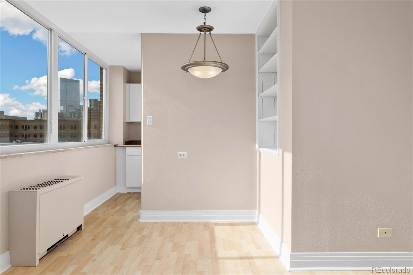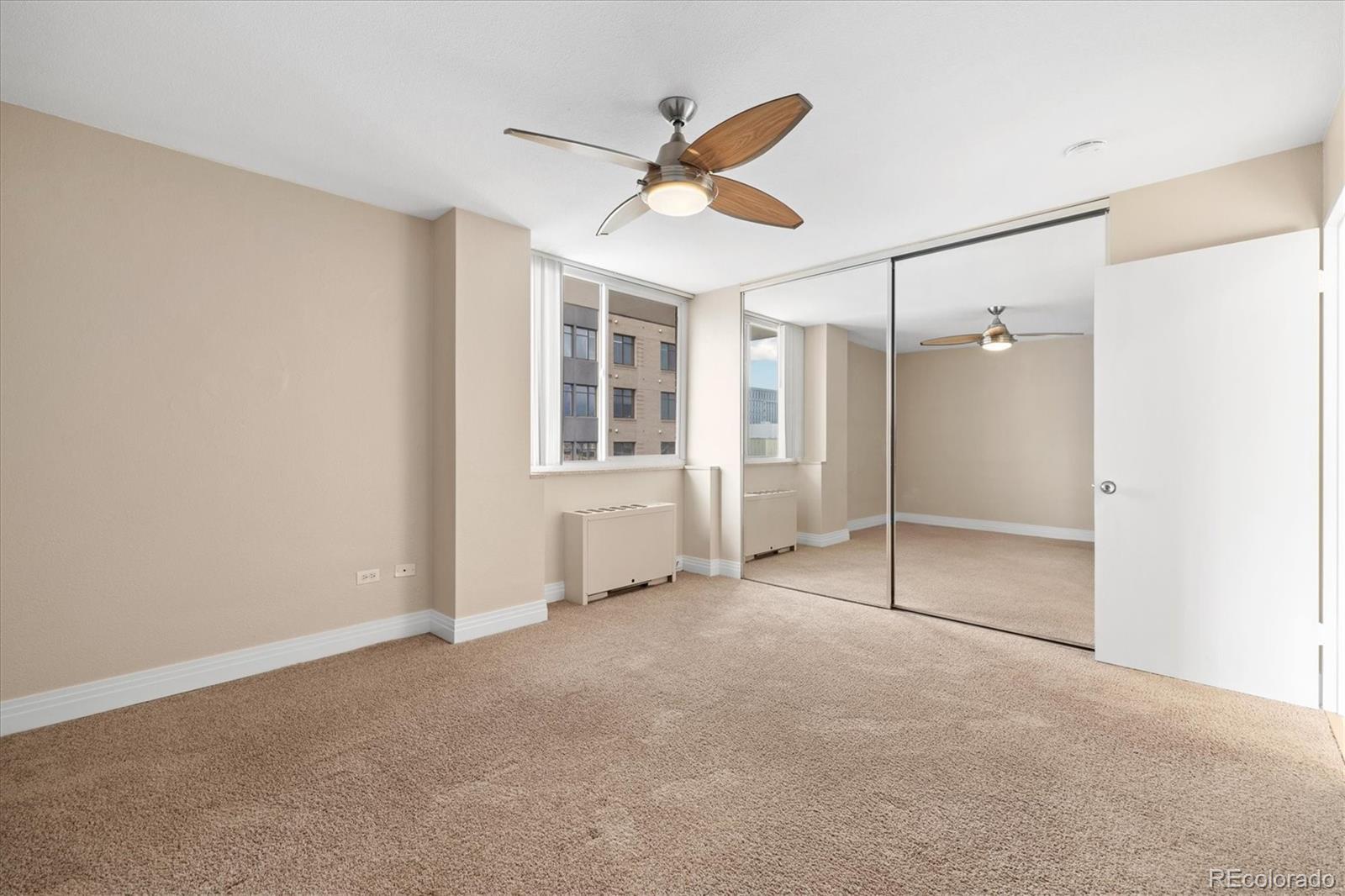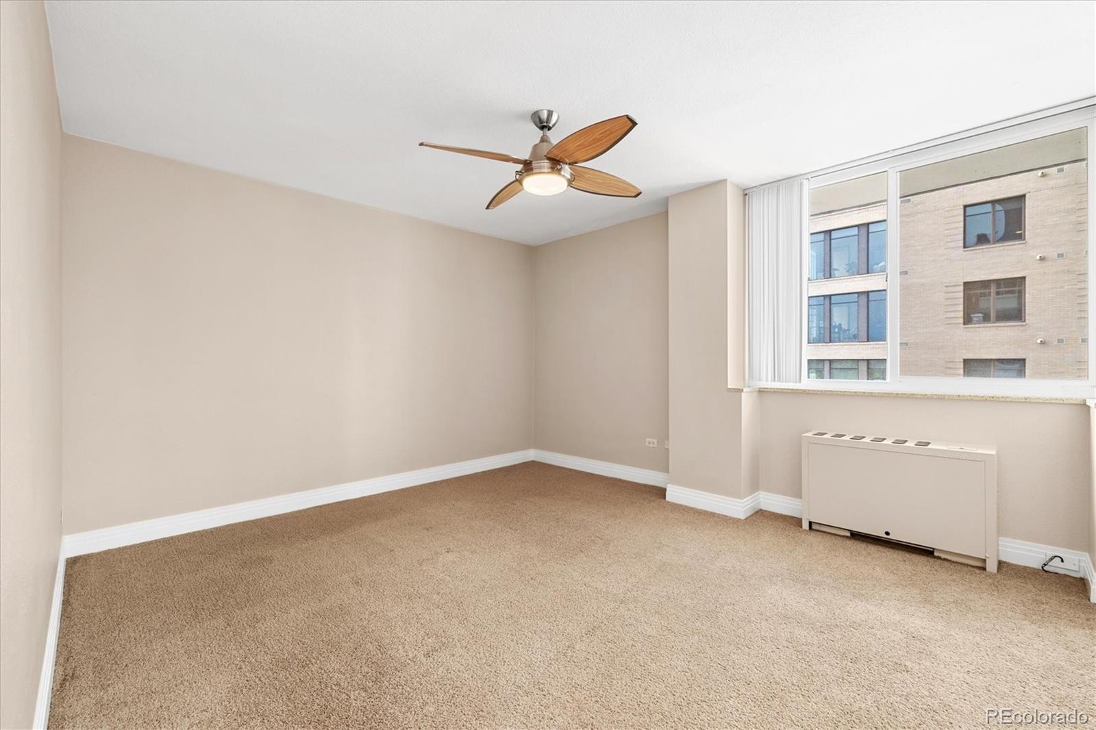 Prepare to be captivated by this stunning one-bedroom sanctuary at Gotham City Condos, where breathtaking mountain and city vistas meet the ultimate in Capitol Hill convenience! As one of the largest floor plans in the building, this residence offers an expansive, light-filled layout defined by large panoramic windows that perfectly frame the Rocky Mountain skyline. The most distinguished feature of this home is the rare, private covered balcony—one of only six in the entire building—providing a perfect front-row seat for spectacular Colorado sunsets. This property delivers incredible value with its own deeded parking space and additional deeded storage in the basement, offering rare assets in such a vibrant location. Inside, the home shines with fresh paint throughout and a kitchen designed for efficiency, complete with a gas stove, ample cabinetry, and a dedicated dining area. The bedroom serves as a comfortable retreat with plush carpeting and mirrored closet doors, while the updated bathroom is centrally located for easy access from both the living and sleeping areas. Financial ease is a cornerstone of life here, as the comprehensive HOA dues offer a true "lock-and-leave" lifestyle with all utilities included: electricity, gas for cooking, water, sewer, and trash. Residents also enjoy free laundry facilities and an array of amenities, including a fitness center, elevator access, secured fob entry, and a peaceful community patio garden. The building fosters an active and engaging atmosphere, hosting regular community-sponsored events and gatherings for residents to connect throughout the year. Perfectly situated just blocks from the Colorado State Capitol and Civic Center Park, the home offers exceptional proximity to major employment and education hubs MSU and CU Denver. Enjoy effortless access to neighborhood favorites like Trader Joe’s and City O’ City. This home is the perfect blend of historic character, modern ease, and the rare outdoor space.