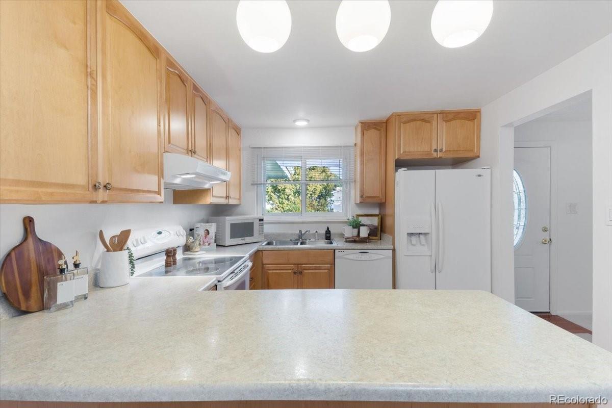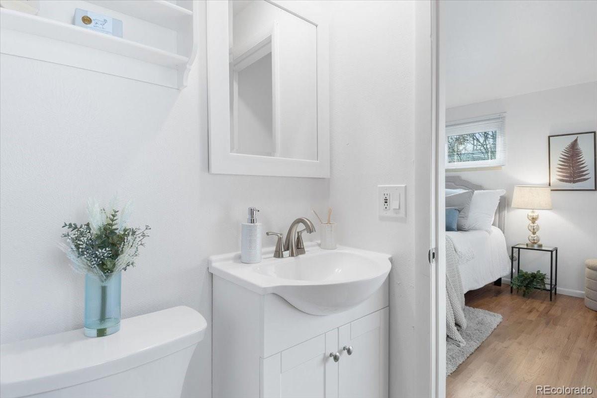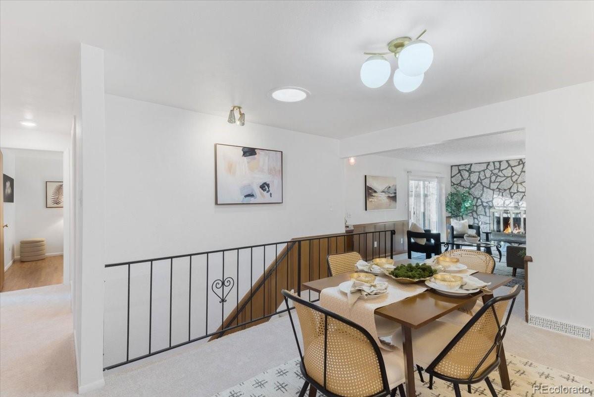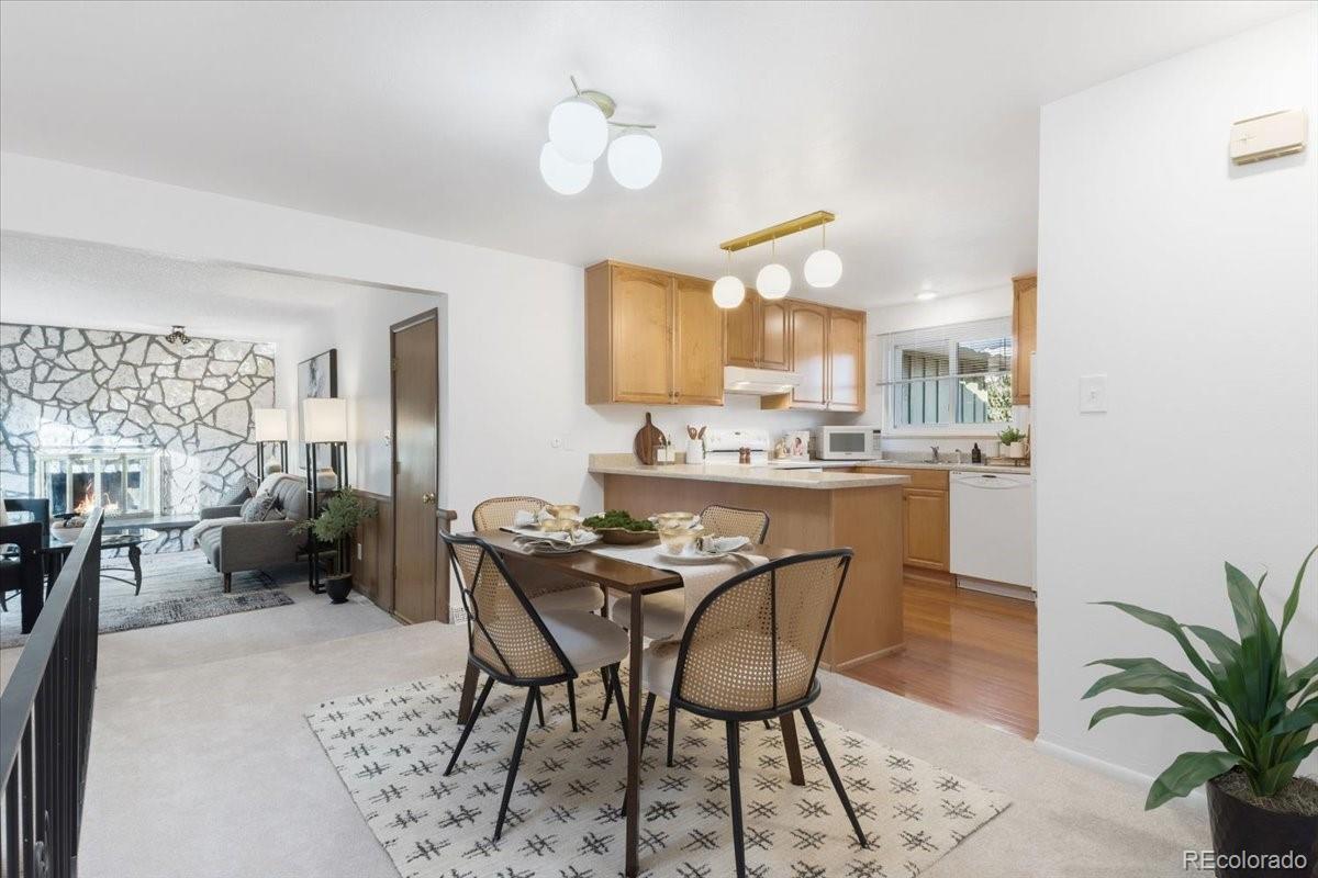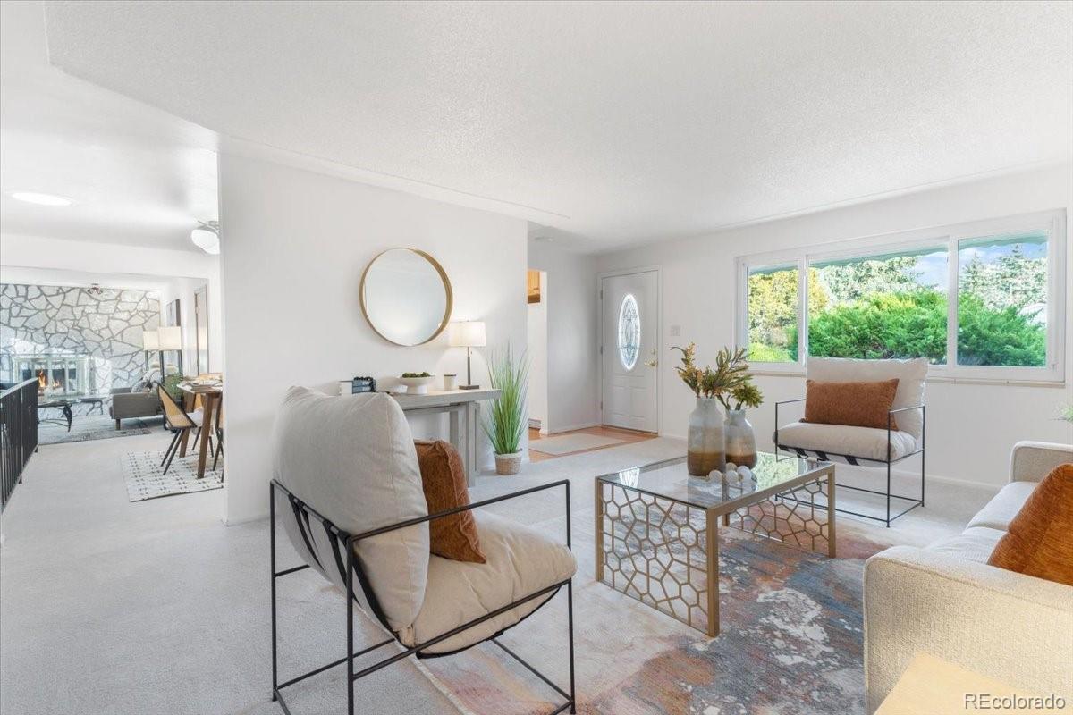 Welcome to this charming mid-century ranch in the heart of Lakewood’s Belmar Park — a home with timeless character & everyday comfort. Step inside the entryway & gaze immediately at the inviting front living room. A picture-style window stretches across the wall, filling the space with warm natural light and the perfect first impression. To the right, the kitchen features refreshed cabinets, countertops, flooring, and a touch of nostalgia: a window above the sink overlooking front porch. Just beyond the kitchen, the dining area sits beneath a skylight, creating a bright central hub that connects both living spaces. The second living room offers a different mood — relaxed, warm, and full of character. Floor-to-ceiling natural stone surround the fireplace, paired with classic wood paneling and glass sliding doors, make this space the perfect spot to unwind or host gatherings. All three bedrooms on the main level are comfortably sized and have gorgeous refinished hardwood floors. The primary bedroom features its own ¾ ensuite bath & a second full guest bath serves the hallway. Both upstairs bathrooms have been remodeled with new flooring, vanities, and toilets. The finished basement adds flexible space with a large open recreation room, a generous laundry area, a non-conforming bedroom with a closet, and an additional ¾ bath. This bonus square footage can easily adapt to any needs — hobbies, guests, storage, or a second hangout zone. Outside, the home sits on a nearly 10,000-sq-ft lot with a fenced yard, mature landscaping, concrete patio, and plenty of lawn for play, gardening, or pets. An attached two-car garage adds convenience, and the location is a quick drive from Belmar’s shopping, restaurants, parks, trails, and all the best that Lakewood offers — and no HOA! Experience this home in person by visiting the scheduled public open houses or booking a private showing. This rare Belmar Park gem is ready for its next chapter — come make it yours.