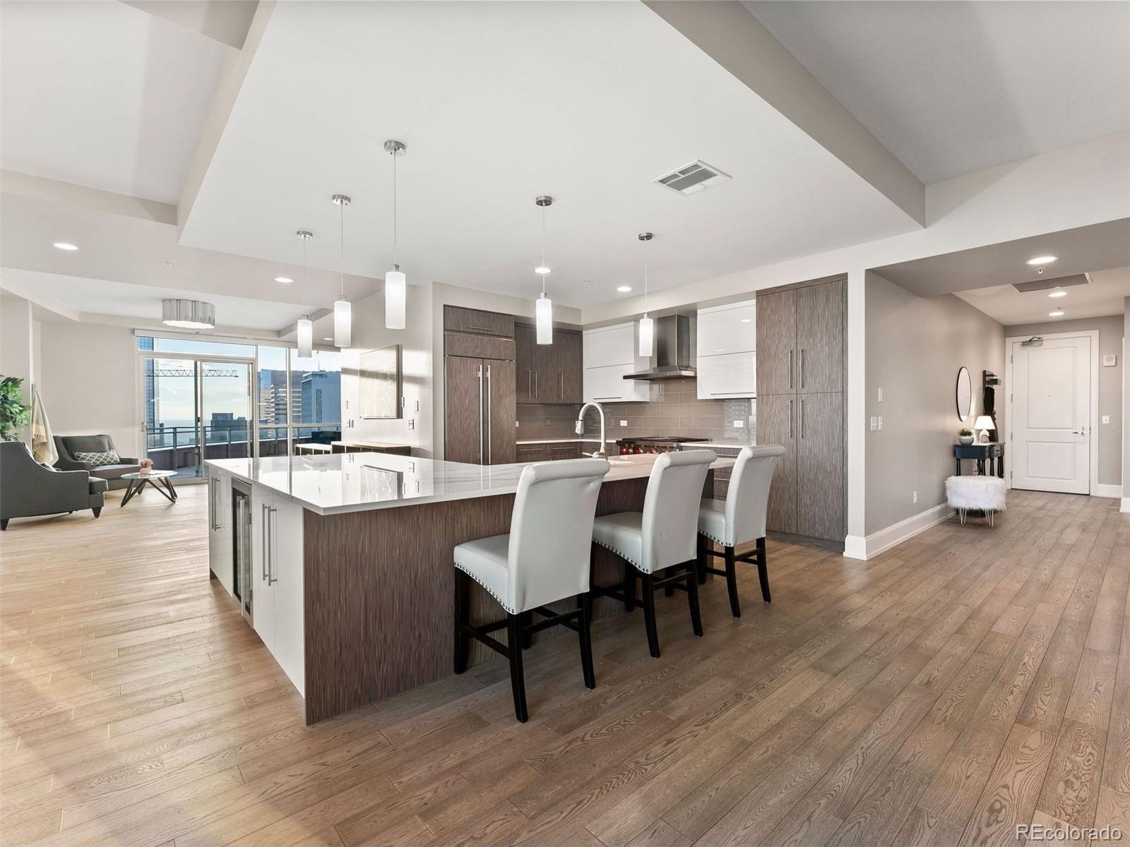 ALFRESCO LIVING on THREE terraces. 1100 SF TERRACE, PRIVATE terraces off primary and 3rd terrace off dining. This designer sanctuary offers unparalleled views, blending the vibrant cityscapes with the serene peaks of the Rocky Mountains. The reimagined Kitchen design sets the stage for culinary excellence with Professional Wolf and Sub-Zero appliances, custom cabinetry, and temperature-controlled wine storage. All encased in the oversized corner island anchoring the kitchen. The jewel box living room is framed on one end by a fireplace and media zone. Inversely, a formal cocktail lounge, occupies the other side. It has the size to cultivate any dream design while thoughtfully curated to provide an ambiance of sophisticated urban living. The residence wing is conveniently enclosed behind double doors. The Primary Suite, offering breathtaking city views from a private patio, a lavish five-piece bathroom adorned w/ herringbone Calcutta tile, Display wall and walk-in closet room. Also behind the double doors is a Guest Suite promising equally stunning views, a lavish guest bathroom with/ dual sinks, a soaker tub, and a walk-in shower adorned with artisan tile work. The STUDIO 3rd bedroom has an en-suite bath, walk in close, a wall of windows framing the private terrace. The BUILT-IN THEATRE can also be a 4th NC GUEST SUITE/OFFICE/GYM. One Lincoln Park resort lifestyle includes a private penthouse-level elevator, 24/7 concierge, Owner’s Club, Infinity Pool & Spa, and Fitness Center w/ Private Studios. Parking(2), utilities, media package = $500 monthly. Applicant has the right to provide landlord with a Portable Tenant Screening Report (PTSR) that is not more than 30 days old, as defined in Section 38-12-902(2.5), Colorado Revised Statutes 2)if Applicant provided landlord with a PTSR, landlord is prohibited from a)charging Applicant a rental application fee; or b)charging Application a fee for landlord to access or use the PTSR.