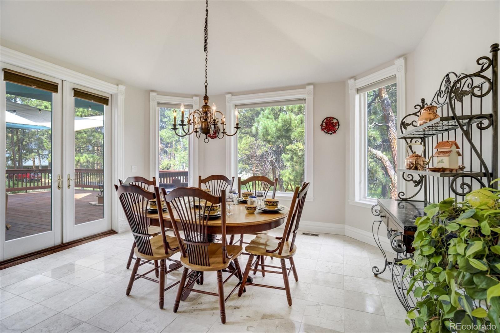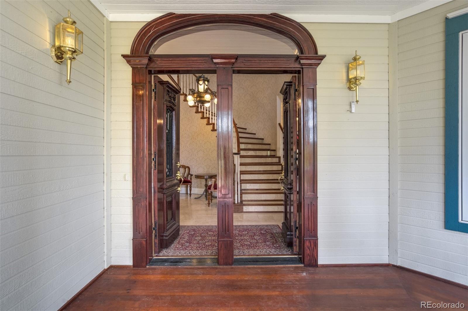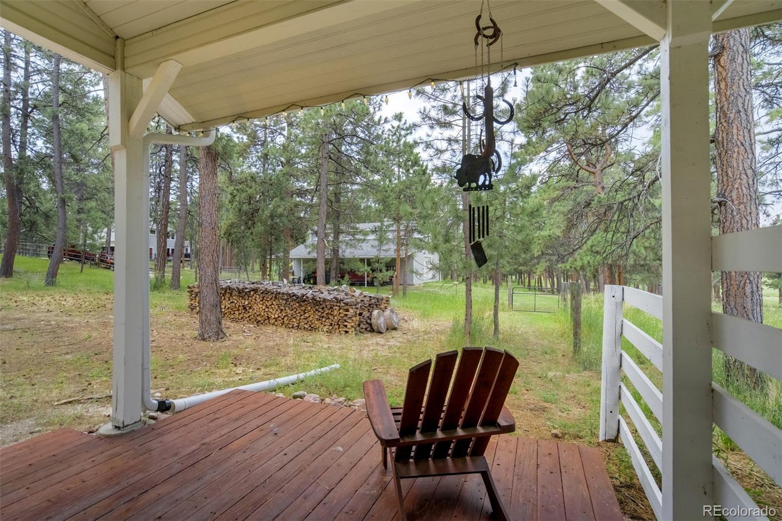 Welcome to this exquisitely maintained Victorian-style estate set on 5.59 private acres, zoned for horses and fully fenced and cross fenced. This Painted Lady offers timeless elegance with modern updates like a newly installed Class 4 roof. From the moment you step through the Argentinian double doors into the marble-tiled foyer with its dramatic curved staircase, you'll be captivated by the attention to detail—imported chandeliers, transom windows, aluminum clad Pella casement windows, 8” baseboards, high ceilings, and intricate trim grace this unique home. The main level features two spacious living areas, including a cozy sitting room with turret windows and gas fireplace with antique mantel, and a dramatic great room with a soaring 23-foot cathedral ceiling and massive brick fireplace. The chef’s kitchen offers soapstone counter tops, copper sink, large pantry, dual fuel stove/oven + warming drawer, concealed dishwasher and under counter lighting. The built in planter box is ideal for growing herbs year-round. The kitchen opens to the massive redwood deck with multiple sail shades, bringing the Colorado outdoors home. Upstairs, the luxurious primary suite includes a vaulted ceiling, turret windows, 5-piece bath with jetted tub, and a custom walk-in closet. Two additional bedrooms, a full bath, and a stately, built in library complete the level. The finished basement adds a kitchen, dry sauna, a bedroom & a full bath, plus a home theater that includes all AV equipment, speakers, screen, library of movies and theatre-type seating. The fully insulated & heated 3-car garage boasts 14’ ceilings, epoxy flooring, a Bend Pac 4 Post 9000 lbs. auto storage lift, and kennel with access to an exterior fenced area. The studio apartment/tack room features a 60x50 barn that includes 4 stalls, tack room, 2 RV garages, and 350’ of fully finished living space with 3/4 bath and kitchenette. Just 10 minutes to I-25, 13 minutes to the new Flying Horse King Soopers.