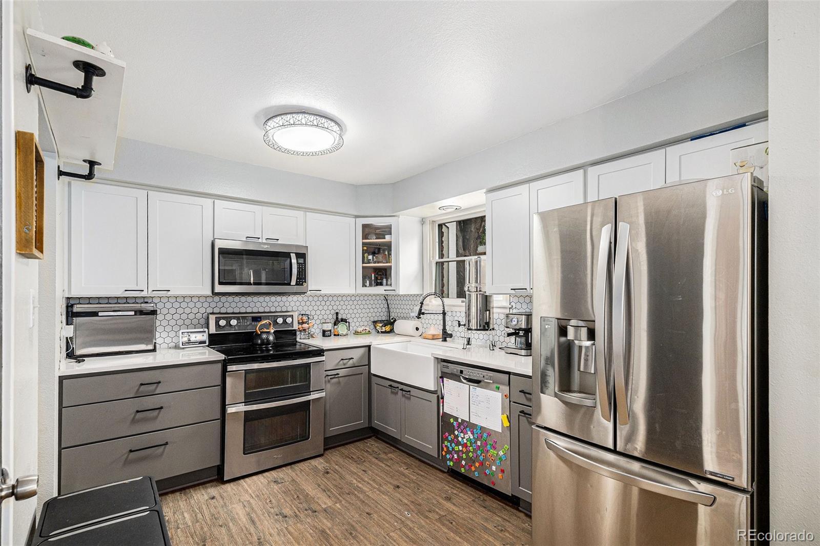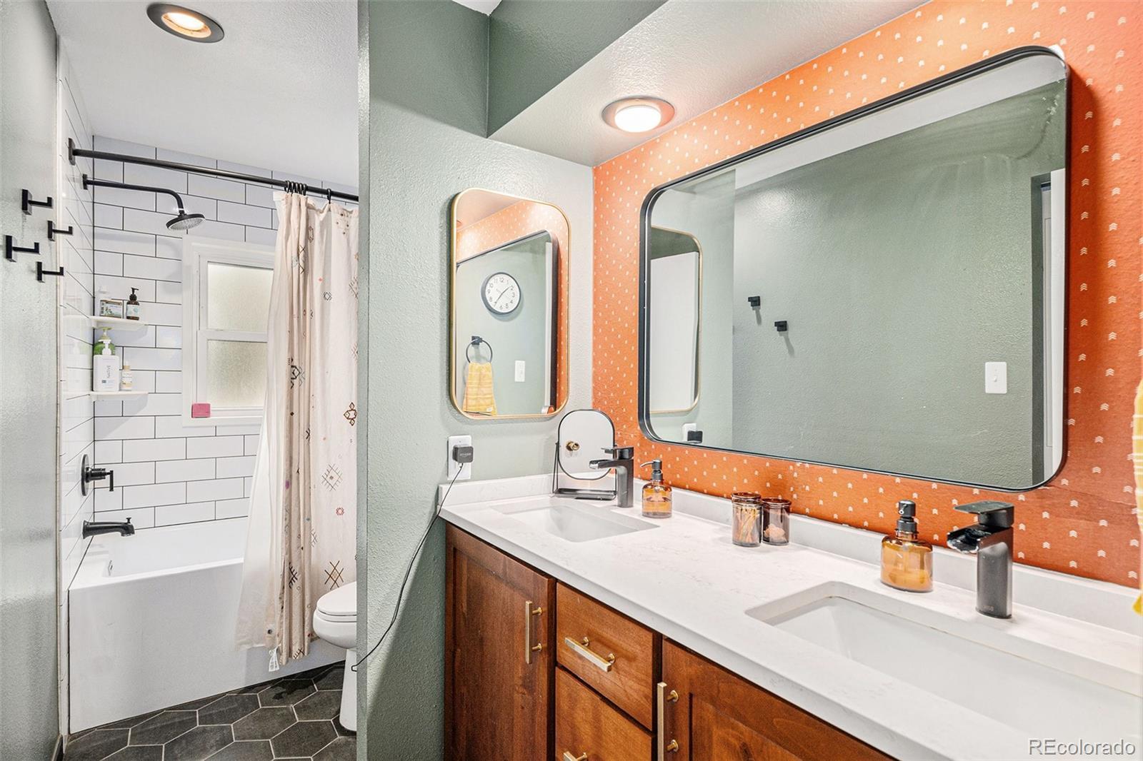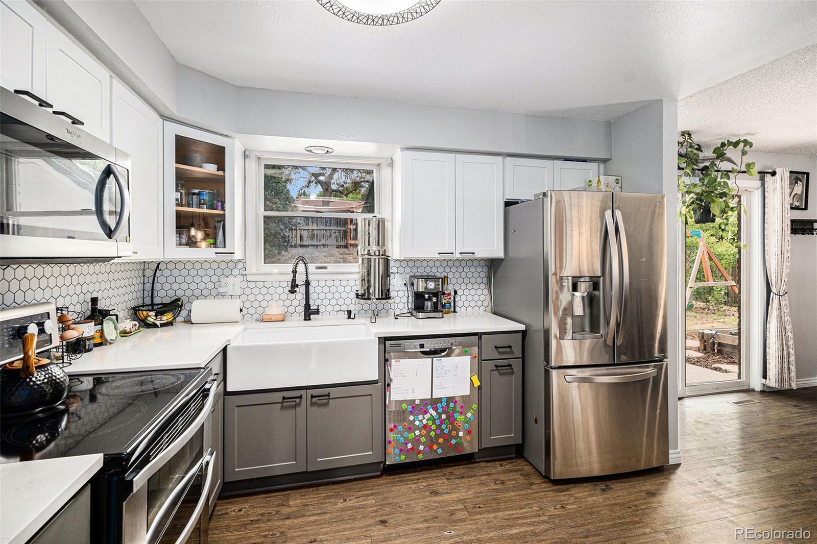 Beautifully updated and remodeled 4-bedroom, 2-bath home with modern finishes and flexible living spaces—move-in ready and packed with upgrades. Highlights include: *Brand new exterior paint *Fresh interior paint + new flooring on the main level *Gutted and remodeled kitchen with sleek finishes and ample cabinetry *Completely renovated primary bathroom with spa-like updates *Two spacious living areas, including a lower-level family room with gas fireplace + extra closet space *Versatile 4th non-conforming bedroom ideal for guests, office, gym, or playroom *Large storage/workshop area *Access to backyard from lower level* Attic fan and A/C for your temperature comfort needs. Major Updates and Outdoor areas: *Full roof replacement with Class 4 impact resistant shingles to be installed before closing. *New Water Heater (2025) *New retaining walls (2024) *Mature trees with garden area, hops trellis, kids play set, and trampoline included. *Vivint Security System paid in full and included *Brand new Garage door opener with Bluetooth capabilities. Location Perks: *Steps from a large park with new playground + pickle ball courts, bike and skate park across the open space *Only 10 minutes to Cherry Creek Reservoir Lender incentives available—schedule your showing today!