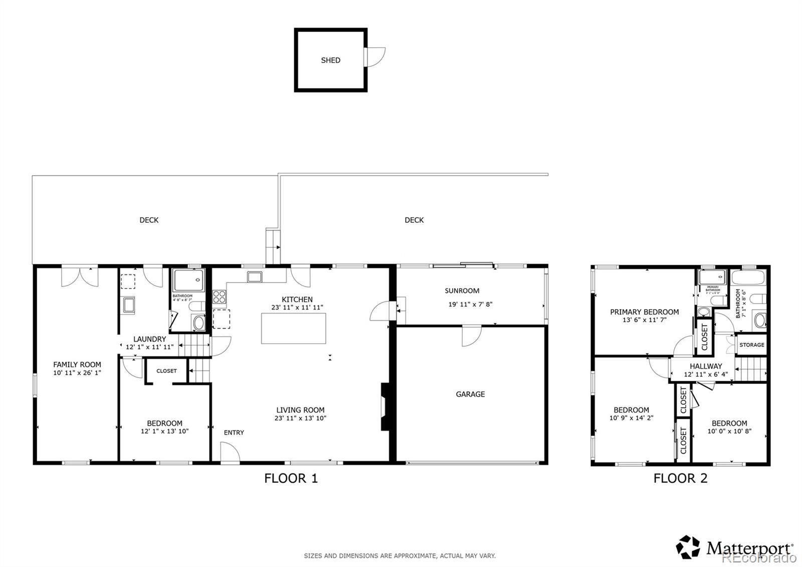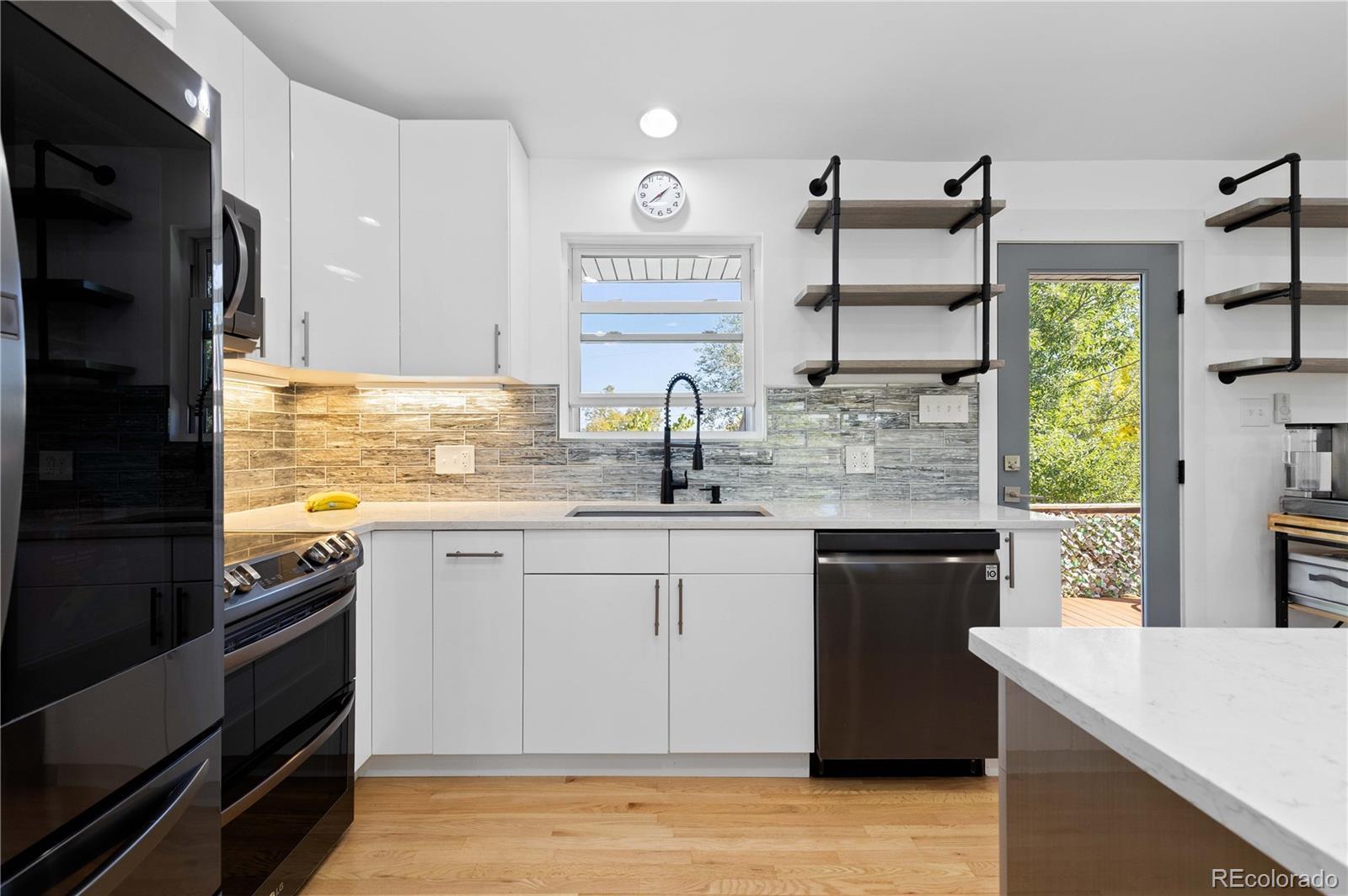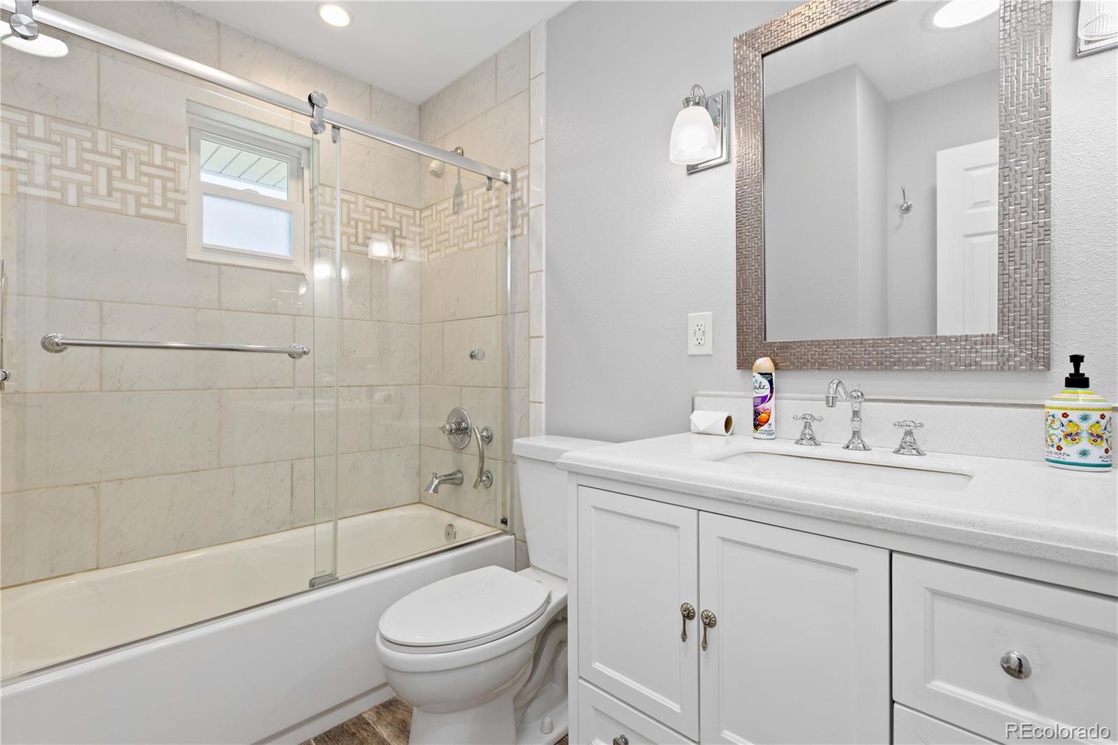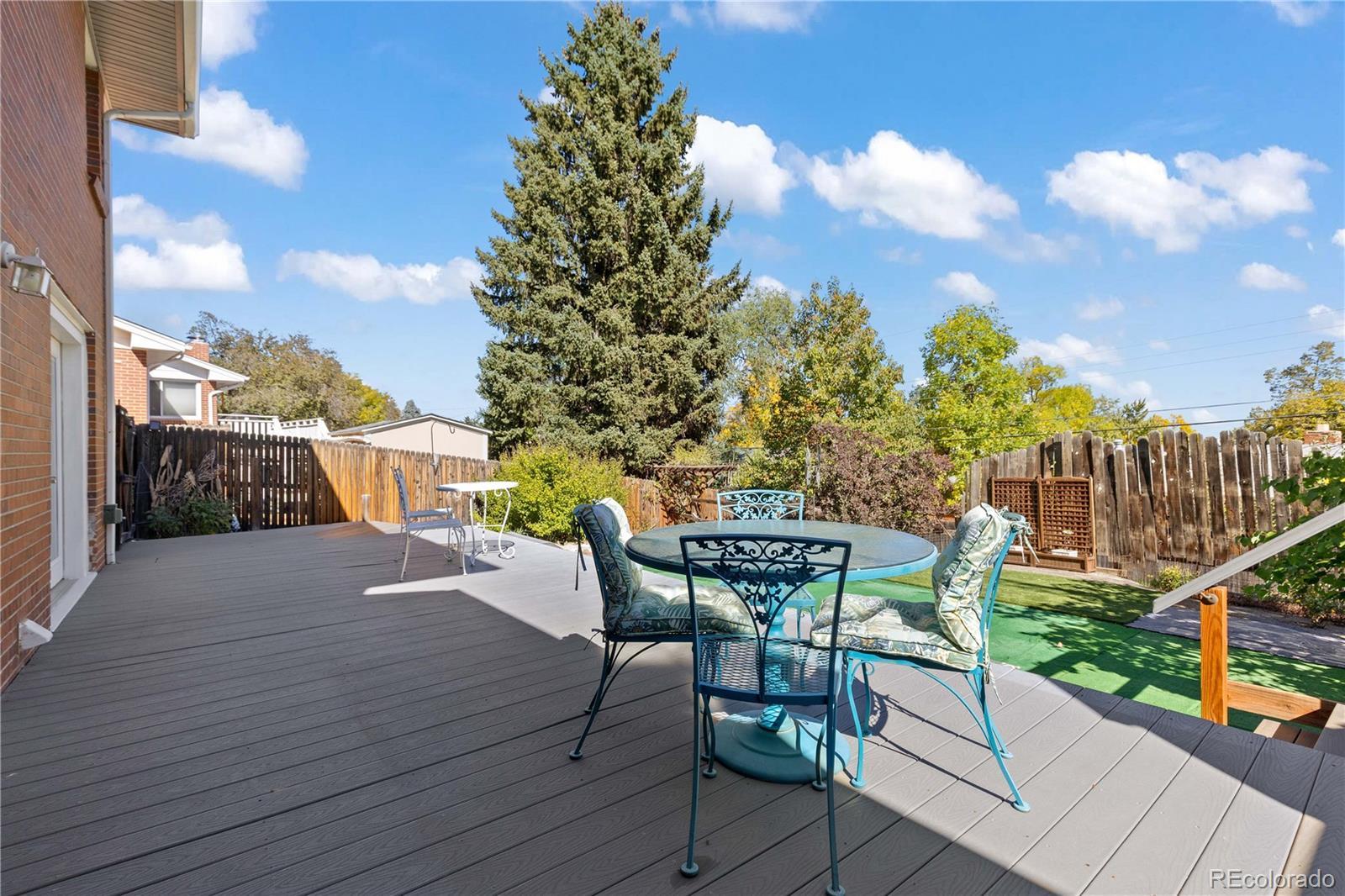 Beautifully updated brick multi-level gem in a great Littleton location with no HOA. This charming home sits on a beautifully landscaped lot and offers an easy lifestyle with lovely city views. Enjoy energy efficiency and a wonderful outdoor setting with big decks, a garden area, and a spacious backyard perfect for entertaining. The home includes both upper and lower level washer/dryer connections and can easily be configured to accommodate an in-law space if desired. The quiet neighborhood is a true highlight, offering the convenience of walking to most amenities, two nearby parks—one with a pool and tennis courts—plus good schools and a daycare close by. This tri-level design provides comfort and accessibility throughout. The open-concept living room and eat-in kitchen flow together seamlessly, united by gorgeous hardwood floors and vaulted ceilings. The chef-worthy kitchen shines with modern updates, while a bright and sunny sunroom off the kitchen adds even more space to relax or entertain. Finished 160' sunroom off the kitchen (not reflected in overall sq ft) is the perfect sunny spot to relax after a long day. Upstairs, you’ll find three generous bedrooms with hardwood floors. The primary retreat features a chic en-suite bath with pebble rock flooring that continues into the stylish walk-in shower. The lower level offers another bedroom, a large family room with access to the backyard, and great flexibility for multi-generational living or guests. Outside, the home offers two driveways with space for an RV, a large patio, and a lovely shed that blends perfectly into the serene, tree-filled backyard. Major updates include remodeled bathrooms (2019), a new heating system (2018), roof (2017), evaporative cooler (2022), remodeled kitchen and great room (2020), new sewer system from house to street (2021), and an enclosed sunroom (2022). This is a move-in-ready gem in a peaceful, well-cared-for community.