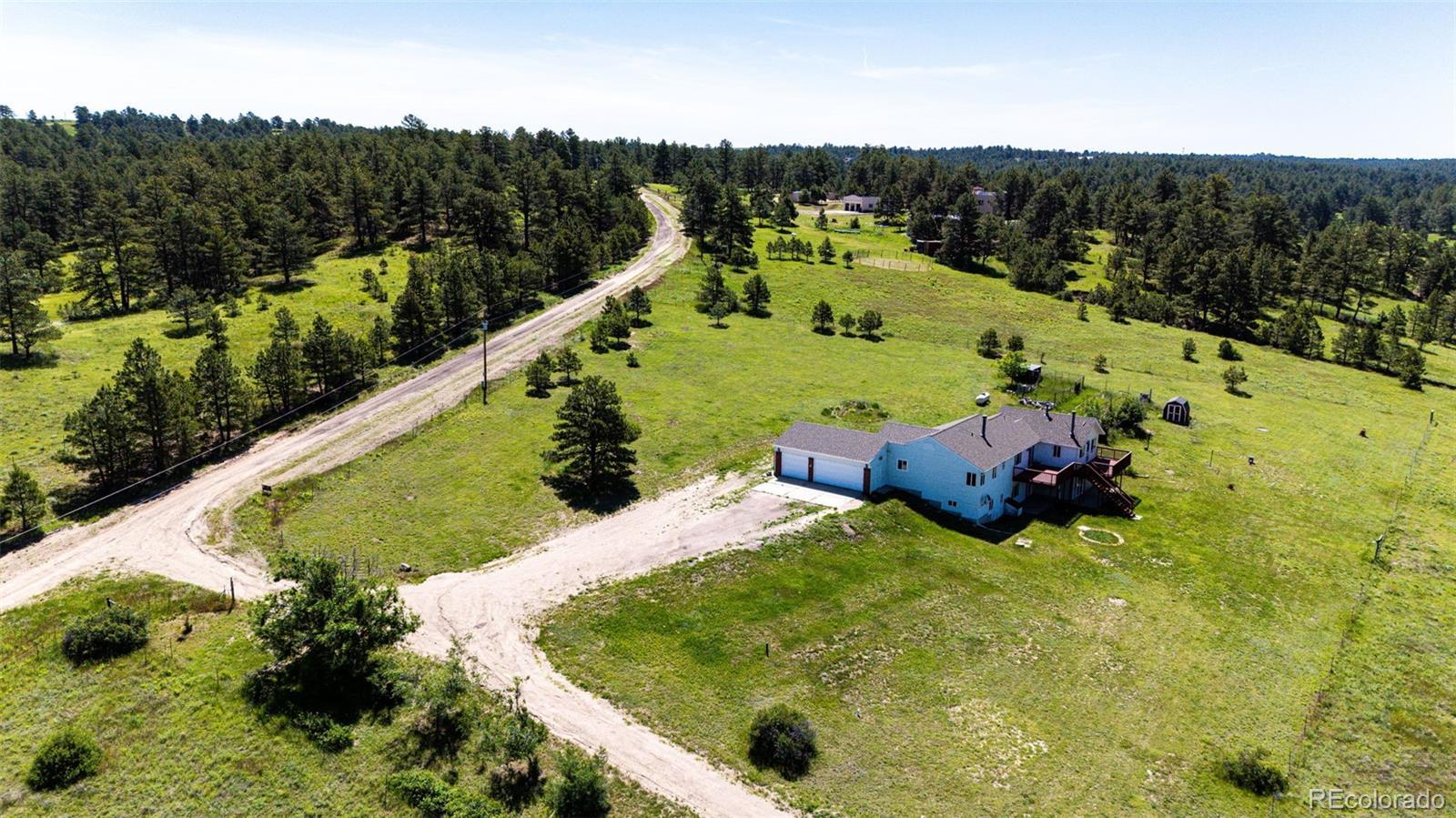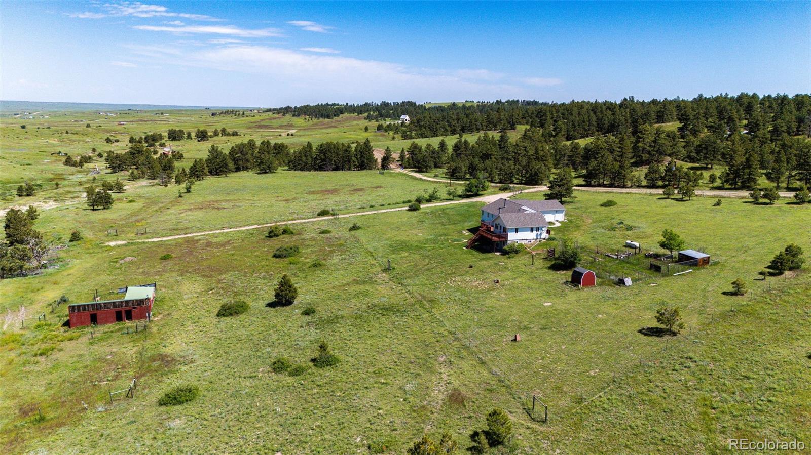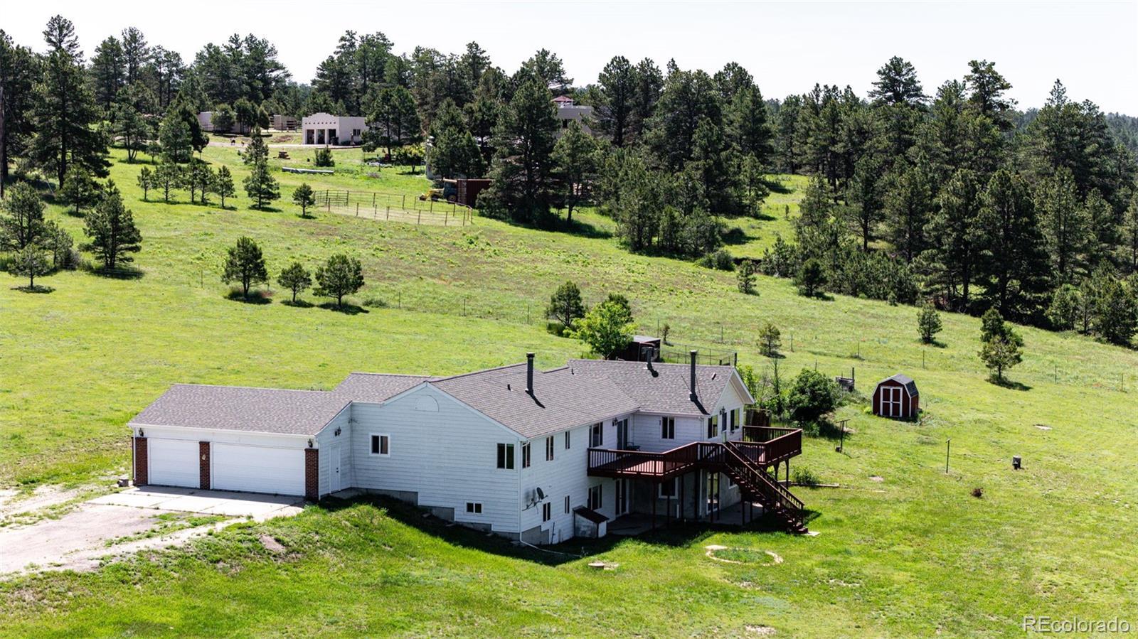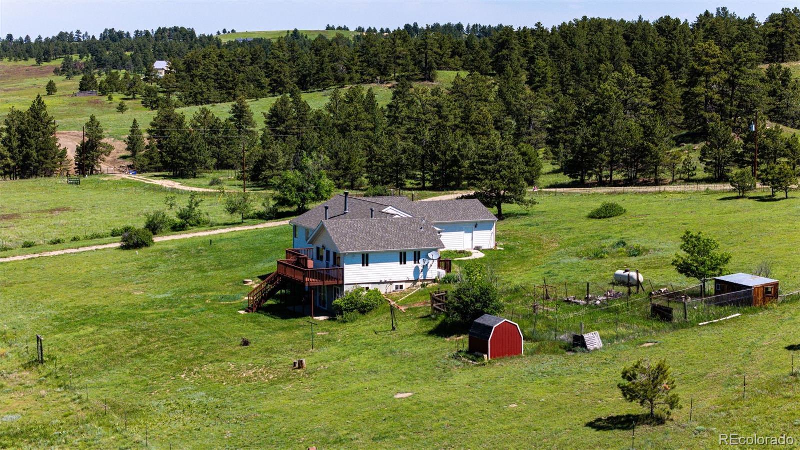 !!! Seller is offering a $5000.00 towards seller concession !!!Amazing 35 acre fully fenced property! Plentiful pastures perfect for horses and livestock with mature trees surrounded by peace and quiet, complete with a unique seasonal flowing creek. Recently updated, move in ready home offering approx 3500 sq. ft. with an open layout perfect for entertaining and main level living with 4 bedrooms and 4 bathrooms. The finished basement is complete with a second primary suite and a huge game room. Large deck boasting incredible views of the front range where the wildlife roams. Complete with barn, chicken coop, sheds and gardens ready for planting. Located on a dead-end road with minimal traffic. Only 90 minutes to Denver, 60 minutes to Denver International Airport, 45 minutes to Parker and less than 30 minutes to Elizabeth. Let this property serve as your personal paradise for year round or seasonal living.