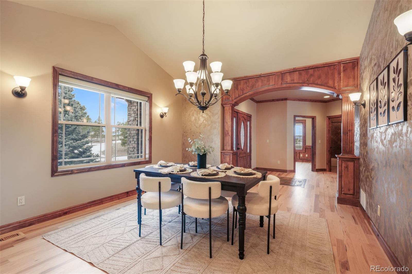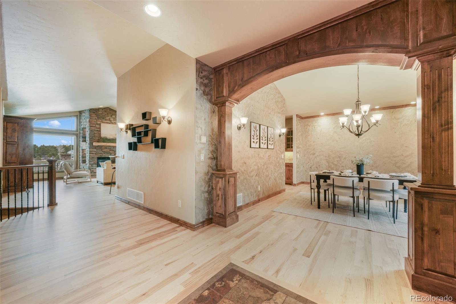 Set on 5 private acres in the desirable Wildwood Ranch Estates community of Black Forest, this stunning custom ranch-style home offers 4,626 square feet of beautifully designed space. Exceptional curb appeal welcomes you with a circular driveway, four-car attached garage, and striking stucco-and-stone exterior with a covered front porch. Inside, hardwood floors, custom wood accents, and high-end finishes create a warm yet elegant atmosphere. A formal dining room sits just off the entry, while a main-level bedroom with an adjacent full bath is perfect for guests or a private office. The inviting living room features a dramatic stacked-stone gas fireplace, knotty alder built-ins, and expansive windows that fill the home with natural light.The chef’s kitchen is the true centerpiece, showcasing stainless steel appliances, a double oven with gas cooktop, warming drawer, microwave, hood vent, knotty alder cabinetry, large walk-in pantry, and oversized island ideal for entertaining. The main-level laundry room includes a sink, granite countertops, custom cabinetry, and a window. Retreat to the spacious primary suite, complete with its own stacked-stone gas fireplace, plantation shutters, and private access to the expansive composite deck. The spa-like bath features dual granite vanities, a soaking tub, walk-in shower, and a custom closet.The finished walkout basement is built for entertaining with a large recreation area, media room, wet bar with mini fridge, microwave, and sink, plus three additional bedrooms — two connected by a Jack-and-Jill bath. Step outside to exceptional backyard privacy featuring a beautiful concrete patio framed by stacked stone pillars, creating a peaceful setting ideal for relaxing or gathering with guests. Zoned for horses and equipped with well and septic for lower utility costs, this immaculately maintained home also offers central air and three fireplaces. A rare blend of luxury, privacy, and Colorado beauty — truly a must-see.