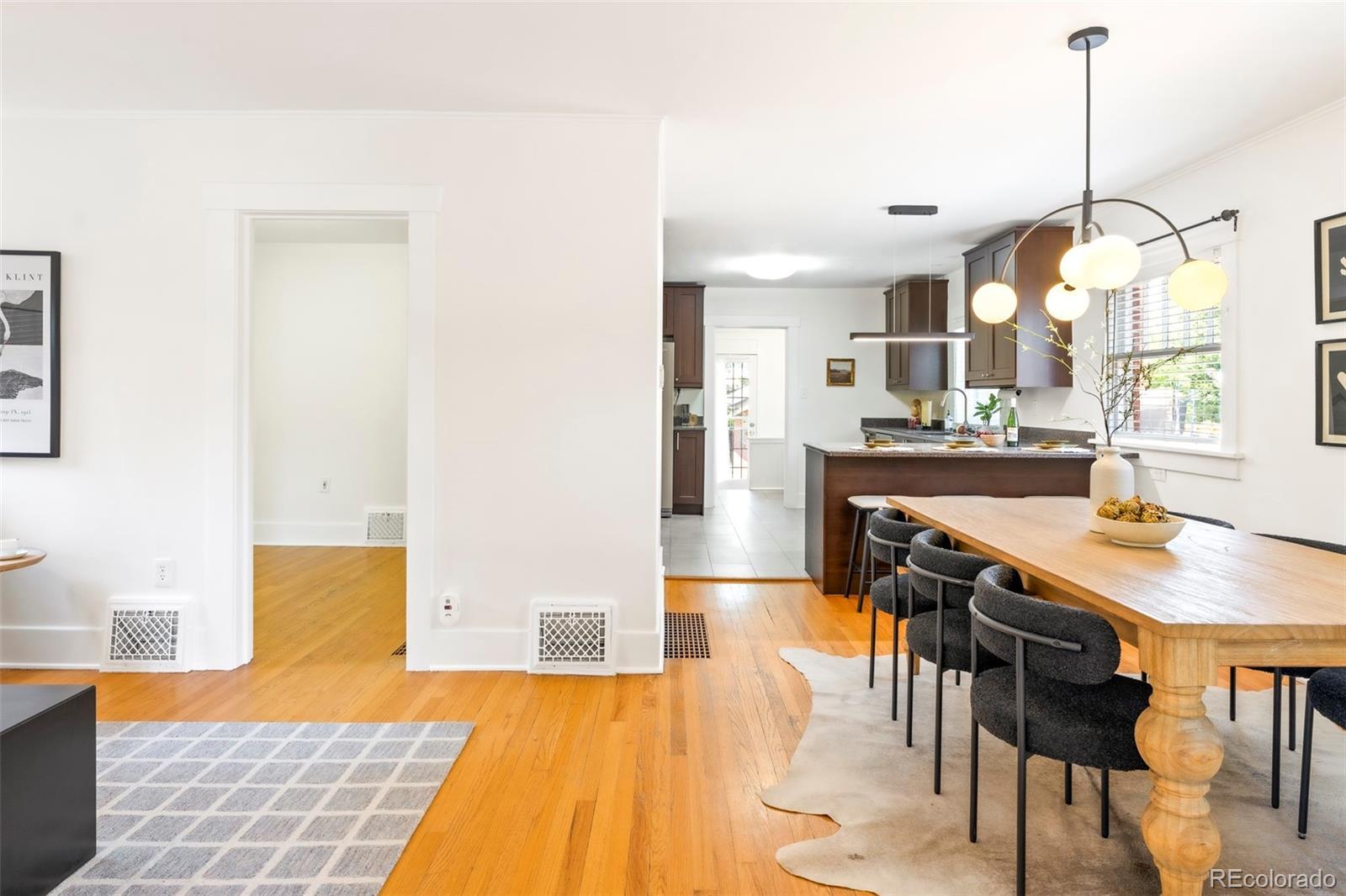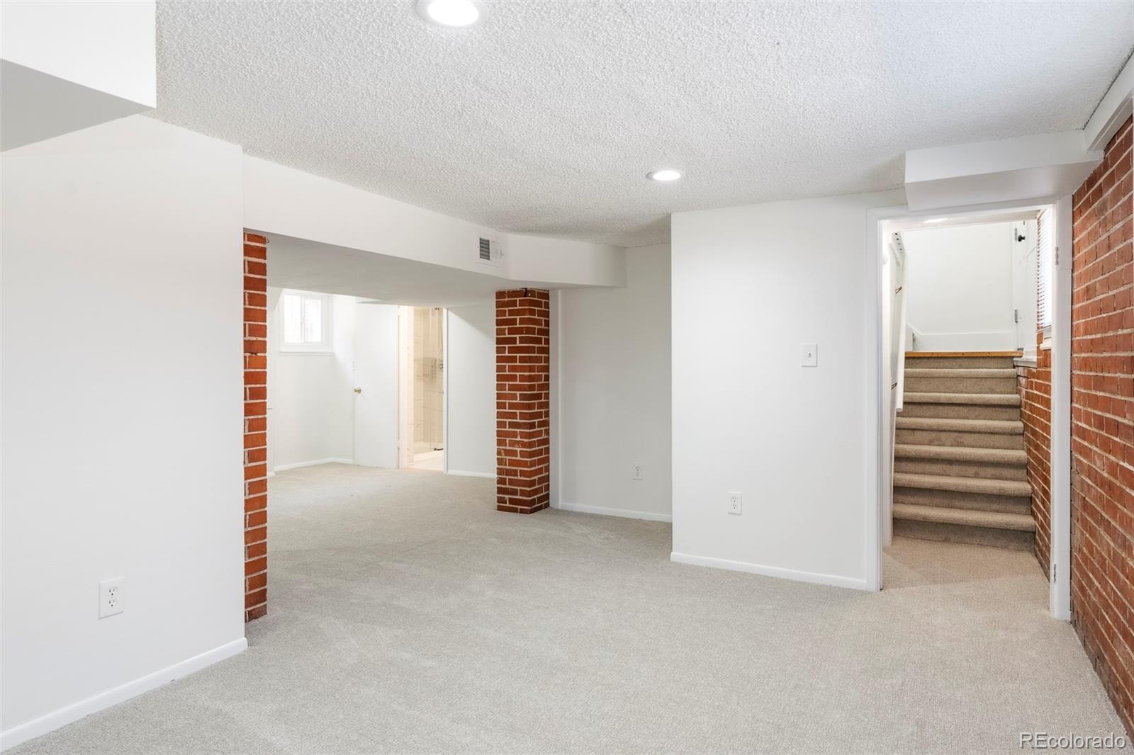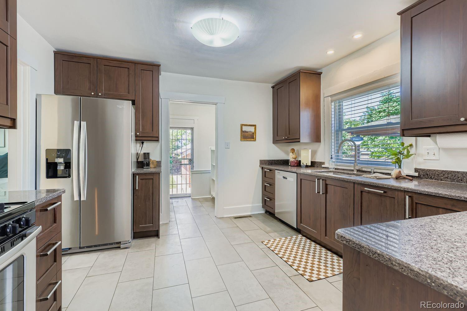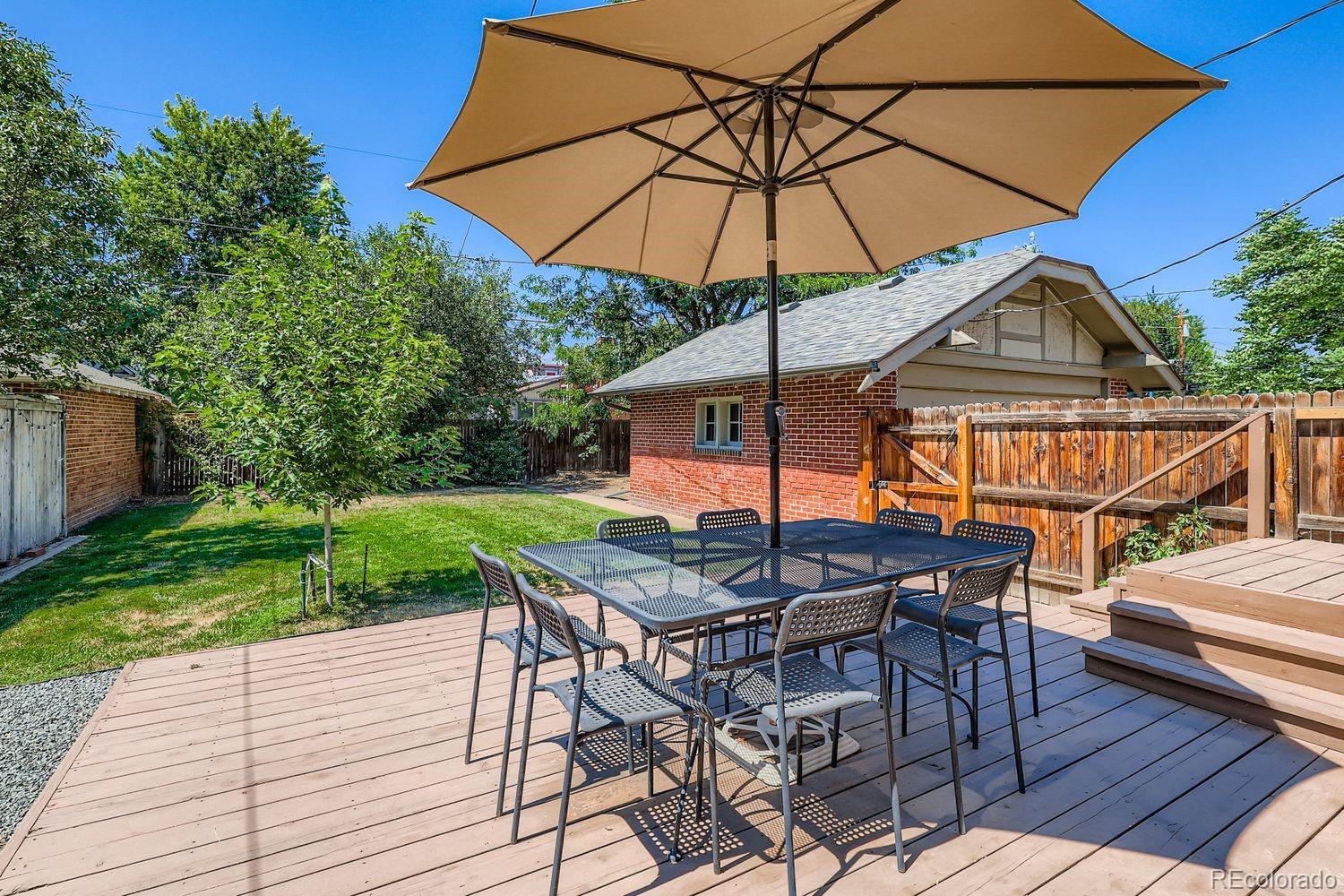 Classic charm meets modern refinement in this classic red-brick bungalow, gracefully poised on a rare 6,620-square-foot lot in West Wash Park. A spacious covered front porch sets the tone for serene mornings and effortless connection with the neighborhood. Inside, hardwood floors lead through an airy dining and living space anchored by a wood-burning fireplace. The kitchen is a contemporary centerpiece, boasting quartz countertops, peninsula seating, and newer stainless steel appliances. A tranquil main-floor primary bedroom overlooks the landscaped backyard, joined by a versatile secondary bedroom or office and a newly reimagined bathroom. A light-filled mudroom with custom shelving offers both style and function. Downstairs, a garden-level primary or third bedroom unfolds as a private retreat with a chic, renovated bathroom, recreation room, flex space, laundry and storage— all enhanced by a statement brick wall and fresh carpet. Outdoor living is redefined with a newer dining deck, privacy fencing, and abundant green space. A two-car front-load garage with potential alley access adds rare convenience. Perfectly positioned near Wash Perk coffee, S. Gaylord Street, and the culinary gems of S. Pearl — including Sushi Den — this home embodies a seamless blend of architectural heritage, modern comfort, and a vibrant city lifestyle.