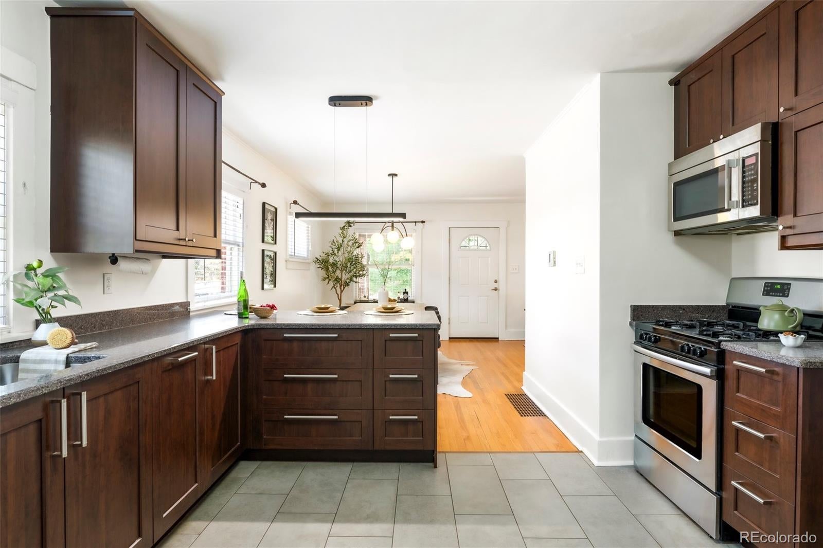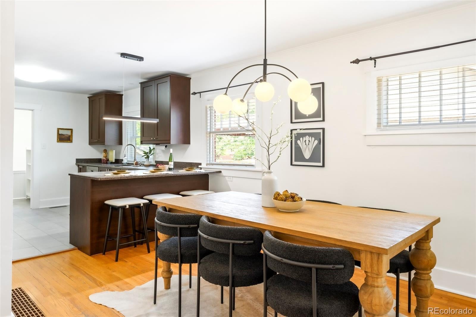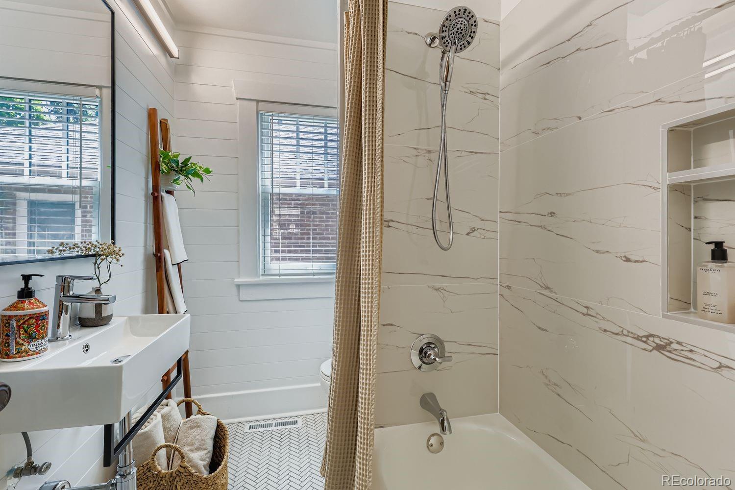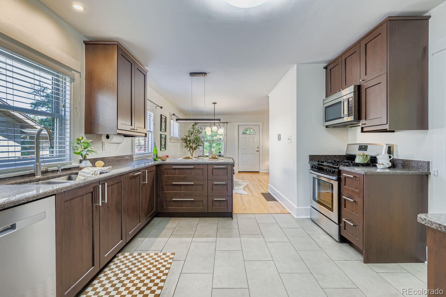 Classic charm meets modern refinement in this classic red-brick bungalow, gracefully poised on a rare 6,620-square-foot lot in West Wash Park. A spacious covered front porch sets the tone for serene mornings and effortless connection with the neighborhood. Inside, hardwood floors lead through an airy dining and living space anchored by a wood-burning fireplace. The kitchen is a contemporary centerpiece, boasting quartz countertops, peninsula seating, and newer stainless steel appliances. A tranquil main-floor primary bedroom overlooks the landscaped backyard, joined by a versatile secondary bedroom or office and a newly reimagined bathroom. A light-filled mudroom with custom shelving offers both style and function. Downstairs, a garden-level primary or third bedroom unfolds as a private retreat with a chic, renovated bathroom, recreation room, flex space, laundry and storage— all enhanced by a statement brick wall and fresh carpet. Outdoor living is redefined with a newer dining deck, privacy fencing, and abundant green space. A two-car front-load garage with potential alley access adds rare convenience. Perfectly positioned near Wash Perk coffee, S. Gaylord Street, and the culinary gems of S. Pearl — including Sushi Den — this home embodies a seamless blend of architectural heritage, modern comfort, and a vibrant city lifestyle.