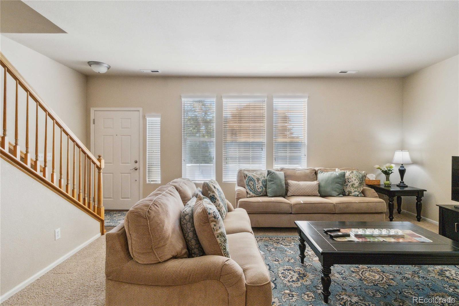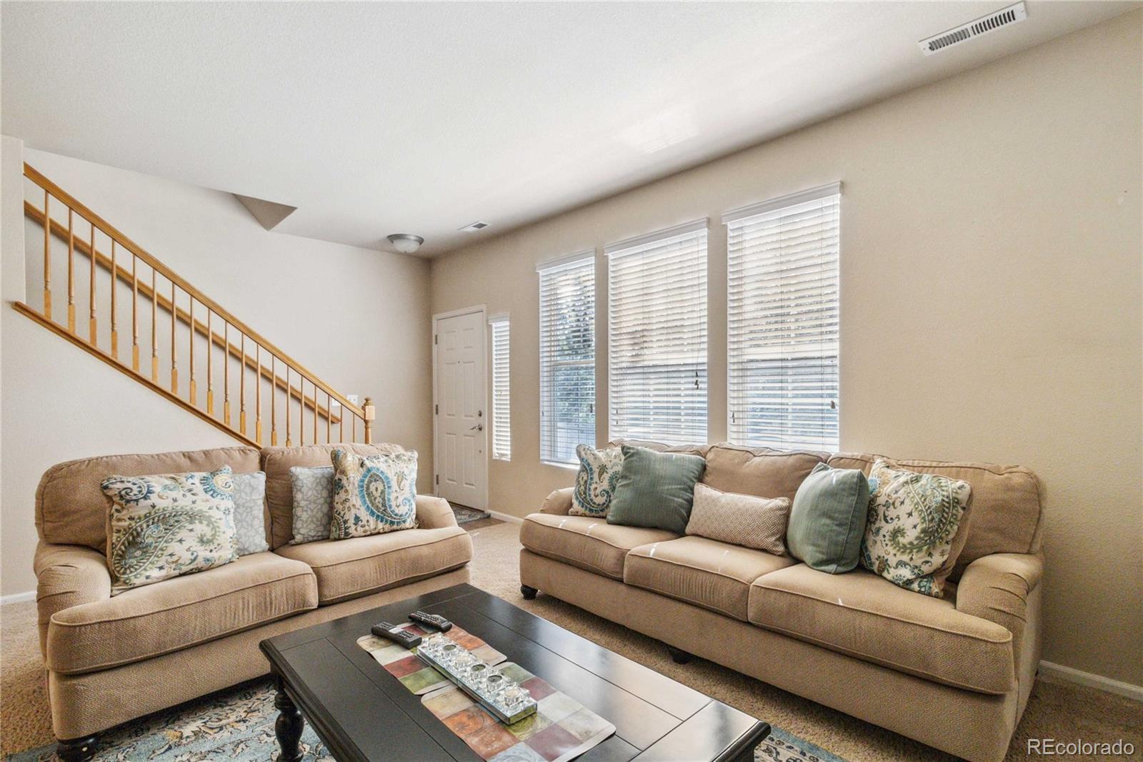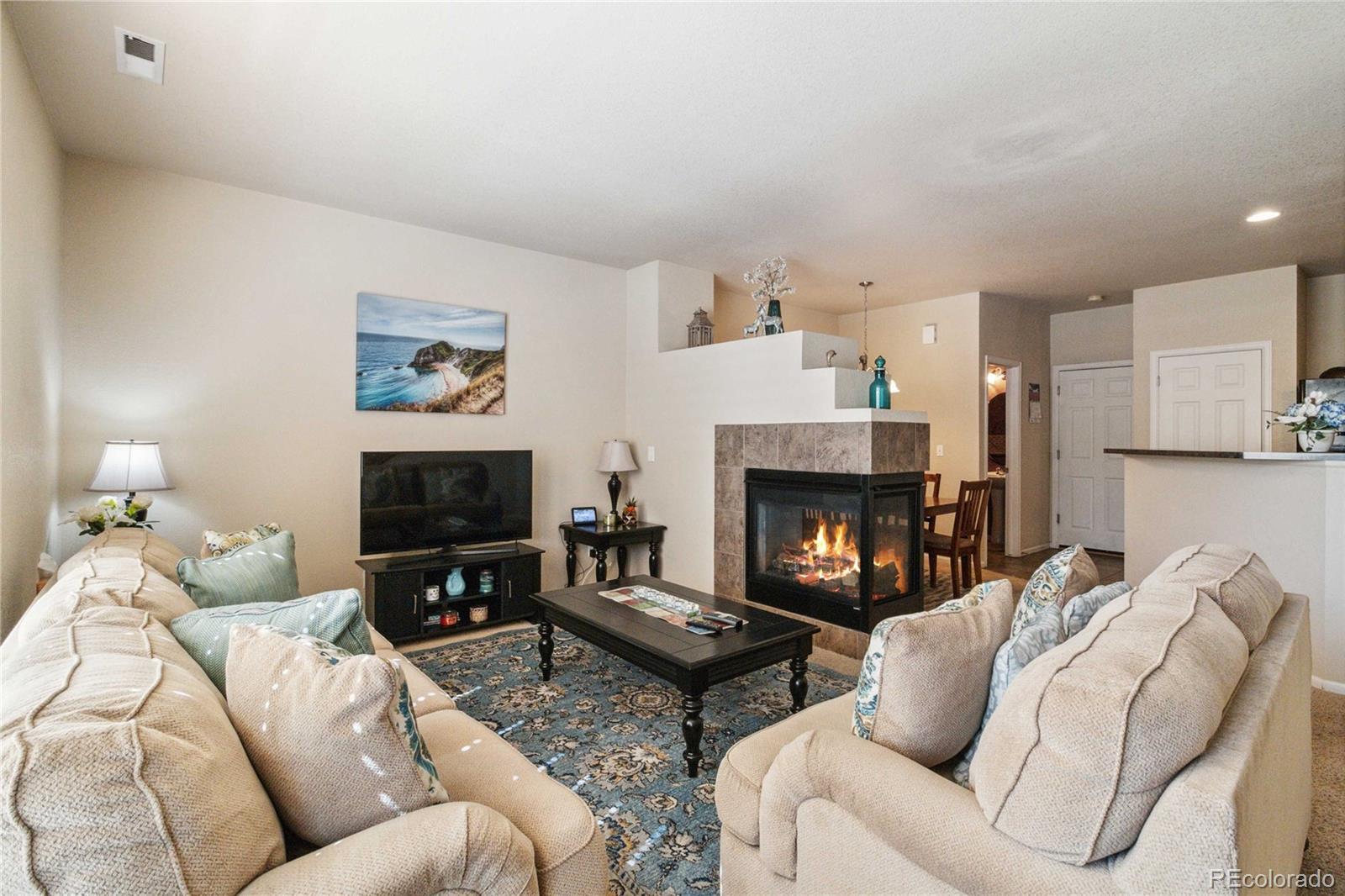 You’ll love this beautifully maintained and thoughtfully designed 2-bedroom, 3-bath townhome with an open floorplan, high ceilings, and an abundance of natural light. With over 1,670 square feet of finished living space, this home offers comfort, flexibility, and an unbeatable location just steps from Sage Creek Park and minutes from shopping and dining. Inside, discover a bright and inviting main level, where a stunning three-sided gas fireplace creates a warm focal point between the living and dining rooms—perfect for cozy winter nights. The open-concept layout continues into the spacious kitchen, which features plenty of cabinets, a pantry, new microwave, and a smart flow for everyday living or entertaining. Upstairs, you’ll find a generous loft —ideal as a home office, media space, or conversion into a third bedroom. The primary suite is a true retreat, with soaring vaulted ceilings, large walk-in closet, and spacious bath with dual sinks and a soaking tub. A second bedroom, full hall bath, and convenient laundry with washer and dryer included round out the upper level. Additional highlights include an attached 2-car garage, ceiling fans and central A/C for year-round comfort and a charming front porch with space for seating. Location is everything, and this home delivers! Just outside your door is Sage Creek Park, complete with a pond, playground, walking and biking paths. You’re also minutes from the Trail Winds Recreation Center, which offers an impressive array of amenities including a pool, lazy river, hot tub, climbing wall, indoor track, and more. With easy access to I-25, E-470, DIA, and Denver, commuting is a breeze—whether you’re headed downtown, to Boulder, or the airport. Shopping, dining, and schools are all conveniently nearby, making this townhome the perfect balance of quiet comfort and urban convenience. Whether you’re looking for your first home, downsizing, or seeking low-maintenance living with space to grow, this home checks all the boxes.