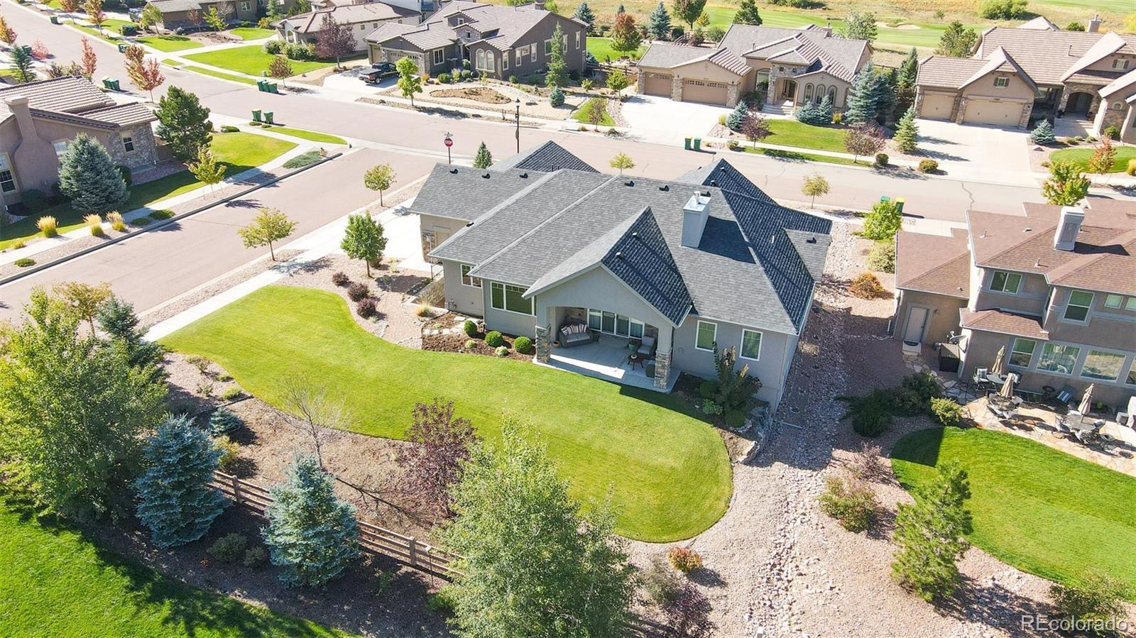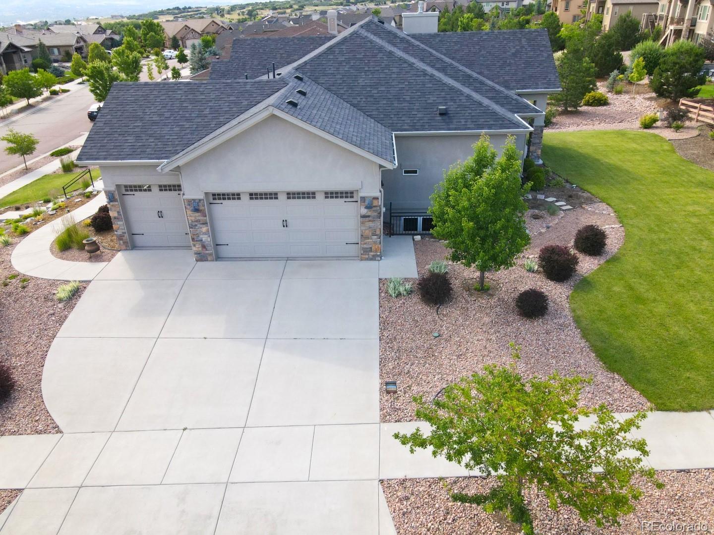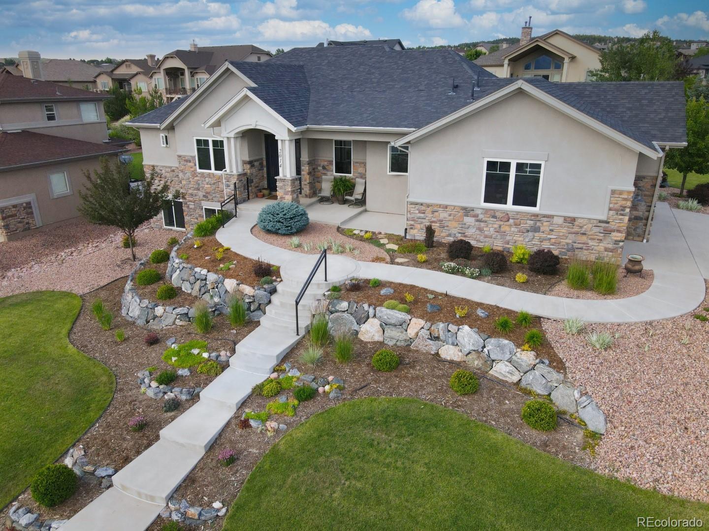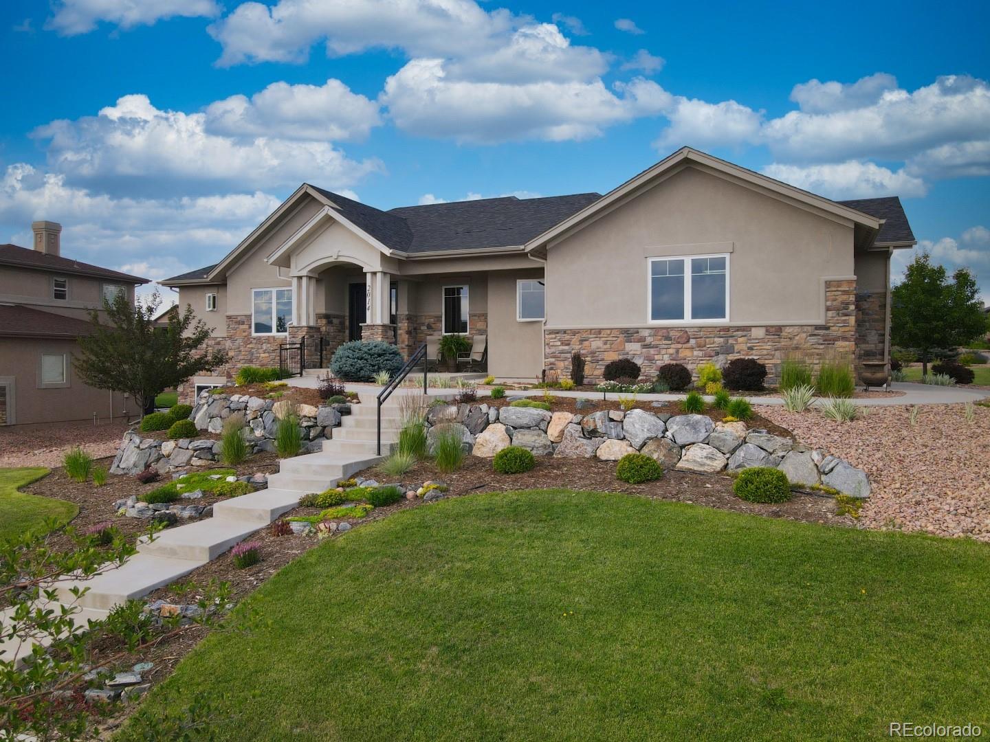 ***Custom Urban Farmhouse in Flying Horse – Rare Opportunity Under $1M*** Experience the rare chance to own the only true custom home in the prestigious Flying Horse community priced under $1 million. Unlike nearby ranch-style homes built from standard plans, this Urban Farmhouse-style ranch was individually designed & constructed with a one-of-a-kind vision, premium finishes & uncompromising attention to detail. Set on a beautifully landscaped corner lot, the home’s inviting covered front porch captures breathtaking Pikes Peak views—and even offers a front-row seat to Flying Horse’s 4th of July fireworks! Inside, enjoy a warm & balanced environment thanks to whole-house in-floor radiant heat, keeping every room evenly comfortable while maintaining low utility costs. The main level impresses with 10-ft ceilings, engineered hardwood floors, and a welcoming living room featuring custom Eden Oaks built-ins and a stone fireplace. The chef’s kitchen is an entertainer’s dream—featuring custom cabinetry, a massive 9'×13' leathered granite island, level-6 granite countertops, a Sub-Zero refrigerator, convection microwave, and a built-in coffee bar. A roomy butler’s pantry with quartz counters and extensive storage adds both beauty and practicality. The primary suite a retreat w/ plantation shutters, a spa-inspired ensuite & a custom walk-in closet. A dining area, private office with sliding barn door, powder bath & laundry room complete the main level. Fully finished basement expands your living space with a large family room (pre-plumbed & wired for your future wet bar), a full bath & multiple bedroom suites—including an ensuite with walk-in closet, another with LVP flooring & a secondary suite with its own sitting nook & three-quarter bath. Additional highlights: • Class IV composite shingle roof • Insulated 3-car garage • 8-ft interior doors throughout • Central vacuum system • Low HOA fees • Proximity to Flying Horse parks, trails, and amenities!