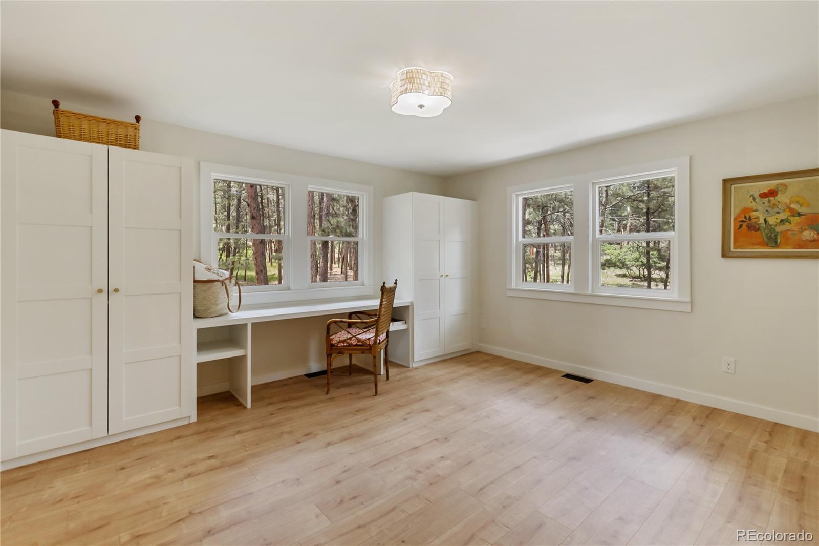 Welcome to the home that reminds us of a perfect place in time! A place where Retro Soul meets Mountain Zen & every square inch invites you to breathe deeper, linger longer, & finally live the life you’ve been dreaming of. Set on an expansive, tree-filled lot in the heart of Colorado Springs, this completely reimagined home feels like a love letter to the best parts of the 70s—warm wood, soulful fireplaces, & easy indoor-outdoor living—but with the sleek lines & quiet luxury of Nordic minimalism & Japanese-inspired design. Inside, you’ll find 5 bedrooms, 4 bathrooms, & an ambiance that whispers slow down, you’re home now. The main living space is bathed in natural light from oversized windows, framing the outdoors like living art. Two stunning wood-burning fireplaces anchor the home in warmth & nostalgia, while smooth modern lines & thoughtful finishes create a feeling of effortless elegance. The gourmet kitchen is both functional & fabulous—with a passthrough window connecting to your outdoor entertaining space, making summer nights feel like a scene straight out of a magazine. The primary suite is a sanctuary unto itself, with a spa-like 5-piece bath, soaking tub with a view, & the kind of peaceful energy that makes you want to cancel your vacation plans & just stay in. Need more? The backyard flows like a retreat—lush, treed, private—& features a custom waterfall designed to soothe the senses & soundtrack your afternoons. Plus the BONUS side yard with a pre-cut driveway & lot are perfect for an extra patio, barn, garage or outbuilding! And when you do feel like getting out, this home is just a hop, skip and a jump to Fox Run Regional Park where you can walk the nature trails, enjoy the playground, walk, run and even enjoy a baseball game! Take a stroll throughout the area to experience the equestrian properties, the open acreage and the peace and convenience of this home. This home blends the best of all worlds—style, serenity, soul! Welcome home!
