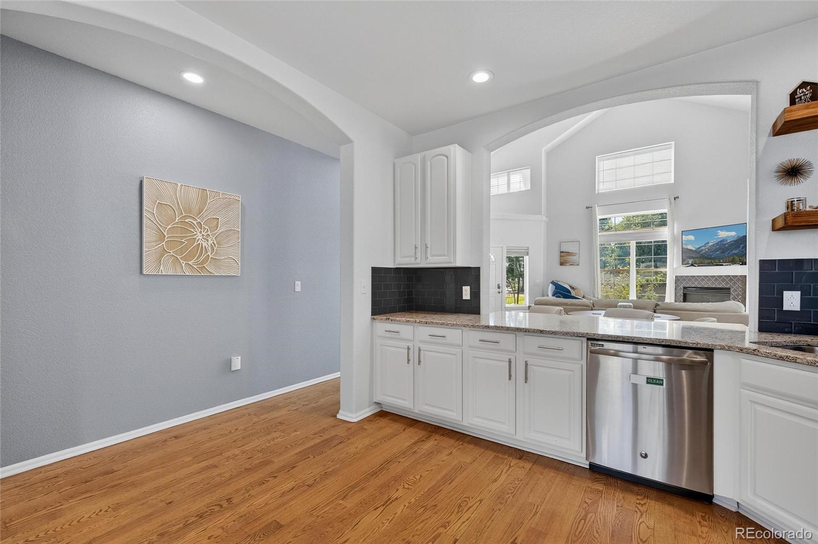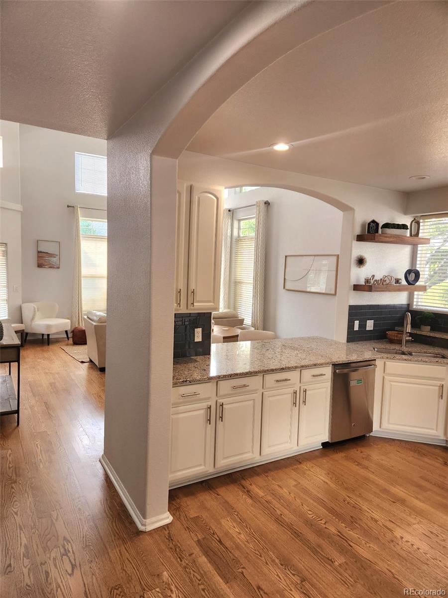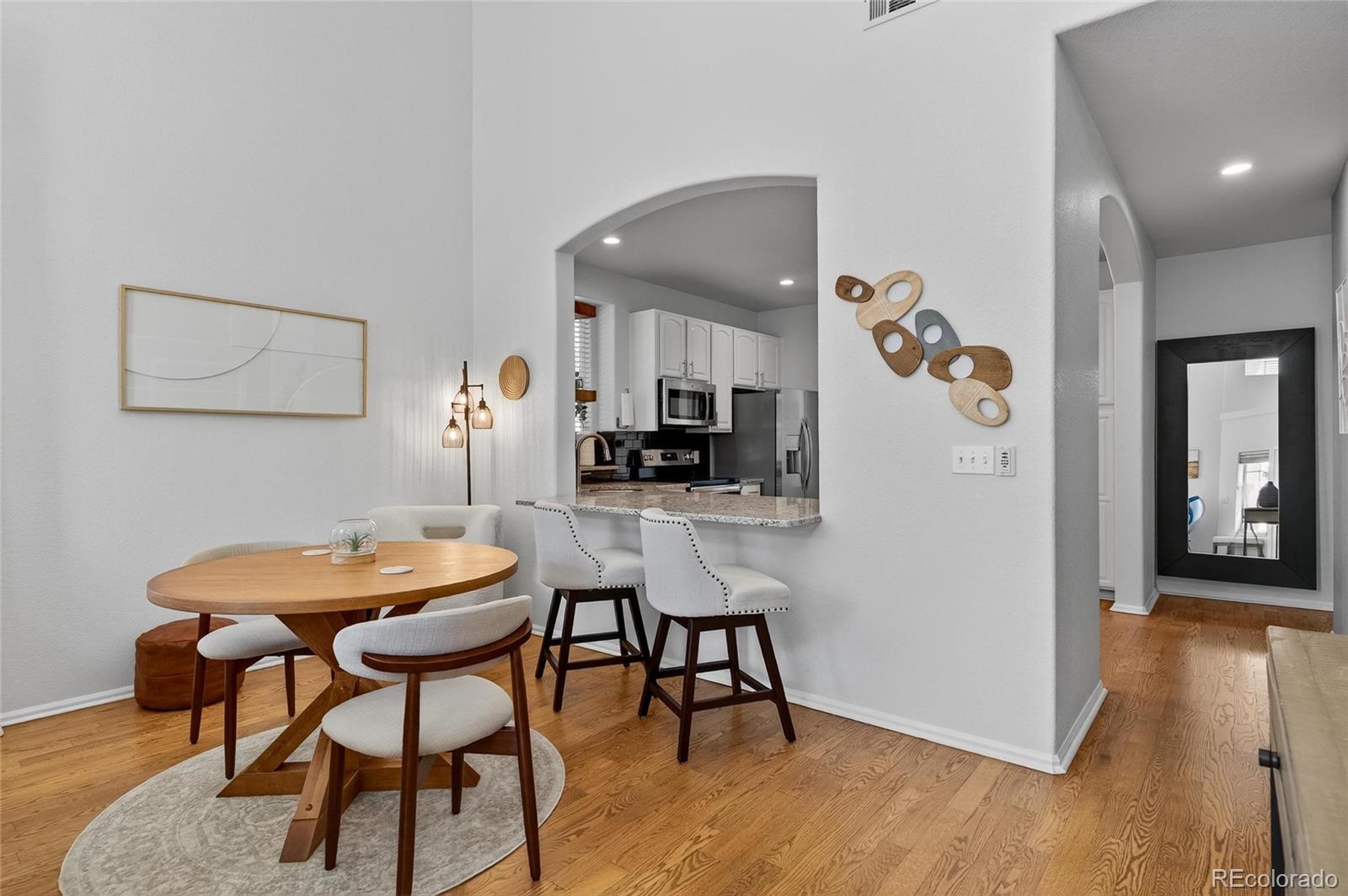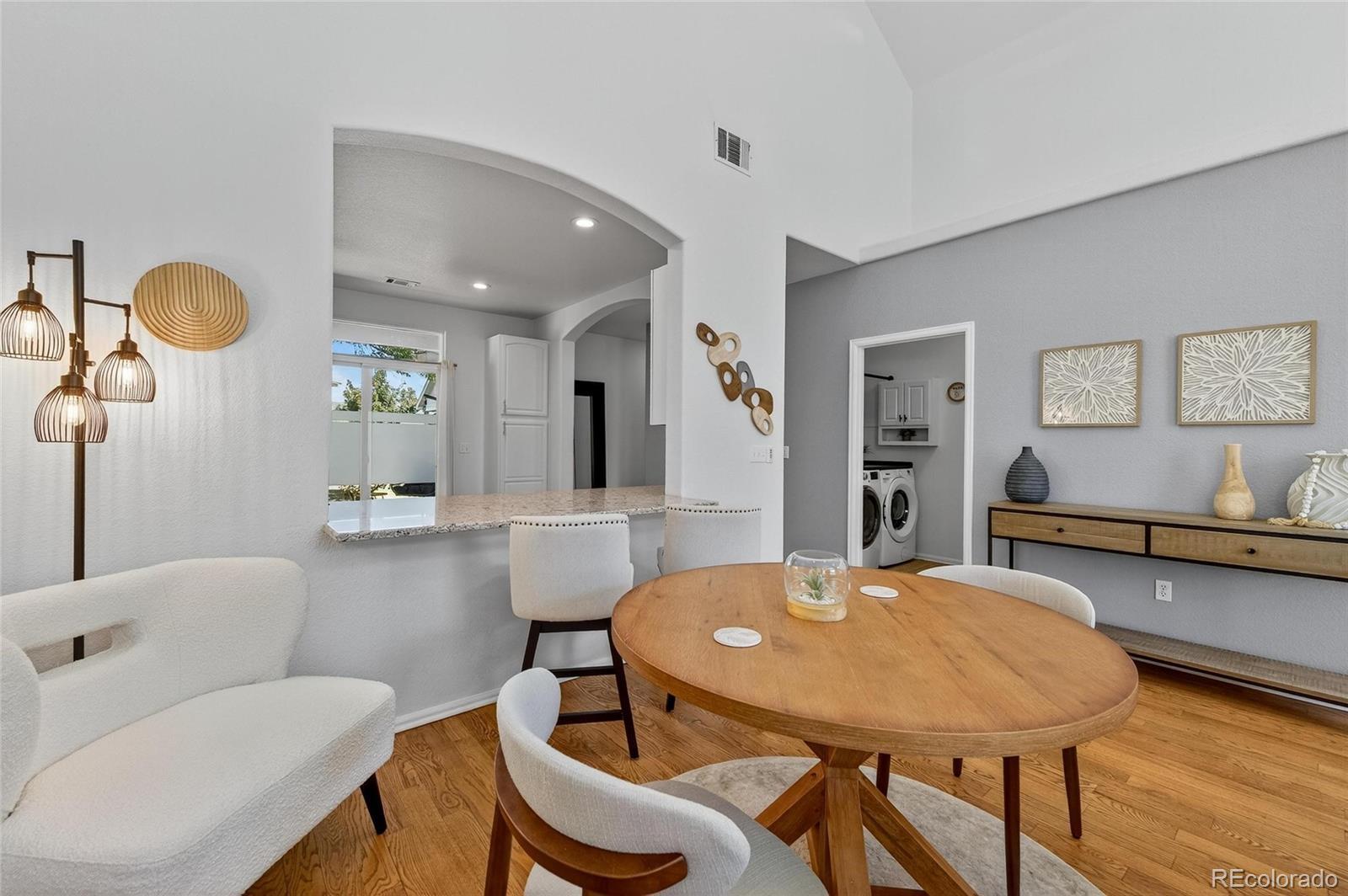 If you’re ready for a beautifully remodeled turnkey home, then step into modern comfort in this gorgeous 2-bedroom, 2-bath, patio-style ranch (townhouse, legal says condo) home. Location near 104th and Colorado Blvd, this bright, open floor plan boasts 20ft high vaulted ceilings in the living/dining room area. Oversized windows add to this light filled beauty. Warm solid hardwood floors that flow into a sleek kitchen with quartz countertops, stainless appliances, and a stylish breakfast bar. The primary suite feels like a retreat with its spa-inspired bathroom featuring double vanities and a walk-in shower wrapped in luxurious tile, double shower head, his and hers, custom 9' barn door, walk-in closet, built-in cabinet for additional storage. Laundry/mud room with built-in cabinetry. Washer, dryer included. A second bedroom and 3/4 bath offers plenty of space for guests, or a home office. Top down, bottom up blackout shades in bedrooms, auto lights in laundry and primary suite walk-in closet, tons of storage - lots of extra features you'll discover in this great home. All mechanical is less than 5 years old. Oversized 2 car garage with a massive finished attic space above accessed by drop down stairs. New roof 2024. All furnishings are for sale including art work, except the primary bedroom set, it's not for sale. Enjoy morning coffee on your covered patio in the peaceful, quiet community setting. With its modern updates and lock-and-leave convenience, this home is the perfect blend of style and function.