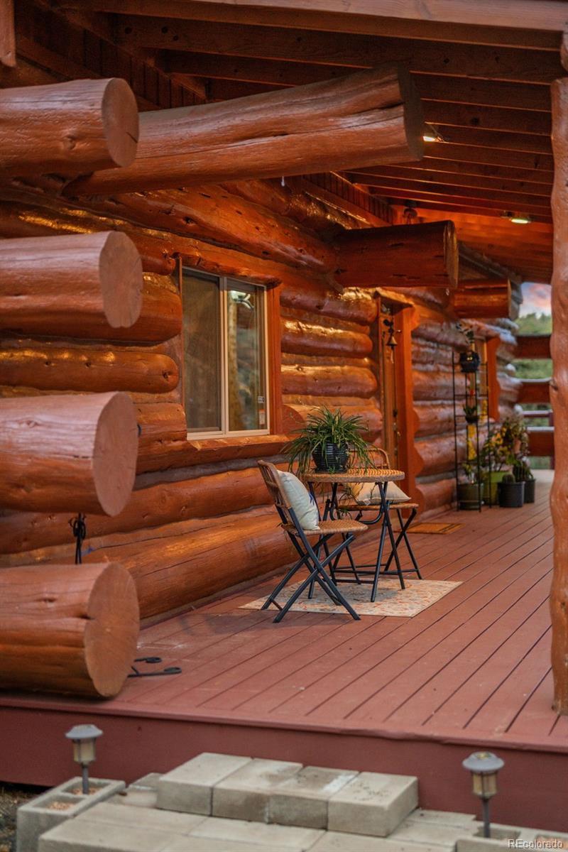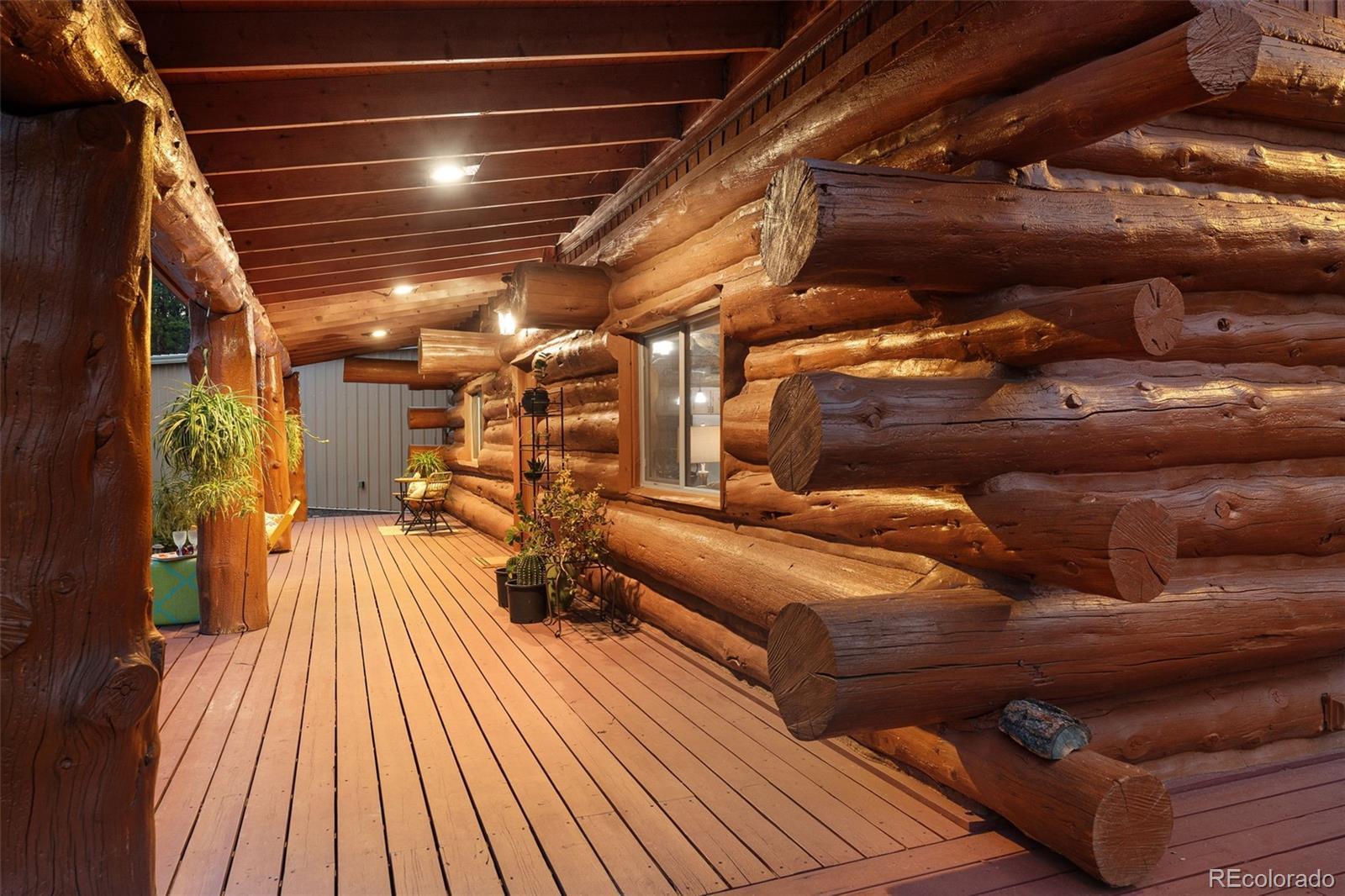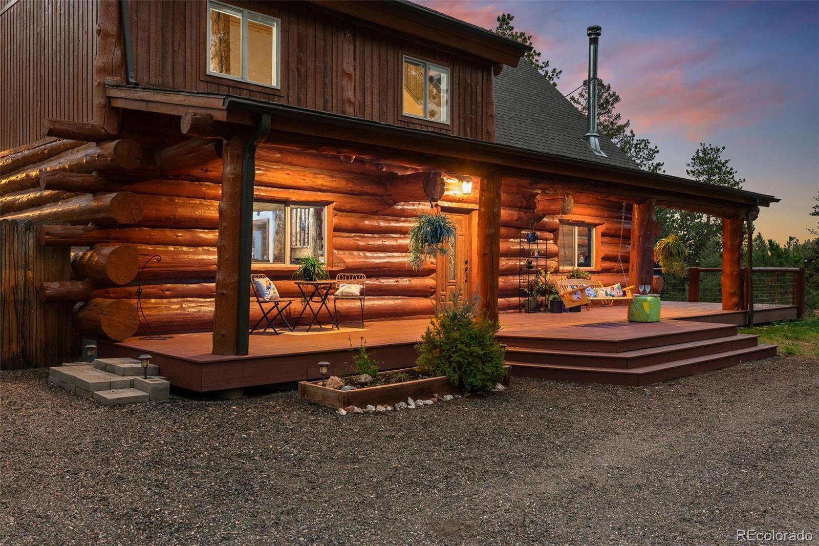Magnificent artisan log home set upon a 2 acre mitigated mountain flat lot. This stunning quintessential full log home is located in the highly sought after Woodside neighborhood just off 285 with easy commute to Denver. Enjoy the complete serenity sitting on the fully covered front wrap around porch. Cozy up to the fire in the living room with soaring vaulted ceilings and towering windows to let the outdoors in. Most everything has been updated with new exterior stain/paint with UV coating, interior paint, updated bathrooms, all new luxury vinyl flooring and new carpet upstairs. The property has Southern exposure and is completely mitigated, newly paved driveway and parking, and has a new insulated steel 2 car garage/workshop or barn building. There is also a hot tub hook up and excavated pad. The property can easily become a horse property with several options for shelter. The Woodside neighborhood is full of riding trails and many horse residents - and no HOA. The landscaped and fully fenced backyard is a gardeners paradise with a high fence to keep out the deer and elk. There are 2 primary suites complete with en suites and walk in closets with one being on the main level with a private door. The open floor plan and well appointed kitchen make for the perfect gathering spot. The enormous loft area upstairs is surrounded by stunning architecture and windows galore. This space can be used for many purposes and filled with sunlight. The home is just 1.2 miles off of 285 at Pine Junction & RTD Park-n-ride with Conifer amenities a short 10 min drive. The roads are county maintained, and the area is part of the "banana belt" with less snow accumulation. Mountain living at it's very best here with abundant wildlife, close to parks & open space.