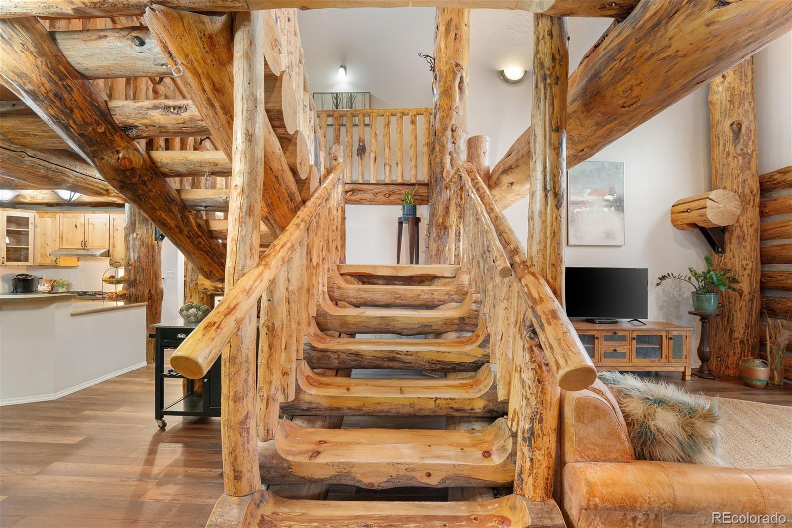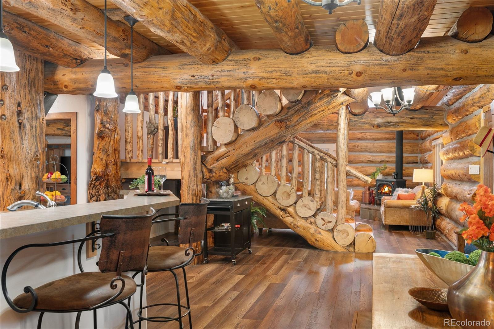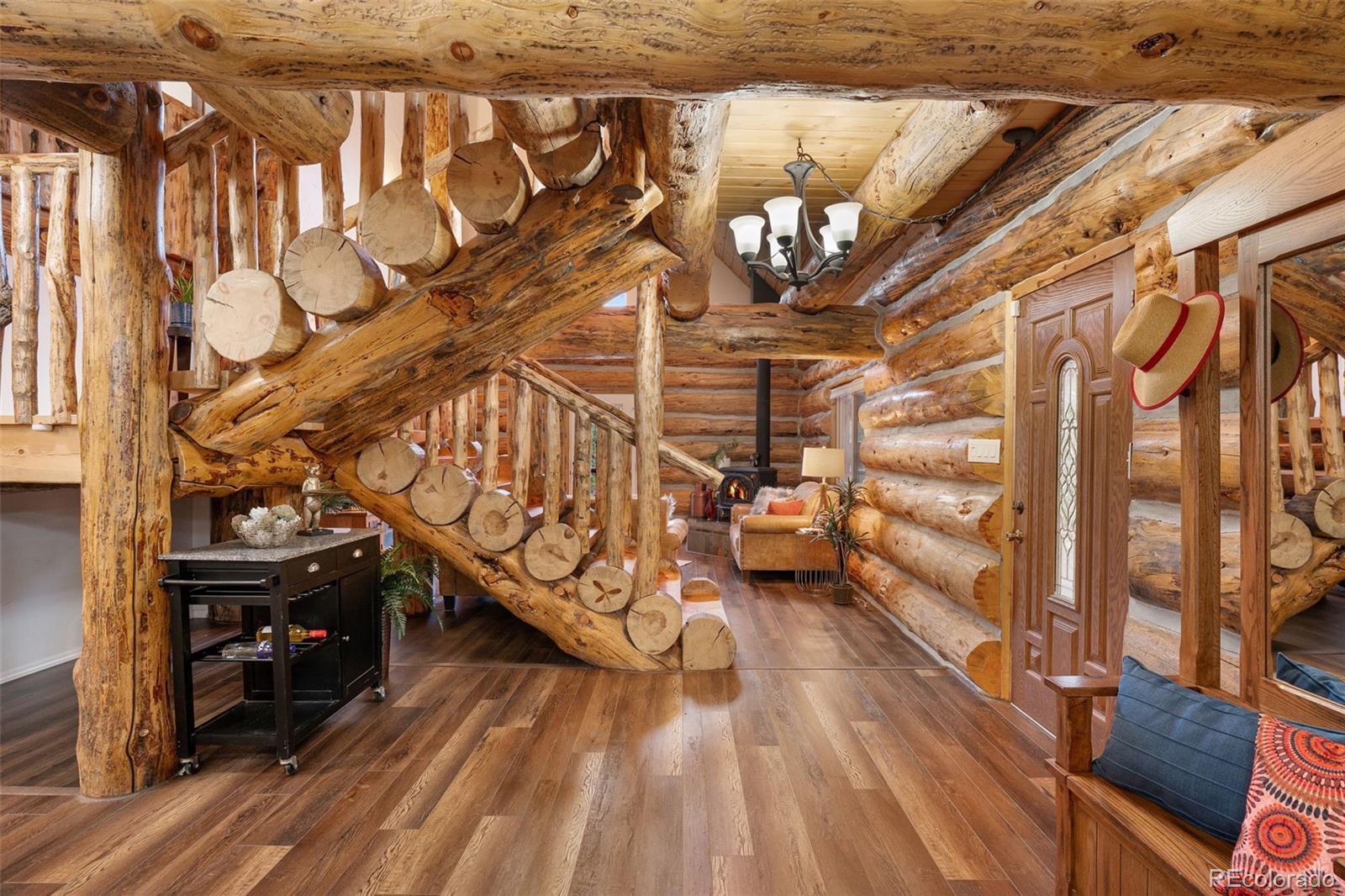 Magnificent artisan log home set upon a 2 acre mitigated mountain flat lot. This stunning quintessential full log home is located in the highly sought after Woodside neighborhood just off 285 with easy commute to Denver. Enjoy the complete serenity sitting on the fully covered front wrap around porch. Cozy up to the fire in the living room with soaring vaulted ceilings and towering windows to let the outdoors in. Most everything has been updated with new exterior stain/paint with UV coating, interior paint, updated bathrooms, all new luxury vinyl flooring and new carpet upstairs. The property has Southern exposure and is completely mitigated, newly paved driveway and parking, and has a new insulated steel 2 car garage/workshop or barn building. There is also a hot tub hook up and excavated pad. The property can easily become a horse property with several options for shelter. The Woodside neighborhood is full of riding trails and many horse residents - and no HOA. The landscaped and fully fenced backyard is a gardeners paradise with a high fence to keep out the deer and elk. There are 2 primary suites complete with en suites and walk in closets with one being on the main level with a private door. The open floor plan and well appointed kitchen make for the perfect gathering spot. The enormous loft area upstairs is surrounded by stunning architecture and windows galore. This space can be used for many purposes and filled with sunlight. The home is just 1.2 miles off of 285 at Pine Junction & RTD Park-n-ride with Conifer amenities a short 10 min drive. The roads are county maintained, and the area is part of the "banana belt" with less snow accumulation. Mountain living at it's very best here with abundant wildlife, close to parks & open space.