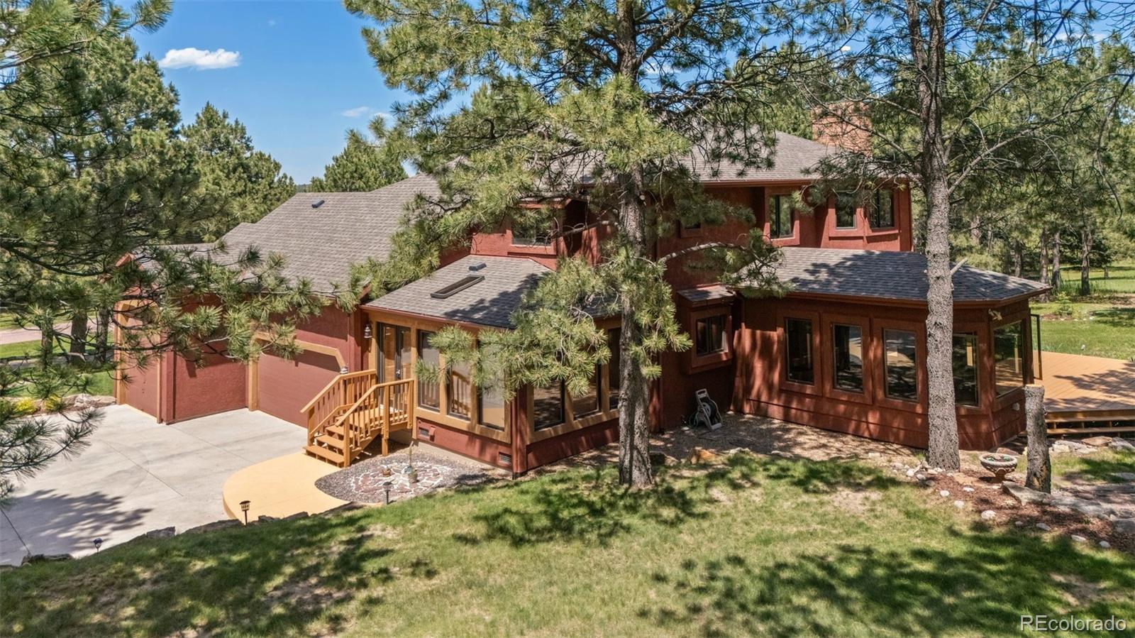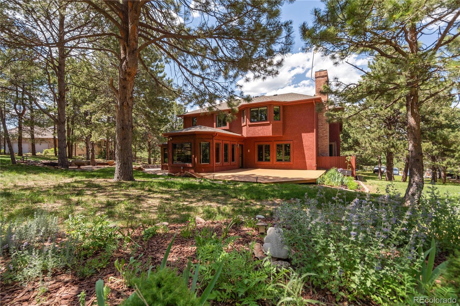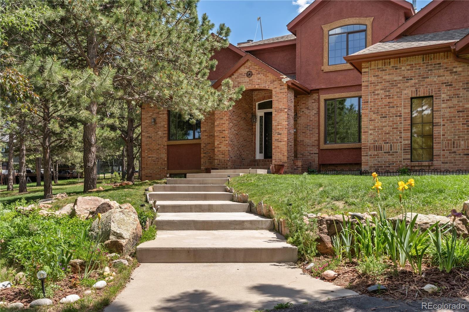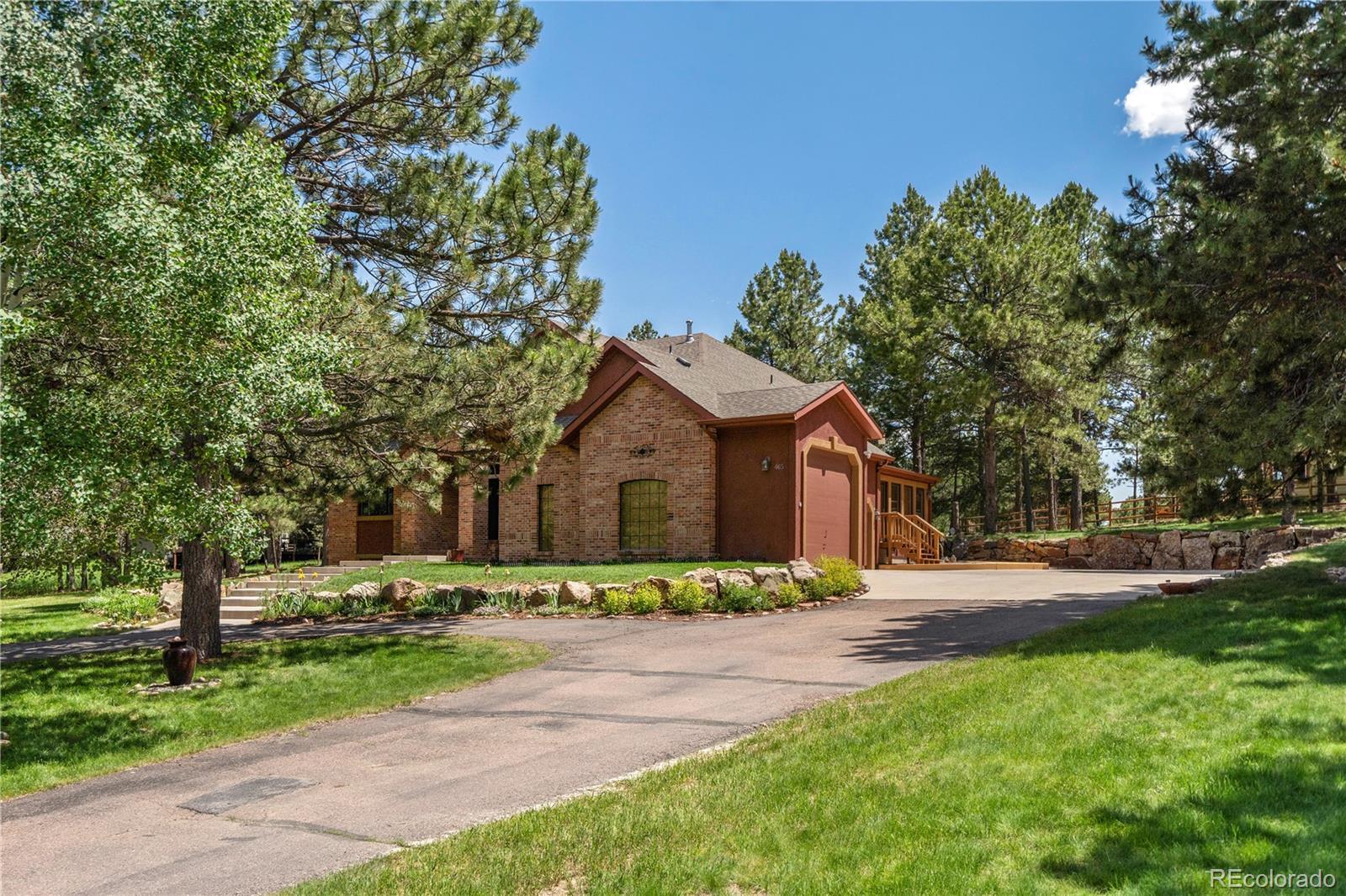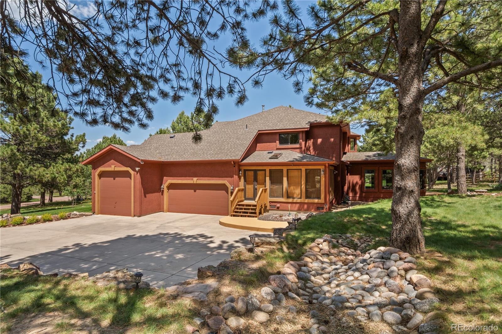 Nestled in the trees of sought-after Woodmoor, this 5-bed, 5-bath stucco home offers comfort, elegance, and thoughtful design throughout. The oversized 3-car garage includes RV parking, 2 large windows, and 5 ceiling-mounted bike racks. A circular paved driveway leads to the grand entrance, where you’re greeted by a stunning dual-entry staircase and freshly refinished hardwood floors. The formal dining room features elegant wainscoting and dual access, including a pass-through to the kitchen. The front family room includes a cozy fireplace and views of the beautifully landscaped, flower-filled yard. At the rear of the home, the kitchen includes a gas range, stained-glass cabinet doors, built-in desk and china cabinet, wood pantry shelves, and a central island with a lighted pot rack. The adjoining informal dining area and living room flow to a ground-level oversized deck with a gas line and extra outlets—perfect for entertaining. Off the main living area, you’ll find a private office and a spacious sunroom with a well-maintained hot tub. Upstairs, the large primary suite includes a sitting area, walk-in closet, and 5-piece bath with jetted corner tub and room for additional furniture. Three additional bedrooms and two full baths complete the upper level. The finished basement features a bright family room with fireplace and 3 large windows, a 5th bedroom, full bath, hobby/storage room, and an open area ideal for a wet bar or reading nook. Updates include: fresh interior paint, new carpet, refinished hardwood floors, a new furnace, and freshly stained deck. The yard is filled with mature trees, colorful flowers, and handcrafted sitting areas—offering a peaceful retreat just minutes from town. This rare Woodmoor gem blends classic style, modern updates, and exceptional outdoor living. A must-see!