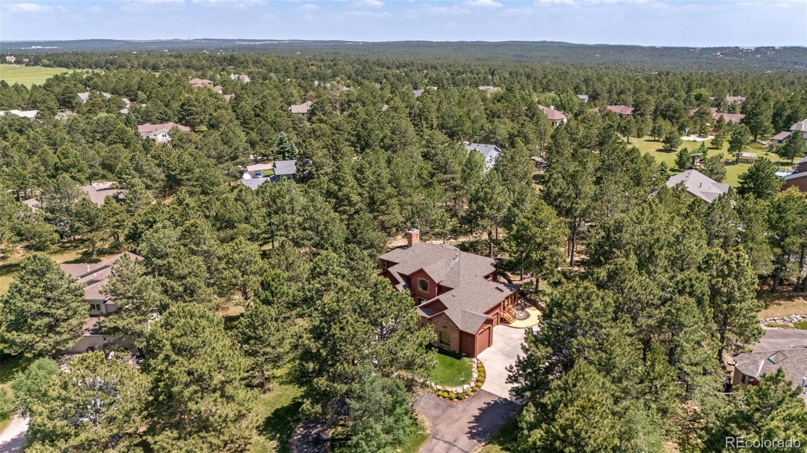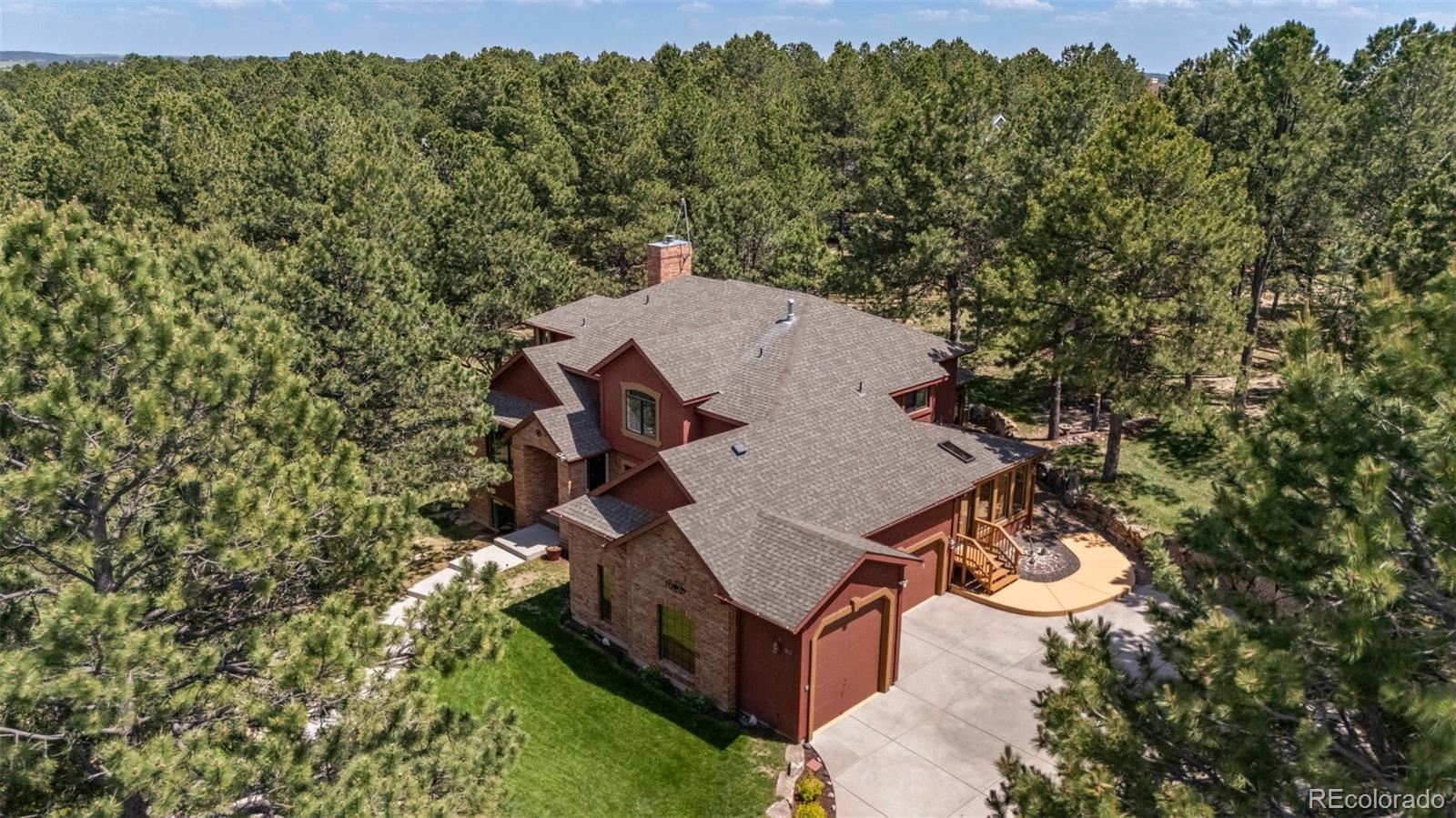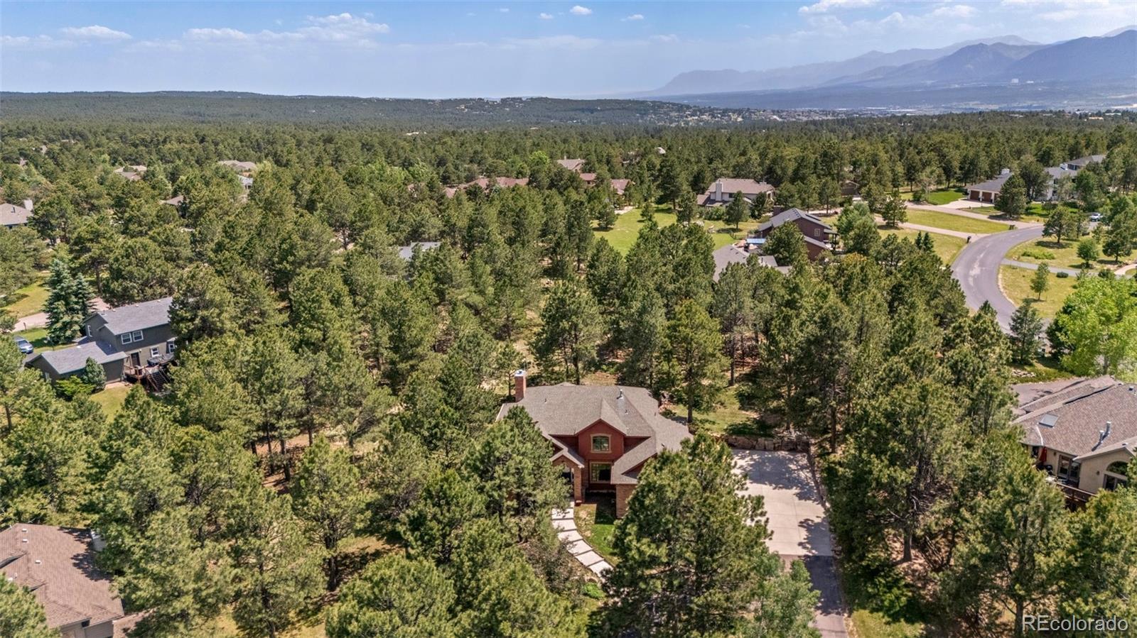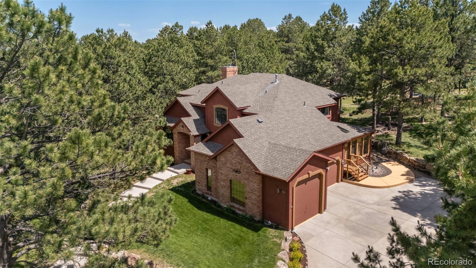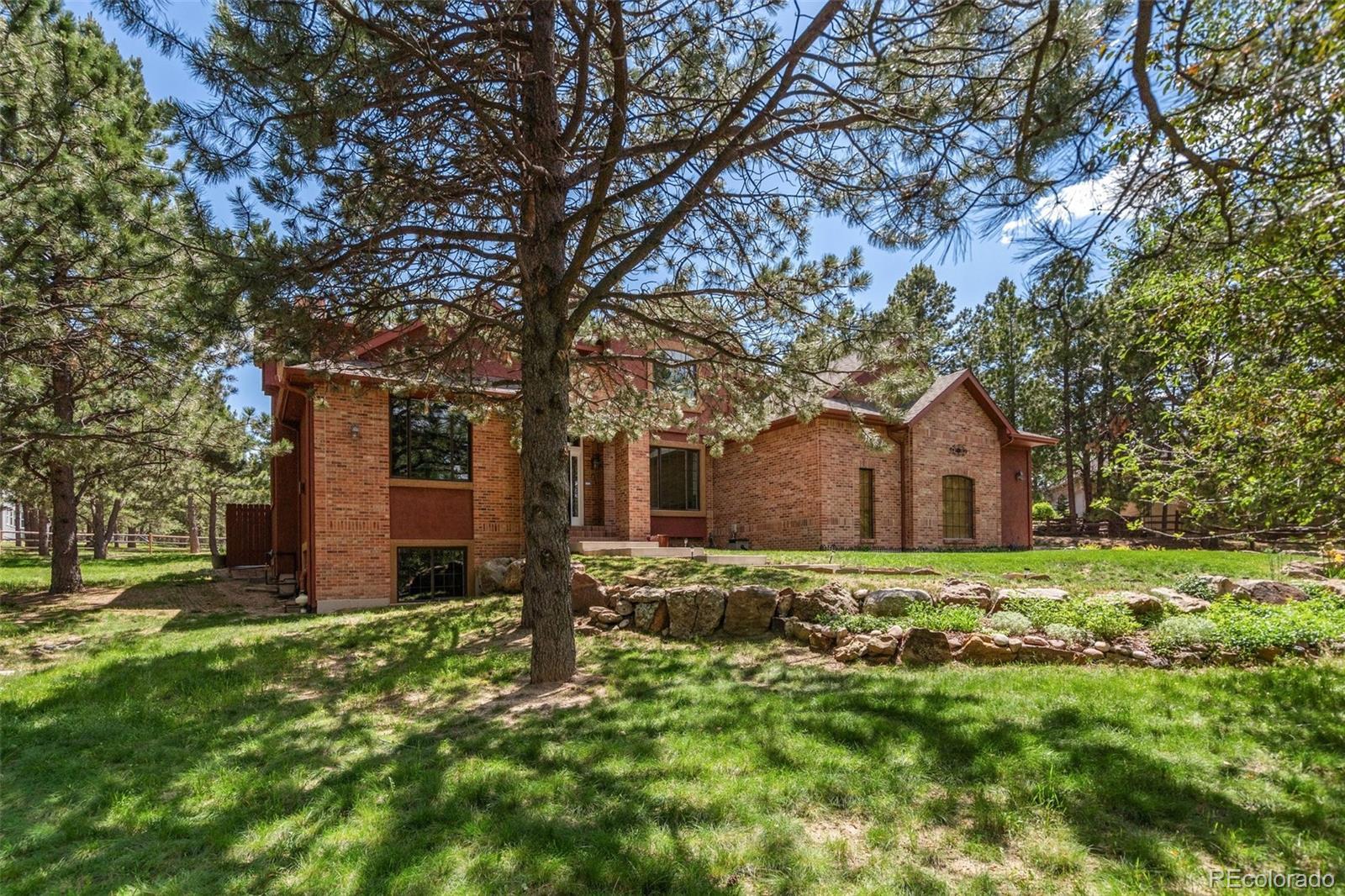 Nestled in the trees of sought-after Woodmoor, this 5-bed, 5-bath stucco home offers comfort, elegance, and thoughtful design throughout. The oversized 3-car garage includes RV parking, 2 large windows, and 5 ceiling-mounted bike racks. A circular paved driveway leads to the grand entrance, where you’re greeted by a stunning dual-entry staircase and freshly refinished hardwood floors. The formal dining room features elegant wainscoting and dual access, including a pass-through to the kitchen. The front family room includes a cozy fireplace and views of the beautifully landscaped, flower-filled yard. At the rear of the home, the kitchen includes a gas range, stained-glass cabinet doors, built-in desk and china cabinet, wood pantry shelves, and a central island with a lighted pot rack. The adjoining informal dining area and living room flow to a ground-level oversized deck with a gas line and extra outlets—perfect for entertaining. Off the main living area, you’ll find a private office and a spacious sunroom with a well-maintained hot tub. Upstairs, the large primary suite includes a sitting area, walk-in closet, and 5-piece bath with jetted corner tub and room for additional furniture. Three additional bedrooms and two full baths complete the upper level. The finished basement features a bright family room with fireplace and 3 large windows, a 5th bedroom, full bath, hobby/storage room, and an open area ideal for a wet bar or reading nook. Updates include: fresh interior paint, new carpet, refinished hardwood floors, a new furnace, and freshly stained deck. The yard is filled with mature trees, colorful flowers, and handcrafted sitting areas—offering a peaceful retreat just minutes from town. This rare Woodmoor gem blends classic style, modern updates, and exceptional outdoor living. A must-see!