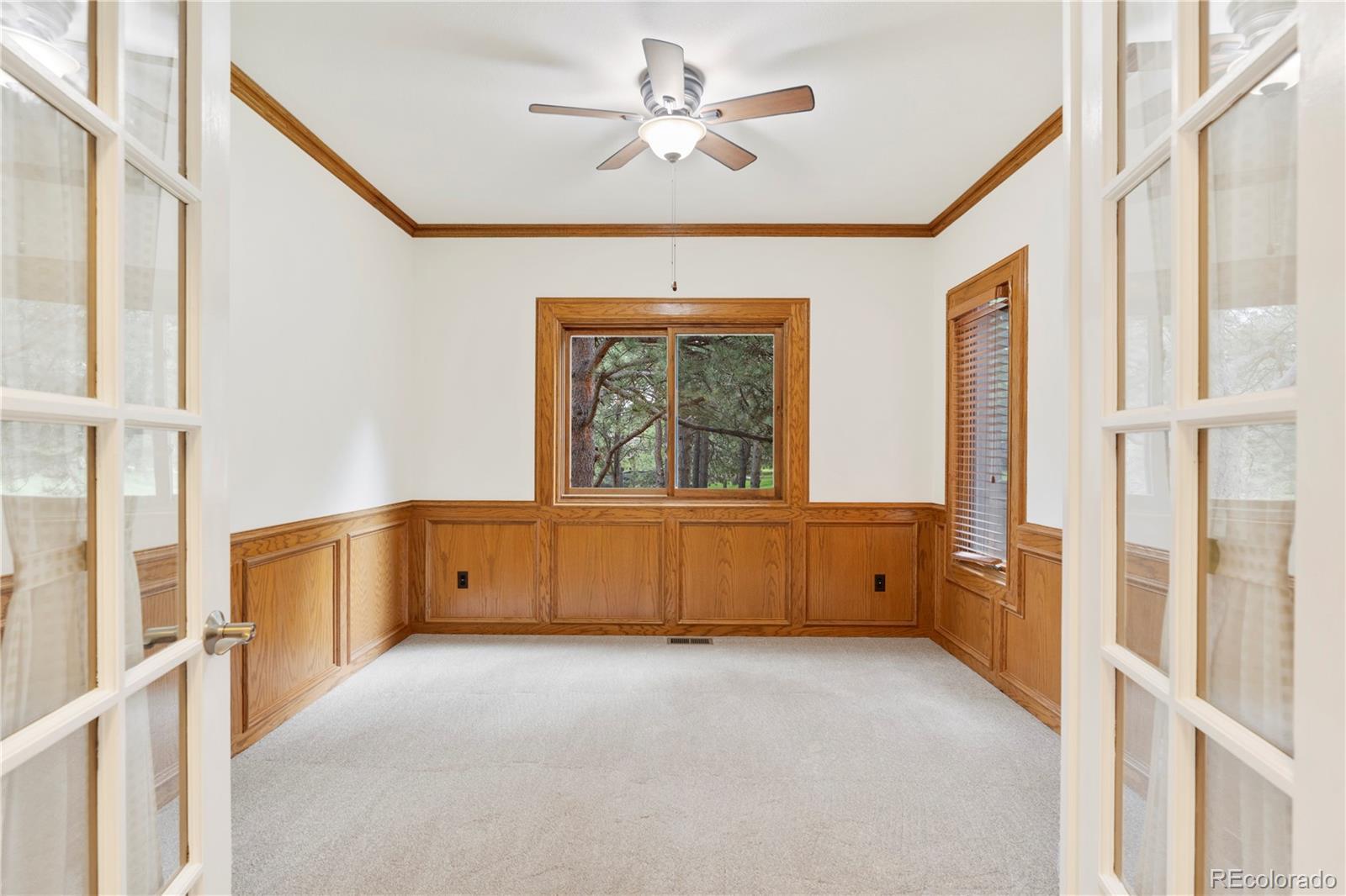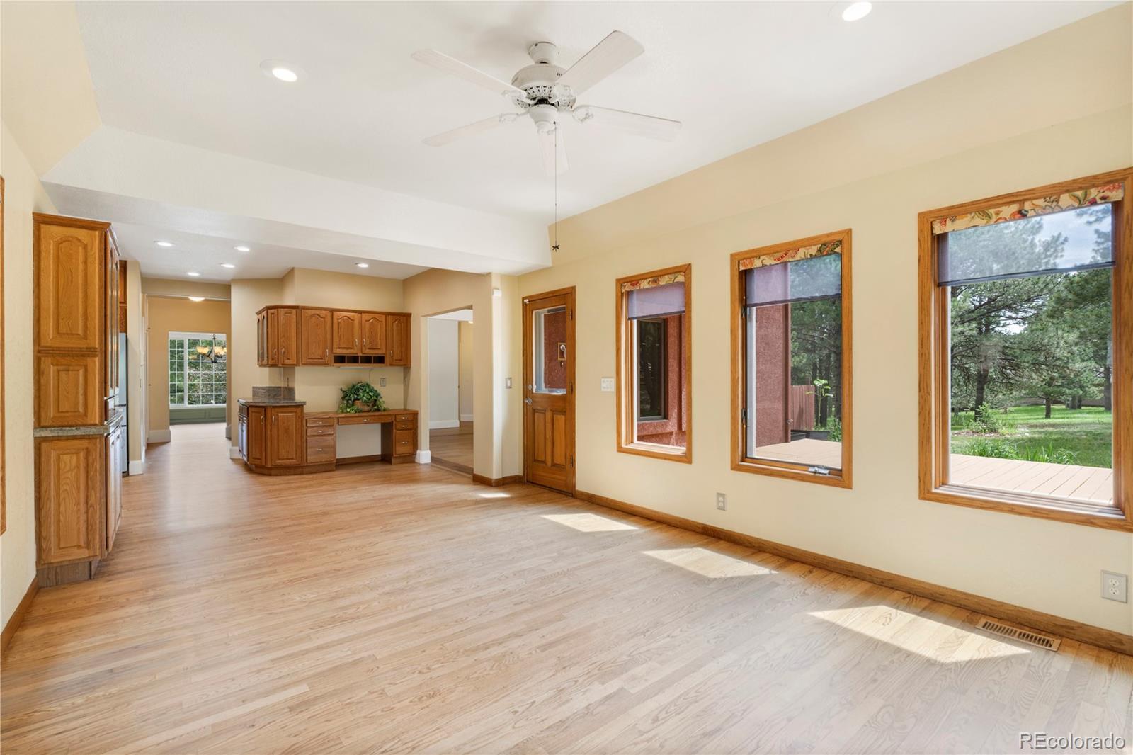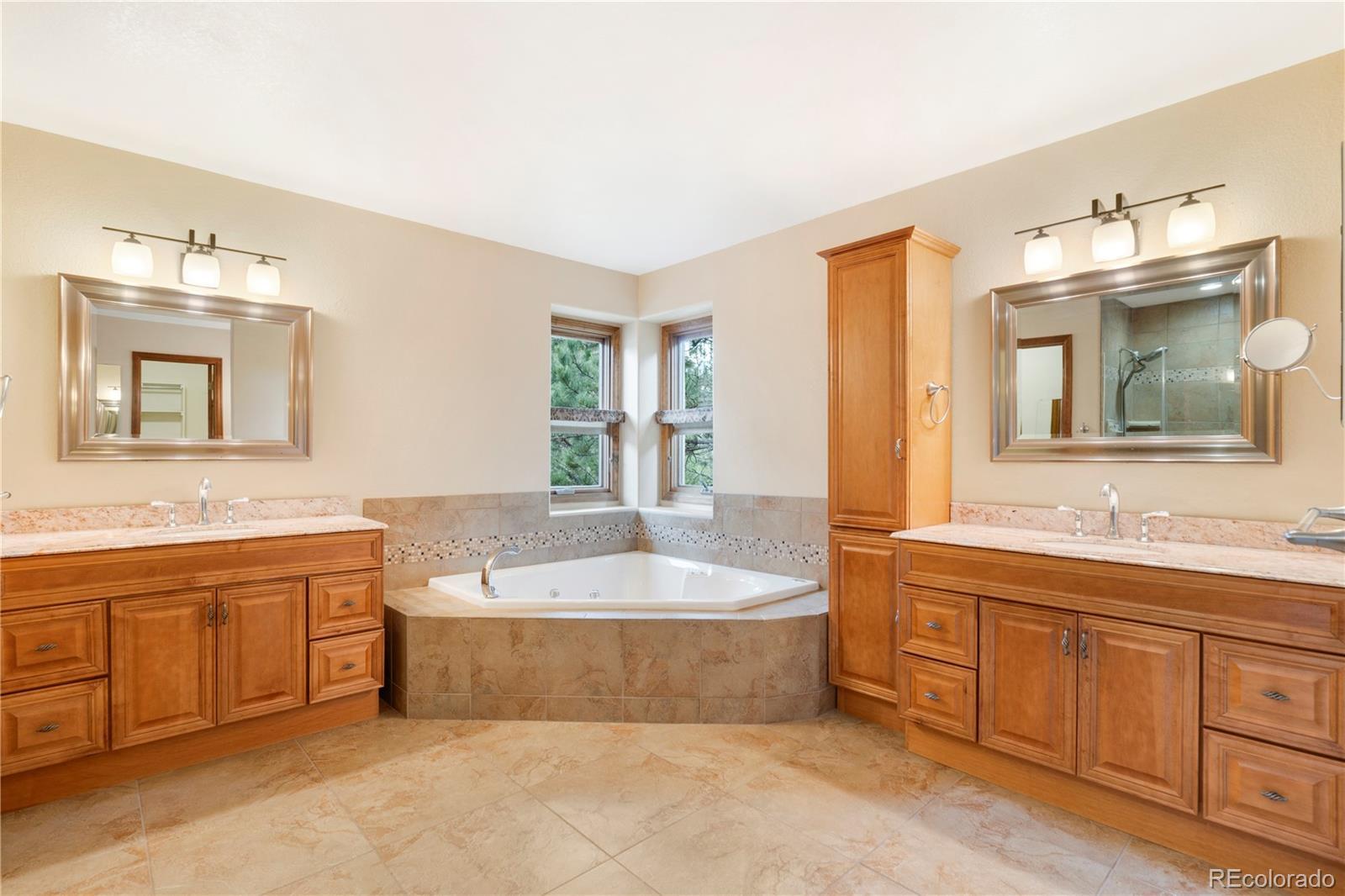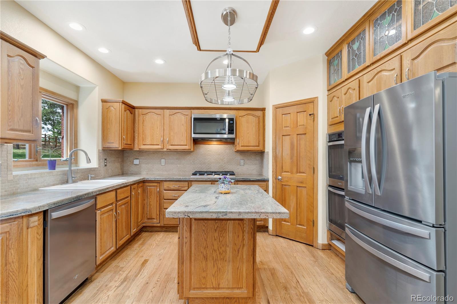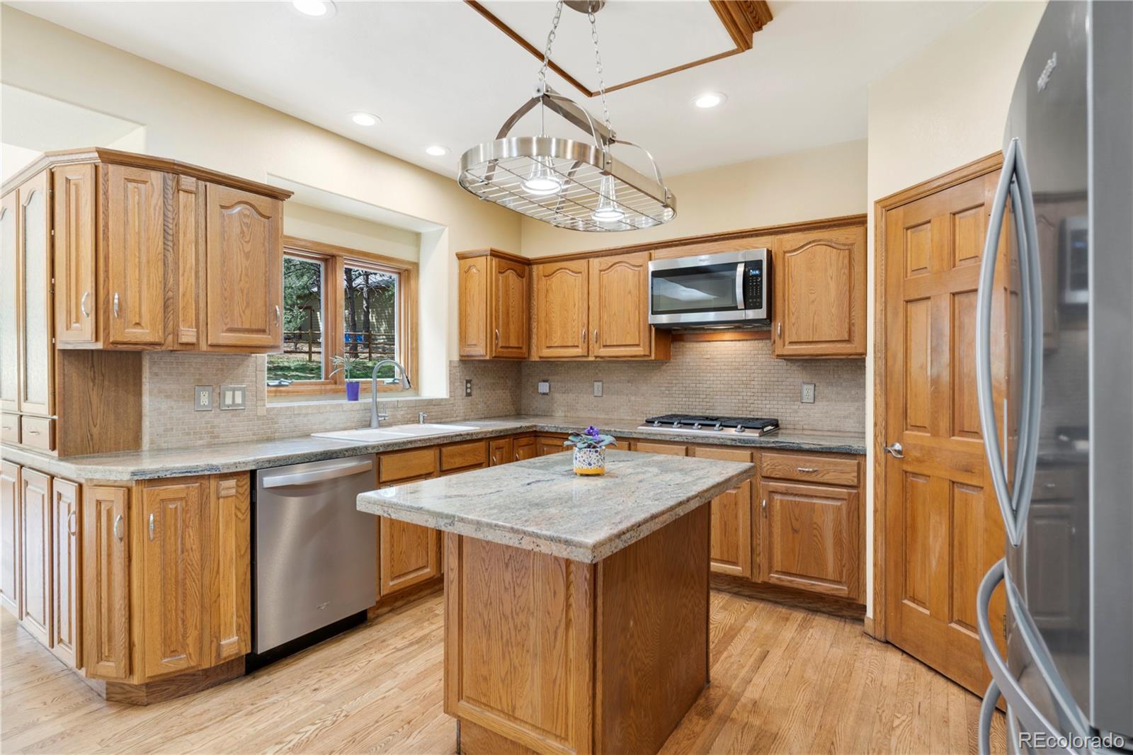 Nestled in the trees of sought-after Woodmoor, this 5-bed, 5-bath stucco home offers comfort, elegance, and thoughtful design throughout. The oversized 3-car garage includes RV parking, 2 large windows, and 5 ceiling-mounted bike racks. A circular paved driveway leads to the grand entrance, where you’re greeted by a stunning dual-entry staircase and freshly refinished hardwood floors. The formal dining room features elegant wainscoting and dual access, including a pass-through to the kitchen. The front family room includes a cozy fireplace and views of the beautifully landscaped, flower-filled yard. At the rear of the home, the kitchen includes a gas range, stained-glass cabinet doors, built-in desk and china cabinet, wood pantry shelves, and a central island with a lighted pot rack. The adjoining informal dining area and living room flow to a ground-level oversized deck with a gas line and extra outlets—perfect for entertaining. Off the main living area, you’ll find a private office and a spacious sunroom with a well-maintained hot tub. Upstairs, the large primary suite includes a sitting area, walk-in closet, and 5-piece bath with jetted corner tub and room for additional furniture. Three additional bedrooms and two full baths complete the upper level. The finished basement features a bright family room with fireplace and 3 large windows, a 5th bedroom, full bath, hobby/storage room, and an open area ideal for a wet bar or reading nook. Updates include: fresh interior paint, new carpet, refinished hardwood floors, a new furnace, and freshly stained deck. The yard is filled with mature trees, colorful flowers, and handcrafted sitting areas—offering a peaceful retreat just minutes from town. This rare Woodmoor gem blends classic style, modern updates, and exceptional outdoor living. A must-see!