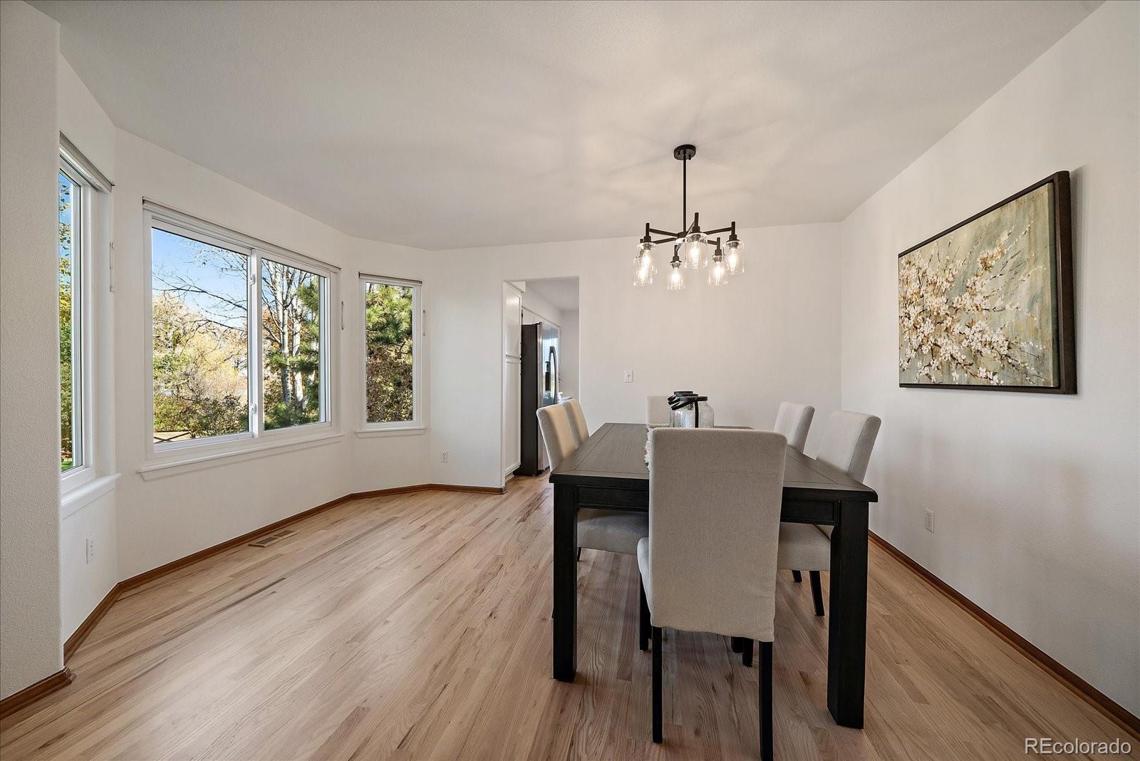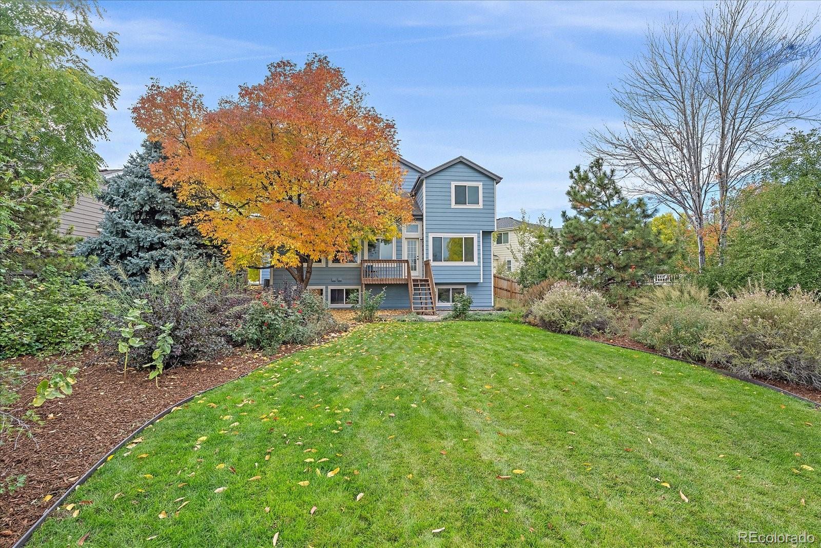 Welcome to this beautifully updated home in a prime location! Perfectly situated on a large, professionally landscaped lot with mature trees and peaceful open space views, this property offers both privacy and a true connection to nature. Enjoy Colorado living at its finest from the back deck as you enjoy the serene surroundings. Inside, the main floor has been thoughtfully refreshed with new hardwood floors, modern light fixtures, and stylish quartz countertops that elevate every space. The layout flows seamlessly from the bright living room and dining area into the bright kitchen, which features crisp white cabinetry, stainless steel appliances, ample counter space, and an inviting eat-in nook that overlooks the lush backyard. The cozy family room is filled with natural light and boasts soaring ceilings and a gas fireplace—perfect for relaxing after a day in the Colorado outdoors. A main-floor bedroom provides flexible living options for guests, a home office, or creative space, conveniently located near the powder bath and laundry room. Upstairs, you’ll find new carpet, fresh paint, and beautifully updated bathrooms with timeless finishes. The serene primary suite offers vaulted ceilings, a charming bay window, a walk-in closet, and a lovely five-piece bath with soaking tub and separate shower. Two spacious secondary bedrooms and an updated full bathroom provide plenty of room for family or guests. The full garden-level basement is bright, open, and ready for your finishing touch—ideal for adding a media room, fitness space, or additional living area. A three-car garage provides ample storage and convenience. This home’s location is unbeatable—just steps from neighborhood parks, walking trails, and the community pool, with easy access to schools, shopping, the foothills, and downtown Denver. Beautifully updated, move-in ready, and full of natural light—this home truly offers the best of Colorado living. Don’t miss this fantastic opportunity!