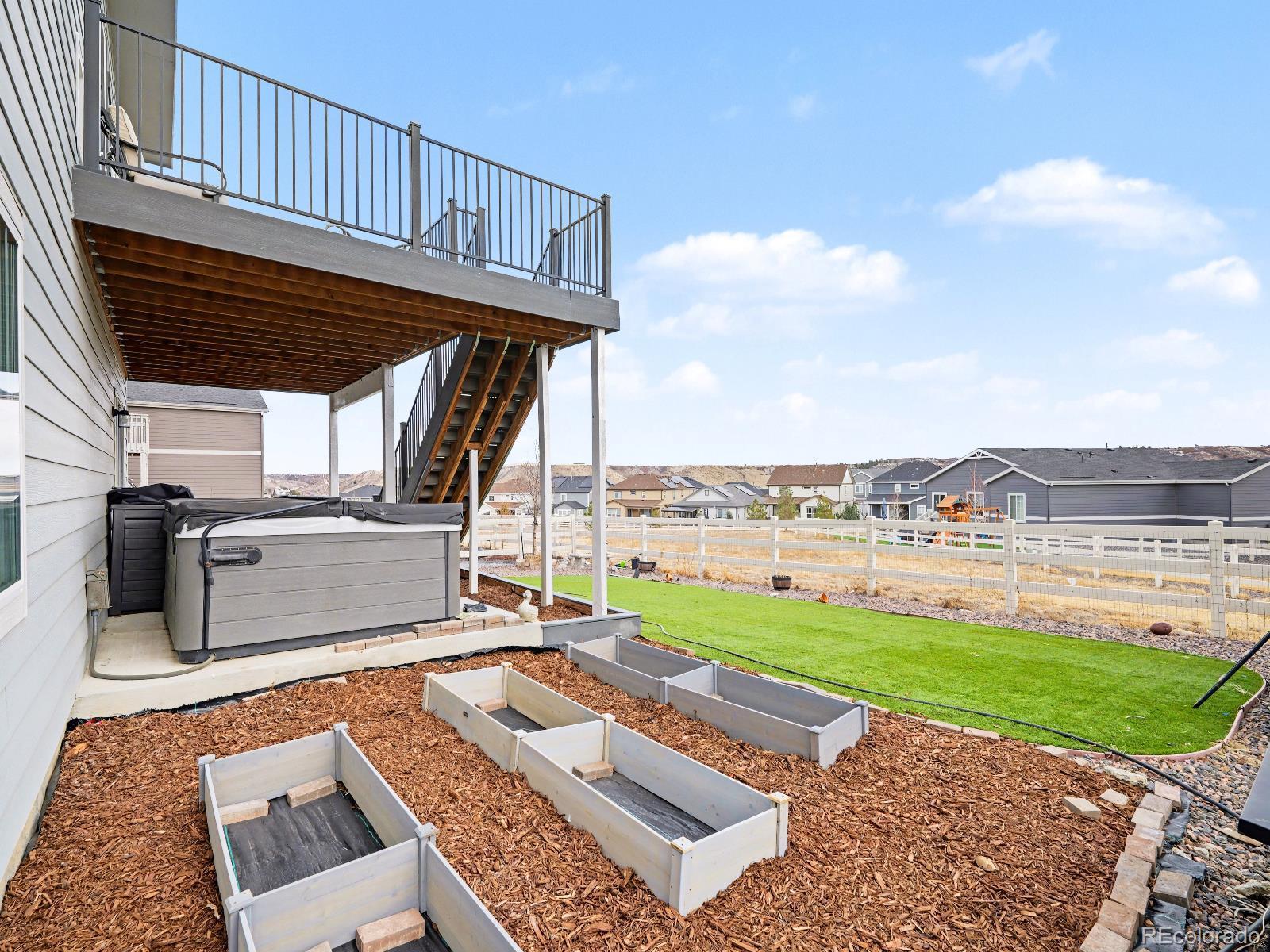 Stunning 5-Bedroom Home Backing to Greenbelt in Crystal Valley Ranch. Welcome to this beautifully maintained, nearly new two-story home built in 2022, ideally located in the sought-after Crystal Valley Ranch community of Castle Rock. Backing to a greenbelt with awesome views, this spacious 5-bedroom, 3-bathroom residence offers the perfect blend of modern design, comfort, and functionality. The open-concept main level features durable luxury vinyl plank flooring and plush carpeting. The heart of the home is the expansive kitchen, complete with center island, stainless steel appliances including a gas range, granite countertops, walk-in pantry and abundant cabinetry. The adjoining living and dining areas flow seamlessly, offering plenty of natural light and direct access to the extended deck. The main floor also includes a private office and a convenient bedroom with nearby full bathroom access, ideal for guests, multigenerational living, or a home gym. Step outside to enjoy the oversized deck with access to the lower level and a hot tub with unobstructed views of the peaceful greenbelt—your own private retreat. Upstairs, you’ll find four generously sized bedrooms, including the luxurious primary suite with a spacious walk-in closet and private en-suite bathroom. A full secondary bathroom and convenient upper-level laundry complete this level. The full, unfinished walkout basement offers incredible future potential and already includes rough-ins for a toilet and sink (already installed), providing a head start for creating additional living space, a media room, or guest suite. Residents of Crystal Valley enjoy outstanding community amenities through the homeowner's association, including a pool, fully equipped fitness center, clubhouse, outdoor basketball court, and sports field—perfect for recreation, relaxation, and social gatherings. Enjoy nearby trails, parks, and easy access to shopping, dining, and I-25.