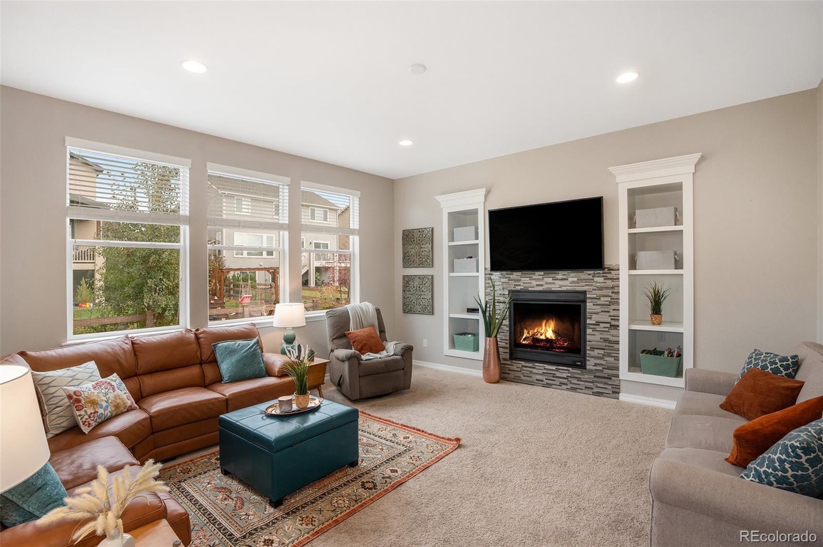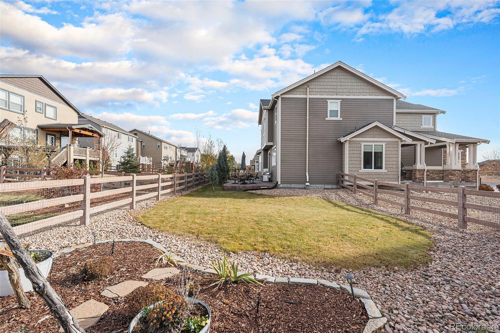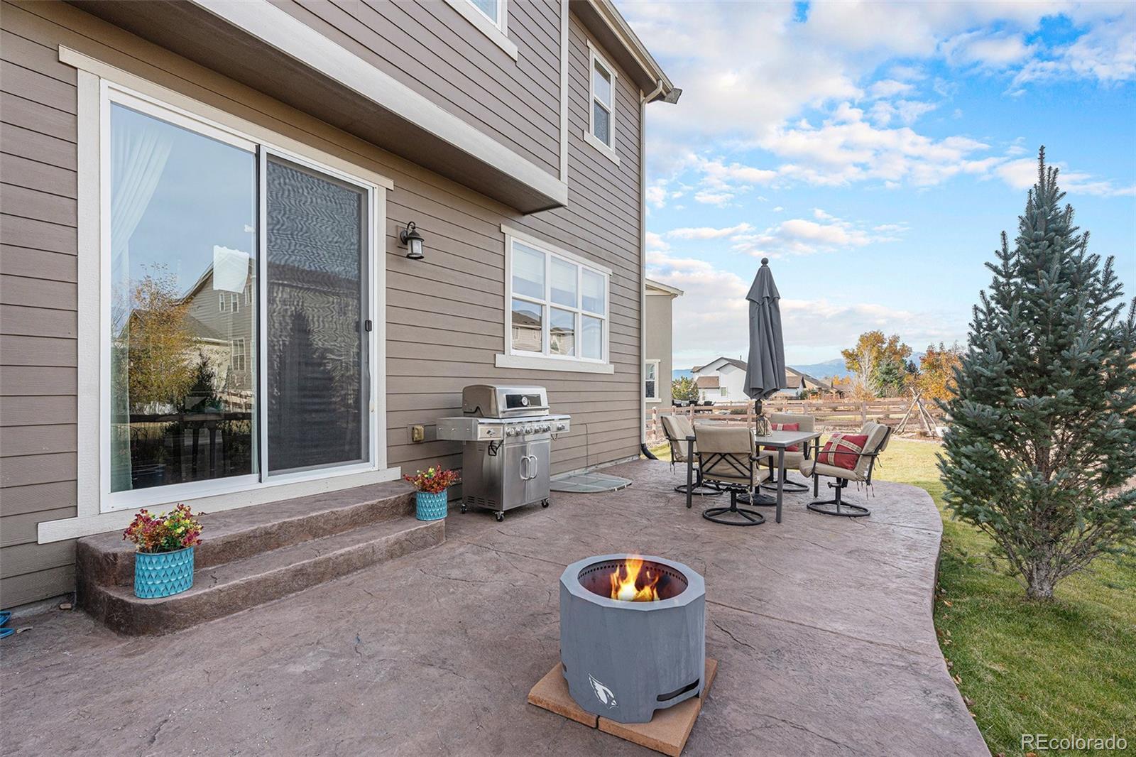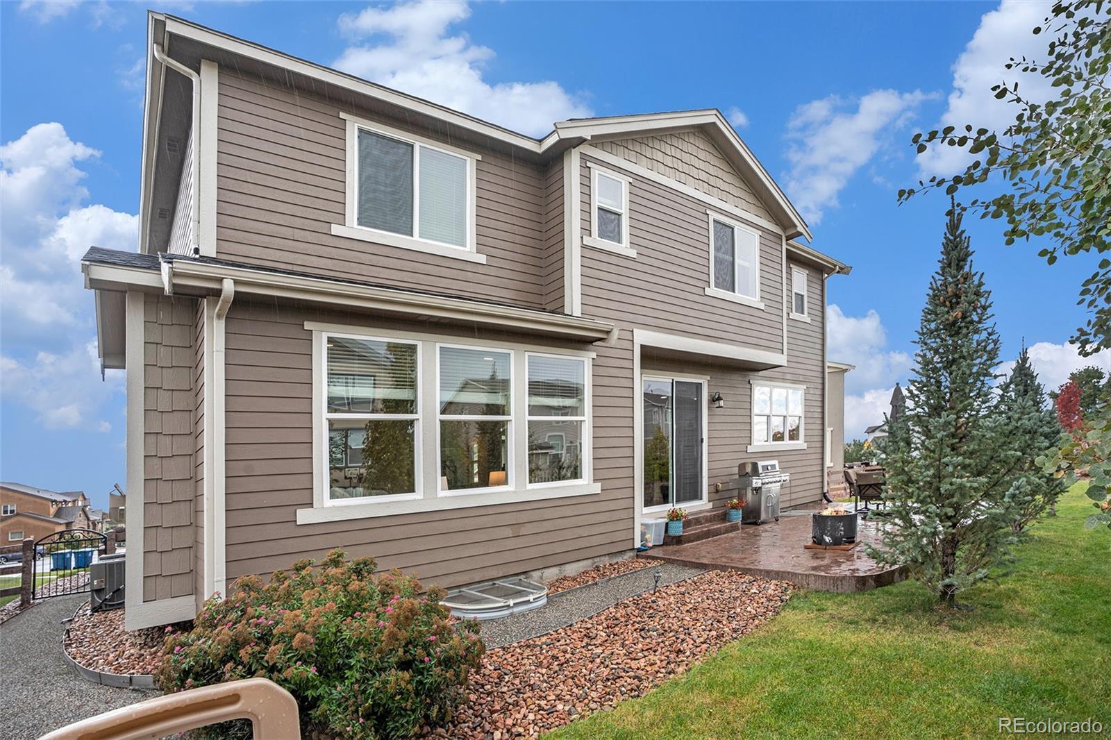 Don't miss this must-see home located on a quiet cul-de-sac in the highly sought-after Wolf Ranch community! The moment you step inside, you are greeted with a grand entry, a sweeping staircase, and high ceilings, setting the tone for elegance and spacious living. Beautiful wood floors flow through the entry, kitchen, and dining areas, welcoming you into an open-concept great room that’s ideal for entertaining. The gourmet kitchen is a chef’s dream with granite countertops, a stylish tile backsplash, a gas range, a large kitchen island, pantry, and elegant 42” cabinetry with crown molding. The kitchen and nook flow right into the great room featuring a gas fireplace with tile surround. A large functional dining room, a main-level dedicated office, plus a mudroom with built-in shelves completes the main floor. Upstairs, you’ll find a luxurious primary suite with a 5-piece bath, double vanity, contemporary tile shower, soaking tub, and walk-in closet. Three additional spacious upper-level bedrooms, one with its own private bath and walk-in closet, and two sharing a Jack and Jill bath with individual vanities. An upper-level laundry with utility sink adds extra convenience. The finished basement offers 9’ ceilings, a stylish wet bar, a huge family/rec room wired for surround sound, an additional bedroom with walk-in closet and a full bath, perfect for entertaining or multi-generational living. Outside, relax and enjoy the mountain view from the stamped concrete patio with fenced yard, a 3 car tandem garage, plus a South facing driveway which allows for snow melt! The community features a pool and clubhouse, parks, and top-rated schools, so don't miss your opportunity!