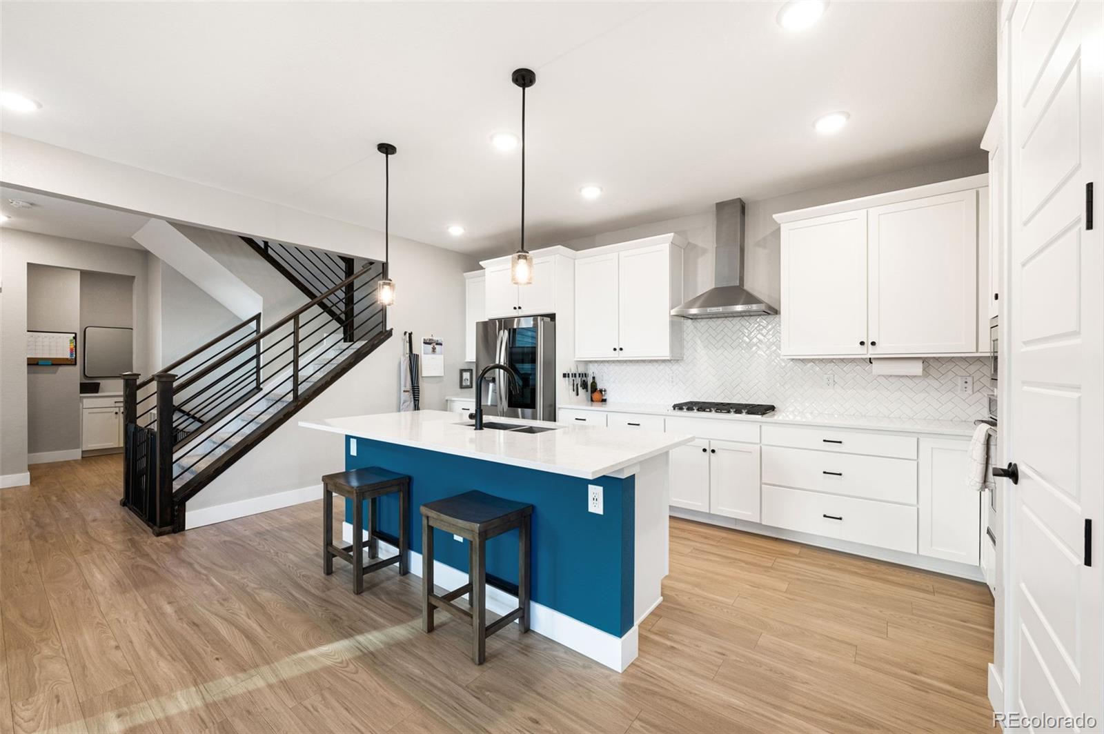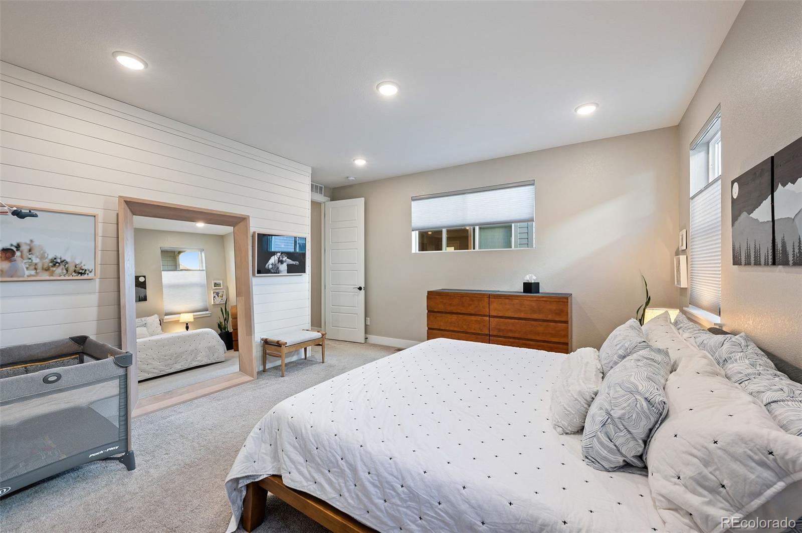 This bright and open home offers 5 true bedrooms, 4.5 baths, and two additional flexible living spaces, thoughtfully upgraded and well maintained. The main floor features a spacious primary suite with an ensuite bath offering double sinks, generous counter and storage space, a large walk-in shower, and an oversized walk-in closet with abundant shelving and hanging space. The bright kitchen is ideal for entertaining, with a huge center island, ample counter and cabinet space, pantry, KitchenAid appliances, gas range, and LG refrigerator, flowing seamlessly into the dining area and outdoor space. Main-level conveniences include a mudroom off the garage, a separate laundry room with Whirlpool washer and dryer and built-in storage, and a functional front entry with bench and additional closet space. Upstairs, a large loft offers flexible use as a playroom, media room, or home office, along with two bedrooms with walk-in closets and two full baths, including one ensuite. The finished basement adds even more versatility with a spacious open area, two additional bedrooms (one currently used as a workout room), and a bathroom with a walk-in shower. Upgrades include whole-house water filtration and softener and whole-house humidifier (~$10k). Added soundproofing insulation creates a notably quiet home that lives like a detached residence. This Brookfield Homes Villa 5 floor plan offers mountain views from the front porch, nearby parks and playgrounds, pickleball courts, Splash Landing Pool, and direct access to trails and wildlife at the Rocky Mountain Arsenal Wildlife Refuge. Walk to Pearl Market, with the Shops at Northfield a short drive away and easy access to I-70 for a quick commute to DIA, Anschutz Medical Campus, and Central Park. With abundant storage, five true bedrooms, additional flexible living spaces, and an ideal blend of neighborhood living and access to nature, this home offers exceptional versatility and everyday comfort.