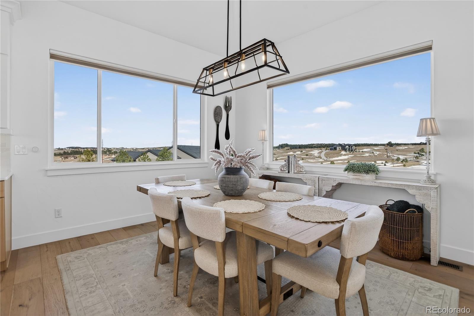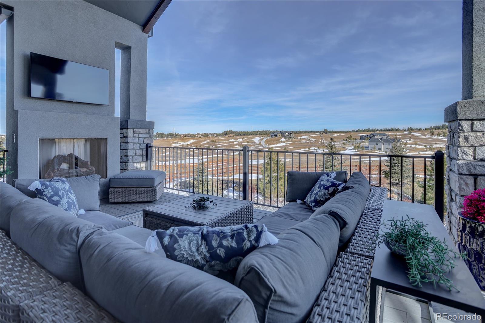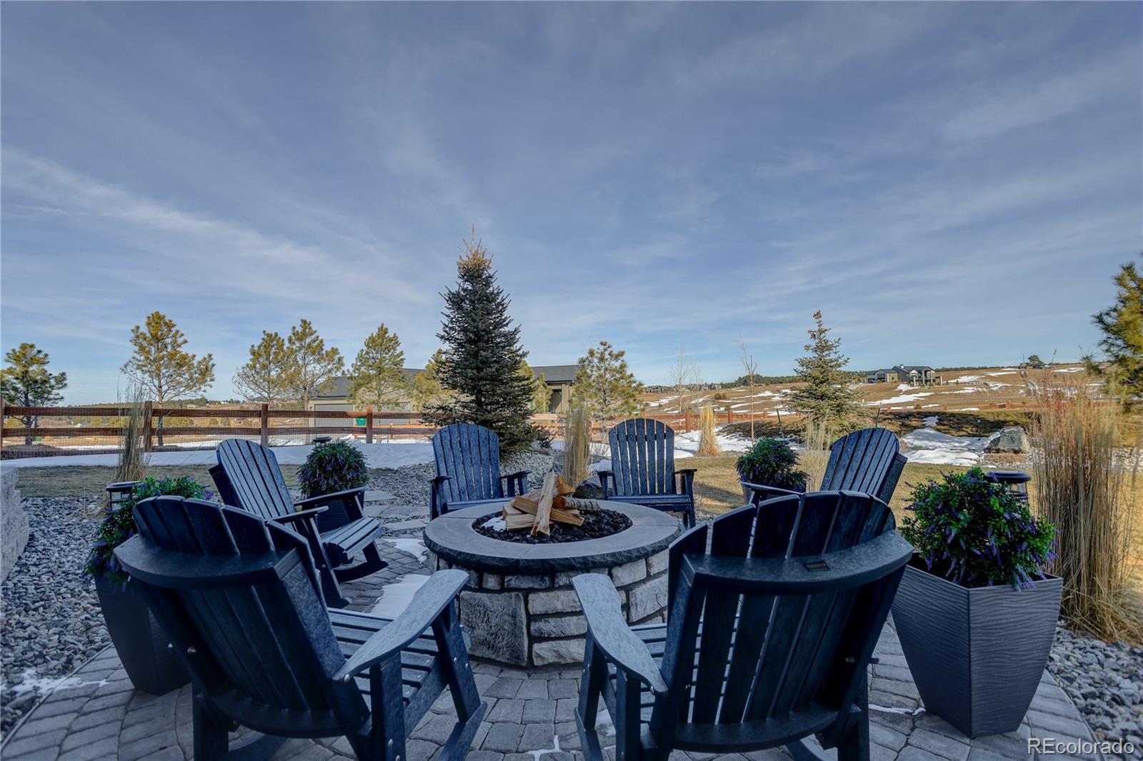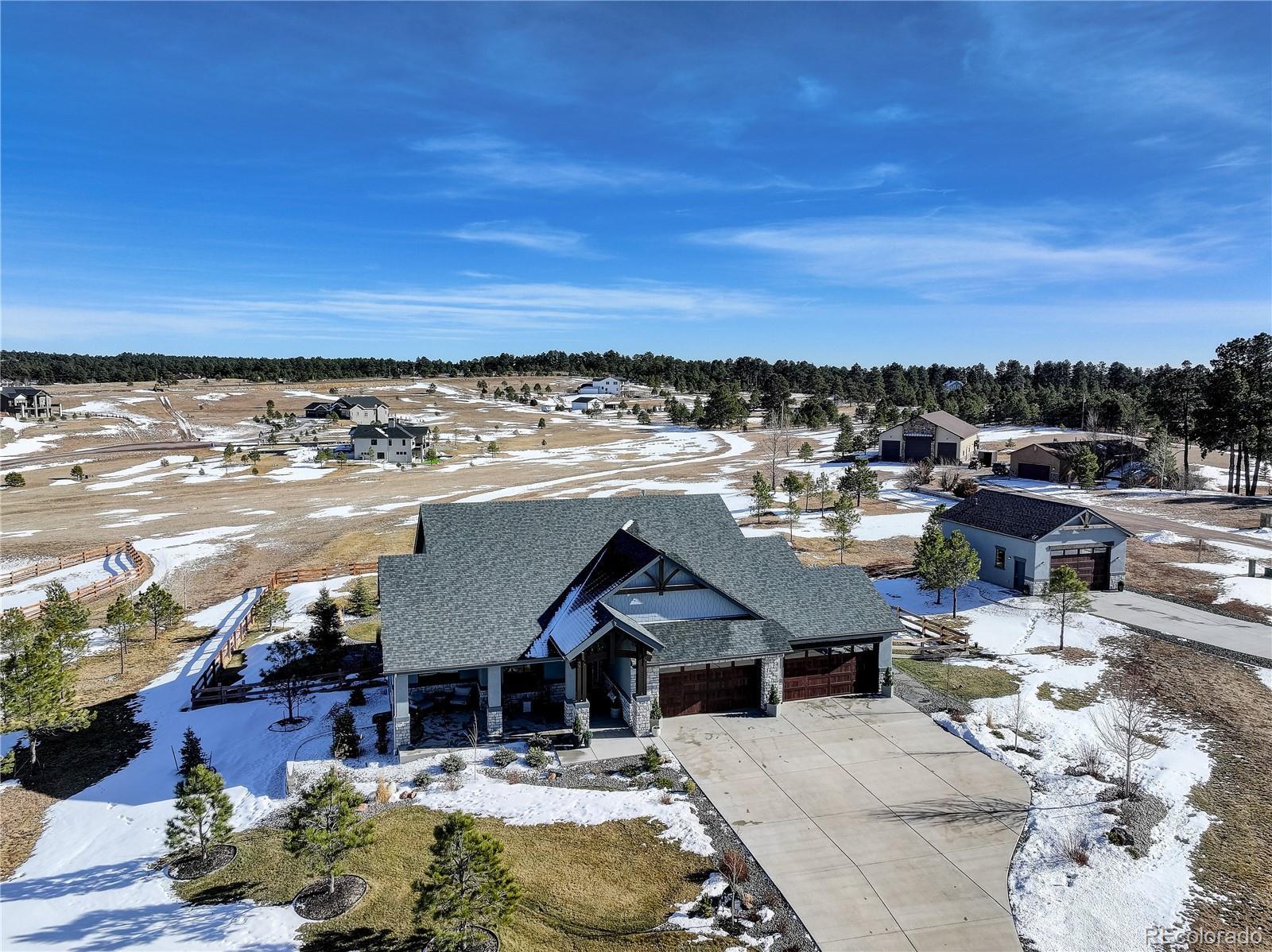 Escape the frenzied pace of city life in this fabulous 5BR/5BA custom ranch home located in Rollin Ridge Estates within the highly coveted Lewis-Palmer District 38. Completed in 2023, it offers exceptional design, superior quality, premium finishes and smart-home technology throughout. Set on a 2.5 acre tranquil cul-de-sac lot, it has both 4-car attached & 4-car detached heated, insulated, fully finished garages! Step through the welcoming covered front porch and foyer into the modern open floor plan and spacious light-filled great room with wide-plank hardwoods, soaring vaulted/beamed ceilings and a grand stone gas fireplace (1 of 4 in the home)! The gourmet eat-in kitchen features a massive entertaining island, quartz countertops, Jennair stainless steel appliances, farmhouse sink, spacious walk-in pantry and custom soft-close cabinetry. The luxurious main-floor owner’s retreat has a high coved/beamed ceiling, fireplace, and private deck access. The spa-inspired ensuite bath has radiant heated floors, double vanities, an enlarged glass shower, a soaking tub and an expansive walk-in closet with access to the utility/mud room. A second spacious guest bedroom with ensuite bath & walk-in closet, an office/guest bedroom, a ½ bath, mud room & well-appointed laundry complete the main level. Downstairs, the fully finished walkout basement boasts high ceilings, a large rec room with fireplace, wet bar, two additional bedrooms with ensuite baths & huge walk-in closets, and a third non-conforming bedroom or flex space. The large deck and lower-level patio have open & covered entertaining areas and include a fireplace, TV, 8-person hot tub, and gas fire pit all overlooking an extensively landscaped treed irrigated yard with beautiful stone water feature, split-rail fence, and invisible fencing for your pets. Experience the perfect blend of comfort and elegance in this exceptional home offering a rare balance of close-in country living with easy access to urban conveniences.