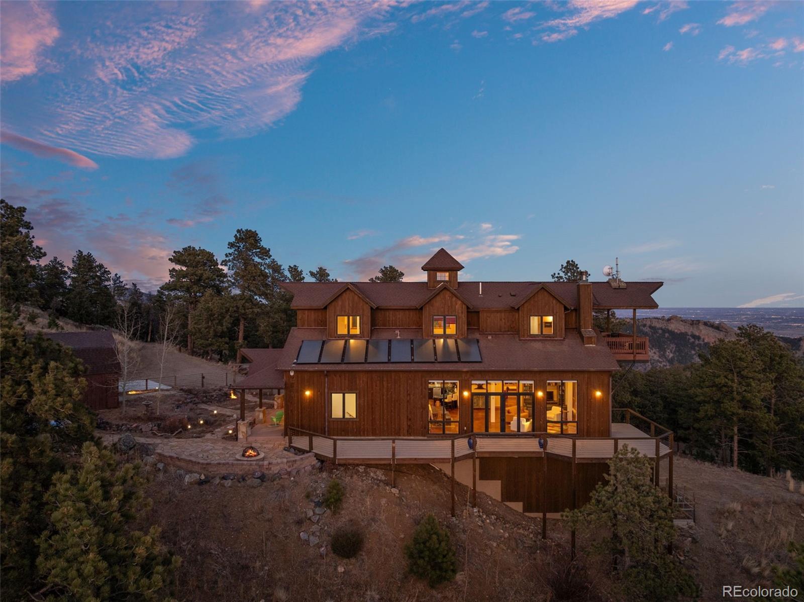 Perched on 35 private acres with true “top-of-the-world” views, this architecturally re-imagined residence delivers the ultimate wow factor — a rare blend of serenity, space and glittering city lights views. All conveniently located in a luxury enclave of just 12 homes with surprising quick access 18 paved minutes from Golden. Originally built as a luxury barn and thoughtfully transformed into a modern, light-filled home, the design celebrates openness and airiness at every turn. The dramatic lofted great room seems to float above the landscape, walls of windows framing sunrises, sunsets, city lights and mountain views that feel almost within reach. Radiant in-floor heat keeps things cozy, while a kitchen designed for gathering makes entertaining effortless. The spacious primary suite includes its own kitchenette/office and wonderful balcony - sleep under the stars! A media room, huge garage, and additional detached garage provide flexibility for hobbies, cars, gear, and guests. Step outside and the experience becomes something special. Expansive decks invite unforgettable nights beneath the Milky Way, hot-tub soaks while deer wander past, and evening sunsets with panoramic views. Up the hill behind the home, a graded path leads to a private RV or camping area complete with electric hookup — your own personal overlook for stargazing nights.The south-facing home and driveway naturally help with snow melt, and you have two garages and plentiful parking and storage. Excellent free internet means working from home is easy… though a quick run to Golden or a nearby café is never far. White Ranch Open Space — with over 20 miles of trails and Golden Gate State Park— are just 5 minutes away. Horses welcome too and well allows for. It feels like a private mountain sanctuary — because it is — yet everyday life remains wonderfully convenient. A rare opportunity to live in your own special paradise! For video, floor plans, 3D tour go to www.27659MistyRoad.com