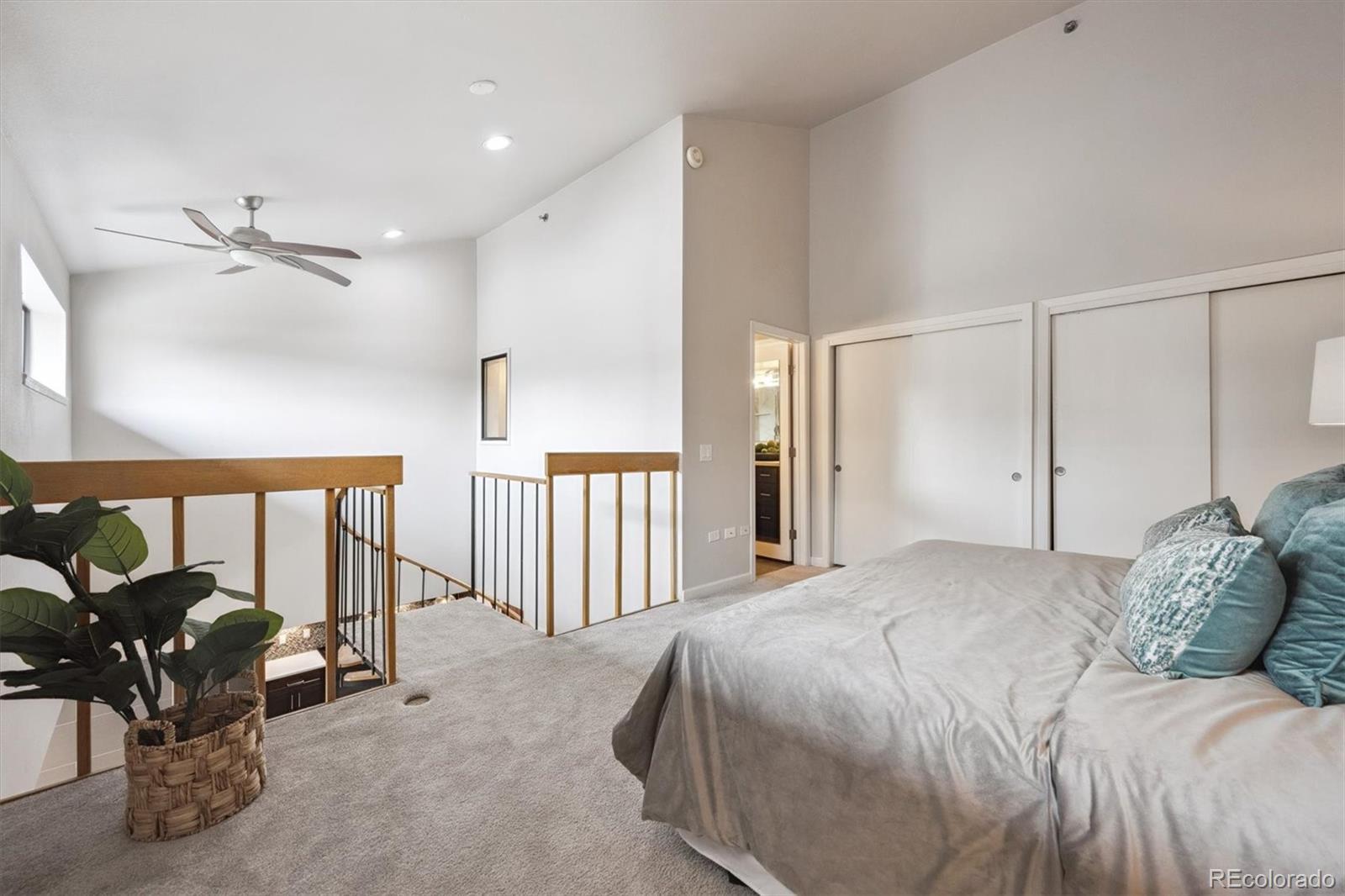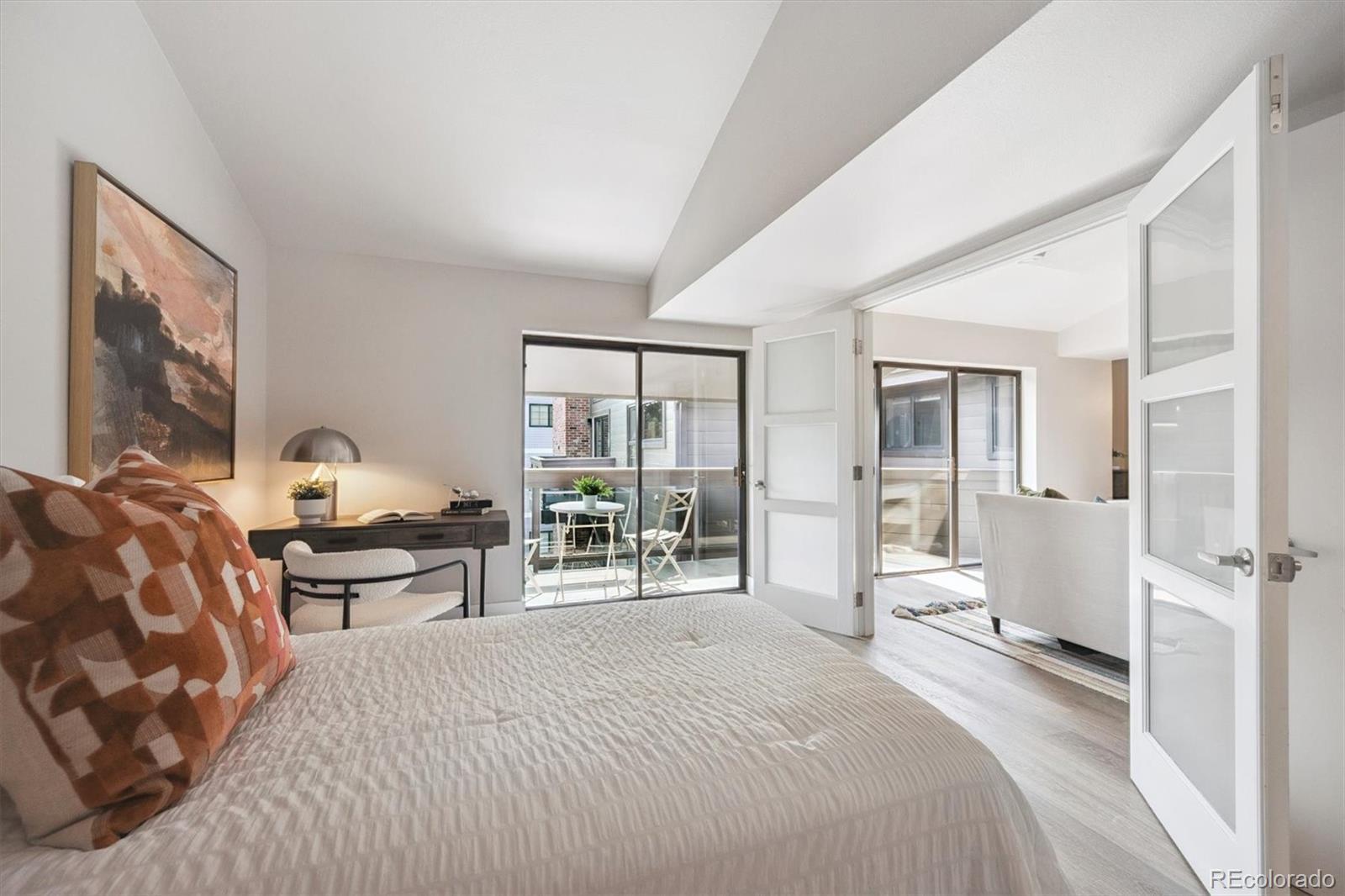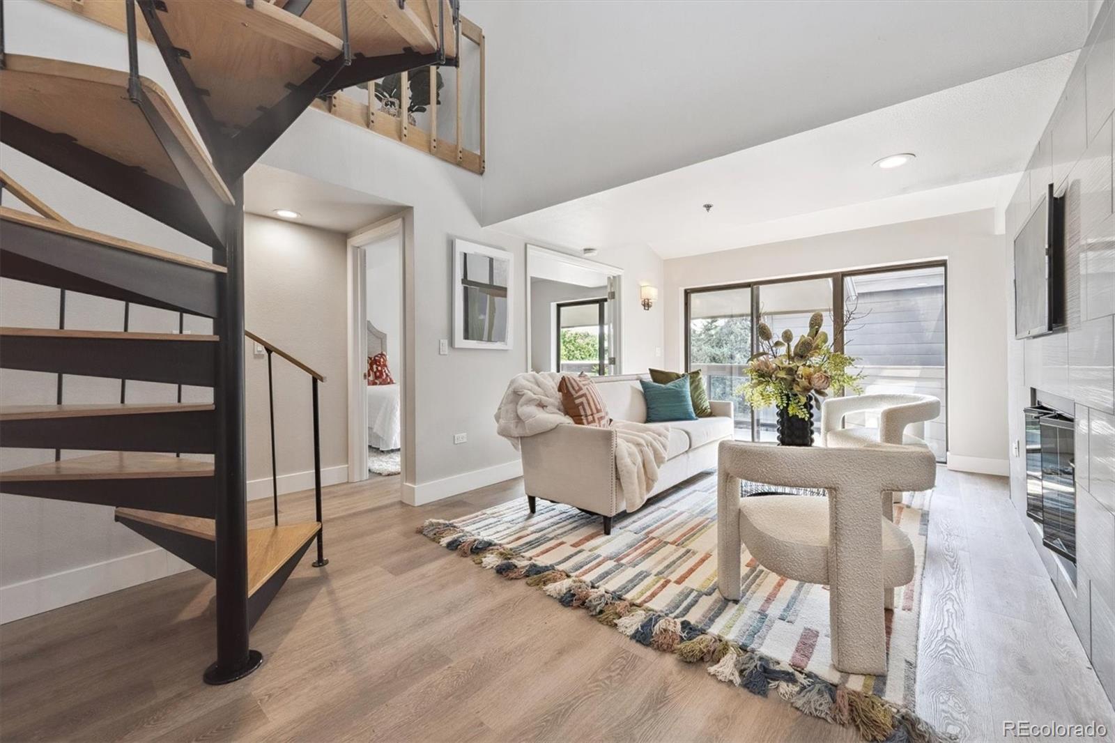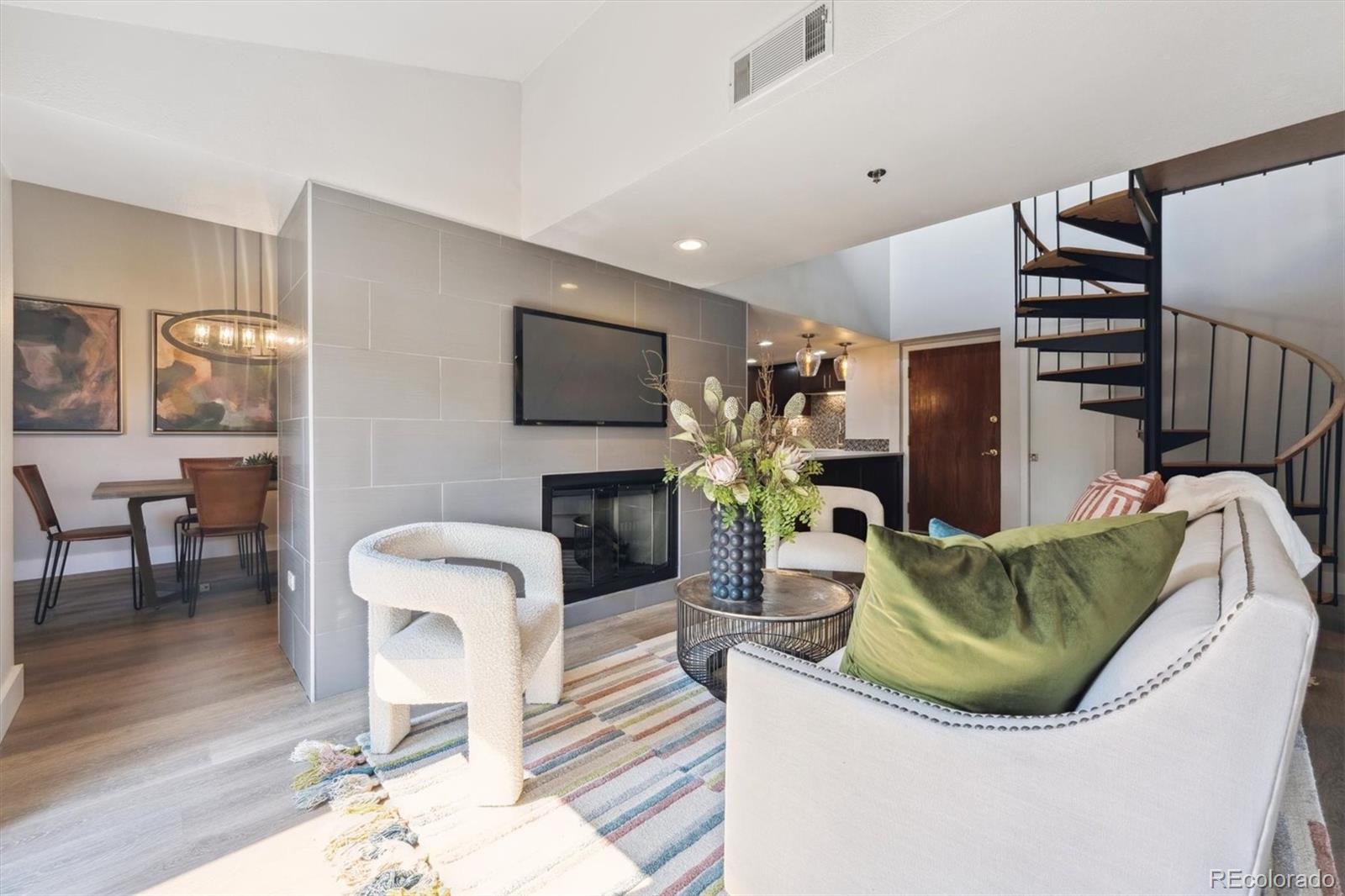 This is loft-style living at it's finest in one of Denver’s most sought-after neighborhoods, Cherry Creek North. As the largest unit in the building, 409 features thoughtful, modern upgrades throughout. LVP floors line the main level, anchored by a striking (easy-on) gas fireplace that brings warmth and elegance to the living area. The living room boasts large sliding glass doors that open to a private balcony and the dedicated dining area offers plenty of space for a formal dinner or an intimate meal. The main-floor bedroom features sliding glass doors for additional patio access and beautiful natural light. With elegant French doors, it functions perfectly as a bedroom, office, or both. The kitchen is updated with Silestone countertops, custom cabinetry, a tile backsplash, and sleek lighting. The main-floor bathroom is unusually spacious for a ¾ bath, providing both comfort and convenience for guests. Upstairs, the lofted primary suite is a serene, expansive retreat with ample closet space and a beautifully renovated en suite bathroom featuring a dual vanity and oversized walk-in shower enclosed in plate glass. This is a commuter-friendly location, both walkable and well-connected to public transit. It is situated on Detroit Street which is a quiet, charming corner of vibrant Cherry Creek North featuring; 300+ boutiques, 75+ cafés and restaurants, 50+ spas and salons, plus upscale hotels and everyday conveniences. From beloved summer farmers markets to festive holiday events, the neighborhood buzz is unmatched, making unit 409 is the perfect space to entertain OR rest and recharge. *BONUS* with two DEEDED parking spots in an attached underground garage, you will never have to compete to find a spot.