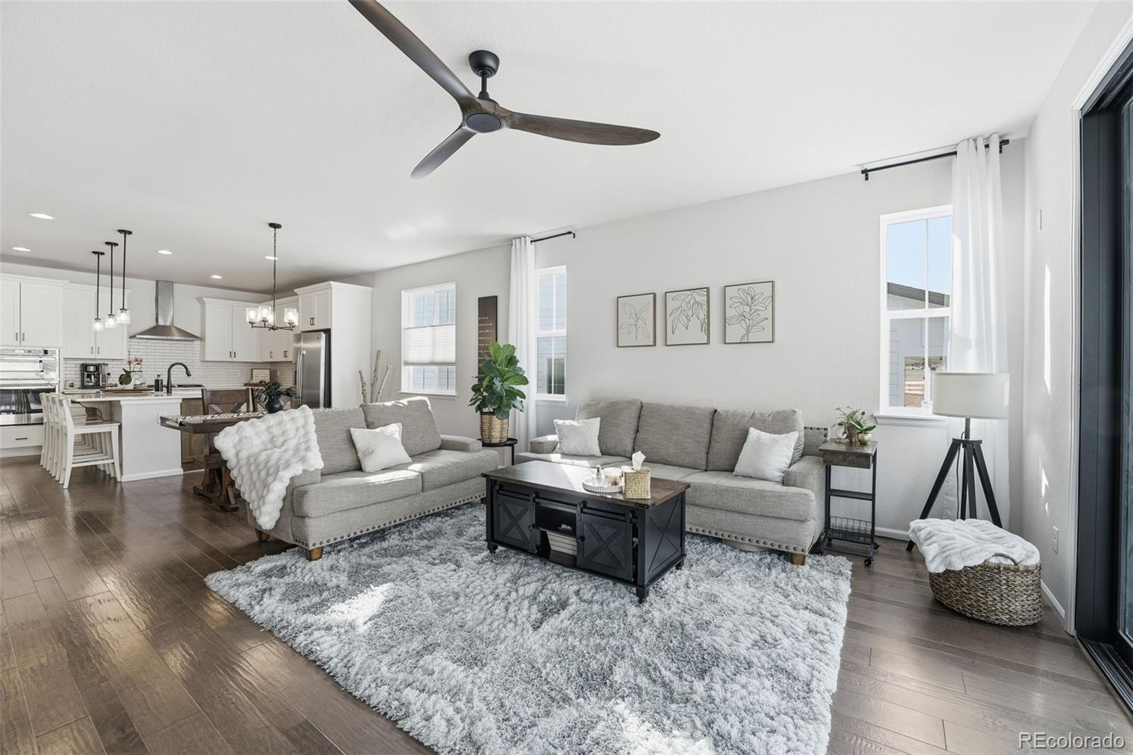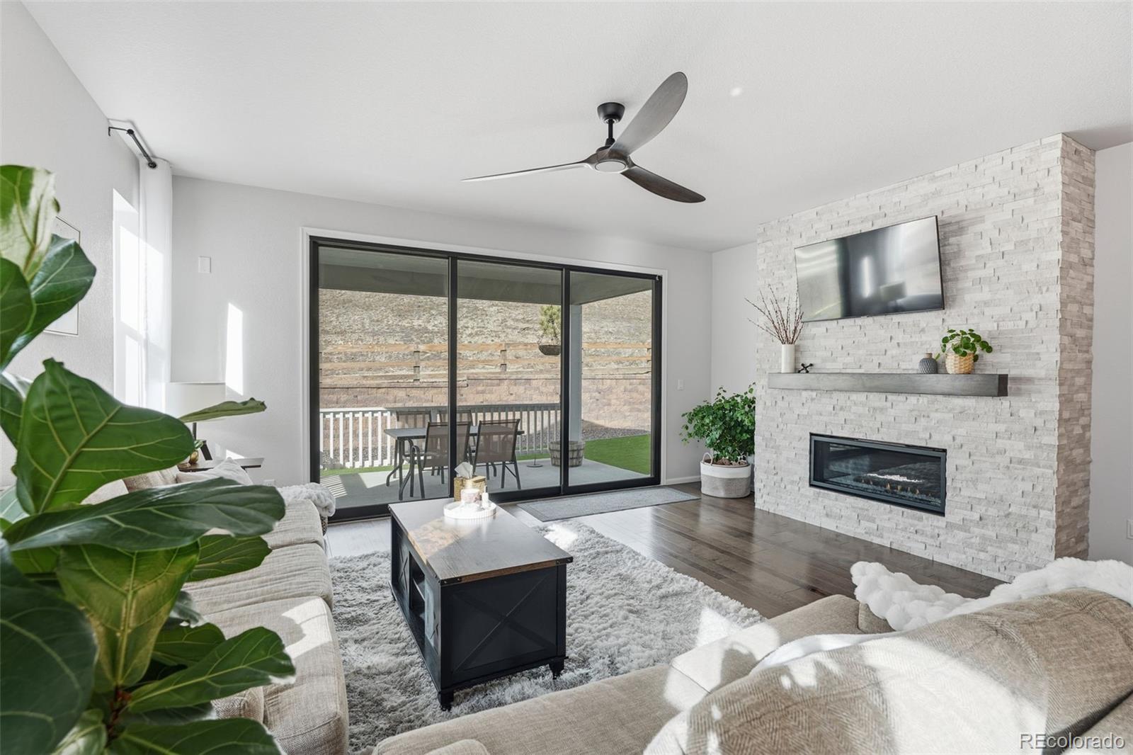 Discover this beautifully designed 5-bedroom, 3-bath ranch home offering true open-concept main floor living in The Meadows — one of Castle Rock, Colorado’s most desirable master-planned communities. Built in 2022, this nearly new home showcases upscale finishes in a peaceful setting backing directly to Ridgeline Open Space and its expansive trail system. The luxurious primary suite is exceptional. The gourmet kitchen shines with white quartz countertops featuring natural veining, GE Profile stainless steel appliances including a gas range, double ovens, and a farmhouse sink. The oversized island is ideal for dining and entertaining. Wide-plank, rough-hewn oak floors create striking contrast throughout the great room, seamlessly connecting the kitchen, dining, and living areas. Dramatic floor-to-ceiling stonework surrounds the contemporary gas fireplace, while a wall of sliding glass doors floods the space with natural light and opens to the covered patio overlooking open space. Located on a cul-de-sac street, the Professionally installed artificial turf provides a beautiful, low-maintenance backyard year-round. Eight-foot doors enhance the scale and highlight the home’s soaring ceilings, adding to the open, airy feel. The finished full basement offers exceptional flexibility with a spacious family room perfect for media or game space, two additional bedrooms, a ¾ bath, and a large unfinished storage room. Residents of The Meadows enjoy outstanding amenities including The Grange and Taft House clubhouses and pools, playgrounds, more than 1,000 acres of preserved open space, and over 20 miles of neighborhood trails. Ideally located in the newer south section of The Meadows with direct access to Plum Creek Parkway, this home is just minutes from The Miller Activity Complex, the Castle Rock Incline, the shops and dining of Downtown Castle Rock, and the Outlets at Castle Rock. Located in the highly regarded Douglas County School District.